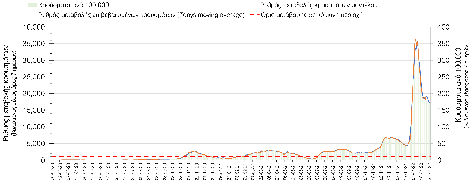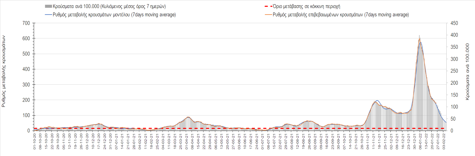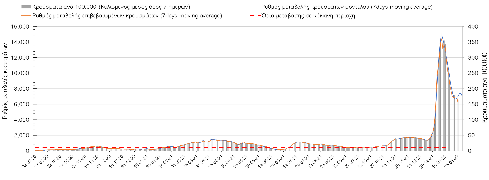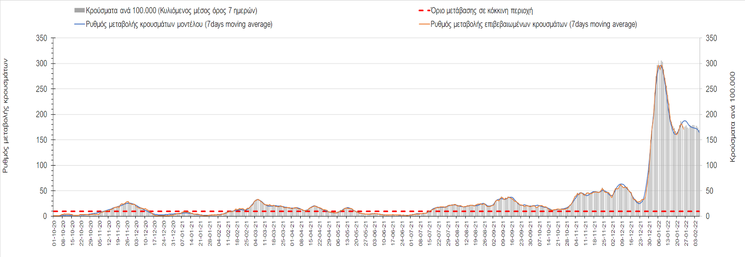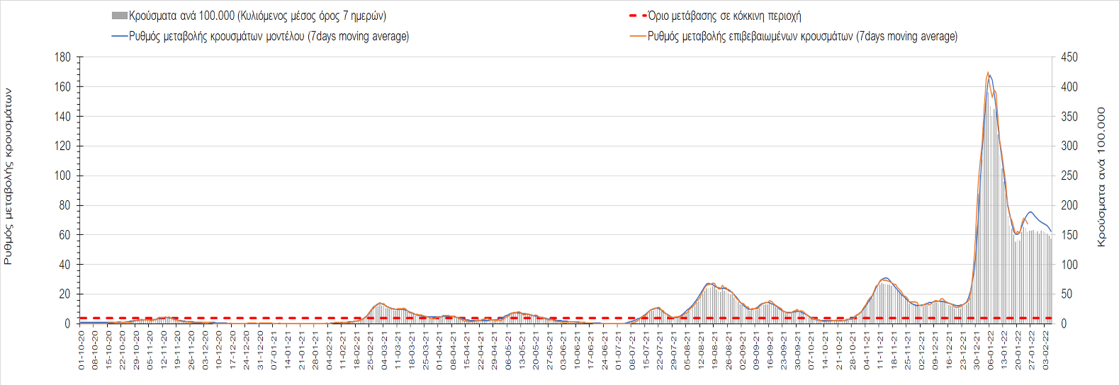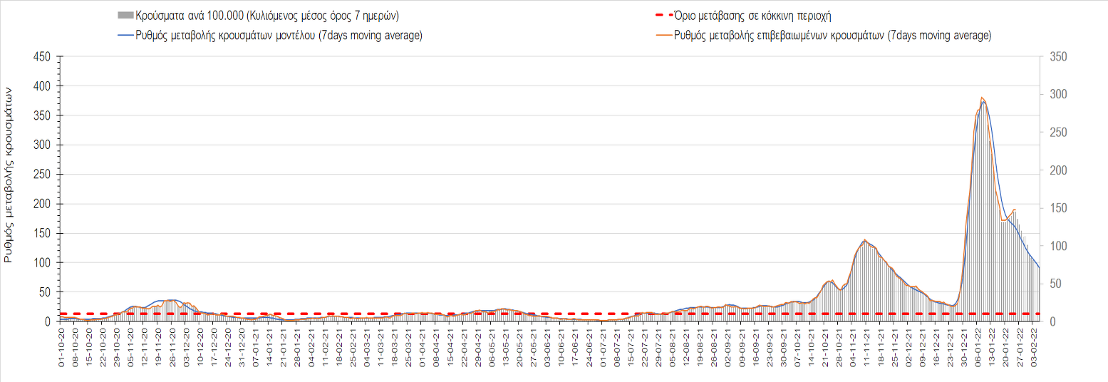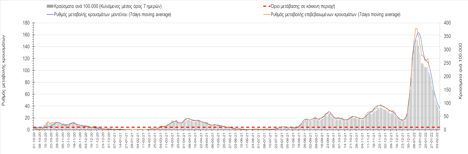 Η ανοδική τάση που είχε διαμορφωθεί από τις 23/12 και που οφείλεται στην μετάλλαξη Ο, έχει περιέλθει σε πτωτική αλλά με σημαντική επιβράδυνση, και αντικατοπτρίζεται στον ημερήσιο αριθμό των κρουσμάτων (κυλιόμενος μέσος όρος 7 ημερών), ο οποίος παραμένει πάνω από τις 18.000 (18.058), και εδώ και μέρες όχι μόνο δεν εμφανίζει ουσιαστική πτώση, ενώ η σημερινή πτώση είναι αποτέλεσμα της ελλιπούς καταγραφής λόγω της κακοκαιρίας που πλήττει την Αττική και άλλες περιοχές της Στερεάς Ελλάδας.Για να επανέλθει η ταχεία αποκλιμάκωση της πανδημίας, πέρα από την εφαρμογή των μέτρων (σε συνδυασμό με την σημαντική συνειδητοποίηση εκ μέρους του πληθυσμού ότι χρειάζεται προσοχή και σύνεση για την αντιμετώπιση της διασποράς της παραλλαγής Ο), θα πρέπει να στοχεύσουμε στη διατήρηση και την επέκταση της επίκτητης ανοσίας του πληθυσμού, αλλά και στον πολύ μεγάλο αριθμό των τεστ συνολικά (μοριακά, rapid και self-test) που πραγματοποιούνται καθημερινά, των οποίων ο αριθμός έχει φθάσει σε ημερήσια βάση τις 700.000. Αυτά σε συνδυασμό με τη φυσική ανοσία του πληθυσμού μετά από νόσηση, θα συντελέσουν στην συστηματική αποκλιμάκωση της πανδημίας. Αντίθετα, με τον υπάρχοντα ρυθμό εμβολιασμού αναμνηστικών δόσεων, θα υπάρχουν συνεχείς διακυμάνσεις της πορείας αποκλιμάκωσης όλο το Φεβρουάριο.