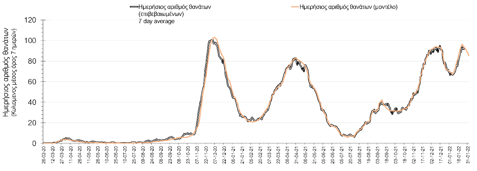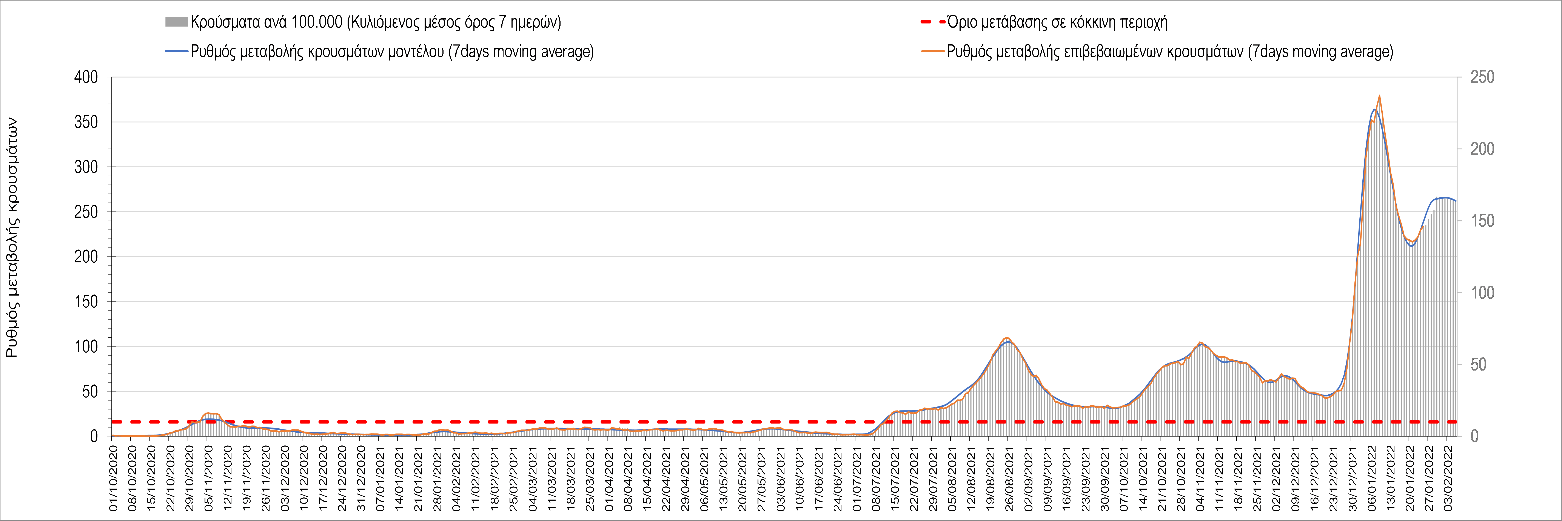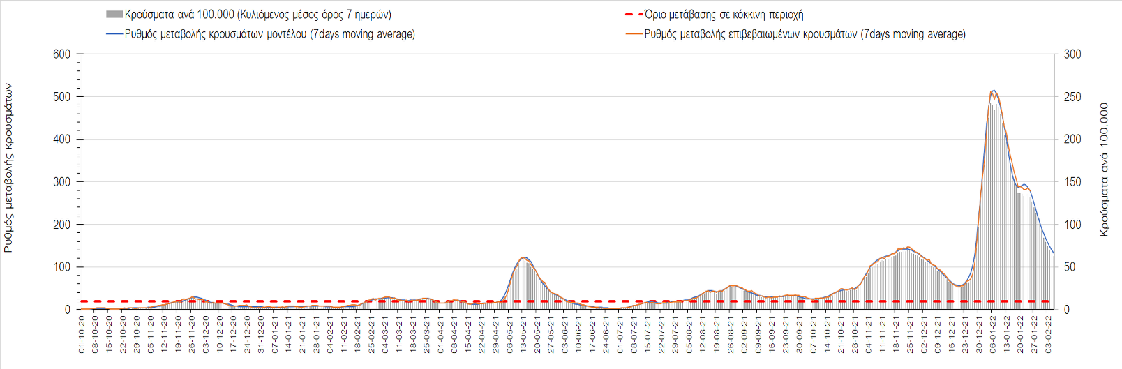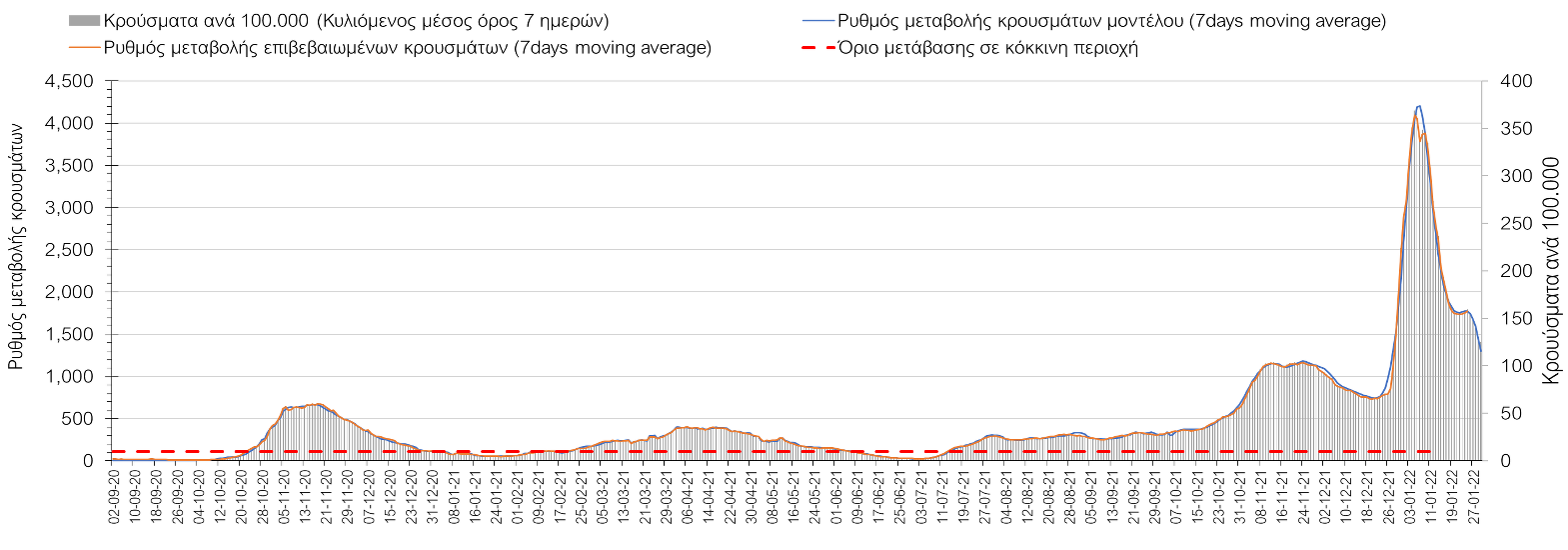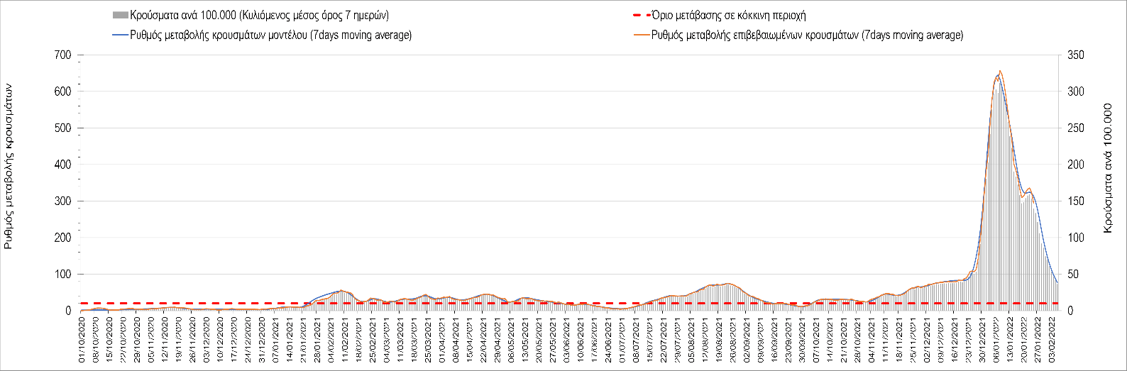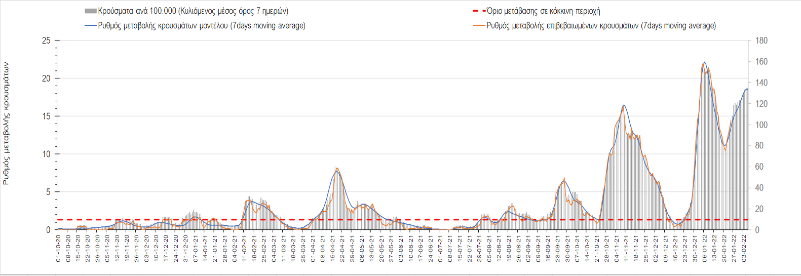 Η ανοδική τάση που είχε διαμορφωθεί από τις 23/12 και που οφείλεται στην μετάλλαξη Ο, έχει περιέλθει σε πτωτική αλλά με σημαντική επιβράδυνση, και αντικατοπτρίζεται στον ημερήσιο αριθμό των κρουσμάτων (κυλιόμενος μέσος όρος 7 ημερών), ο οποίος παραμένει πάνω από τις 18.000 (18.058), και εδώ και μέρες όχι μόνο δεν εμφανίζει ουσιαστική πτώση, ενώ η σημερινή πτώση είναι αποτέλεσμα της ελλιπούς καταγραφής λόγω της κακοκαιρίας που πλήττει την Αττική και άλλες περιοχές της Στερεάς Ελλάδας.Για να επανέλθει η ταχεία αποκλιμάκωση της πανδημίας, πέρα από την εφαρμογή των μέτρων (σε συνδυασμό με την σημαντική συνειδητοποίηση εκ μέρους του πληθυσμού ότι χρειάζεται προσοχή και σύνεση για την αντιμετώπιση της διασποράς της παραλλαγής Ο), θα πρέπει να στοχεύσουμε στη διατήρηση και την επέκταση της επίκτητης ανοσίας του πληθυσμού, αλλά και στον πολύ μεγάλο αριθμό των τεστ συνολικά (μοριακά, rapid και self-test) που πραγματοποιούνται καθημερινά, των οποίων ο αριθμός έχει φθάσει σε ημερήσια βάση τις 700.000. Αυτά σε συνδυασμό με τη φυσική ανοσία του πληθυσμού μετά από νόσηση, θα συντελέσουν στην συστηματική αποκλιμάκωση της πανδημίας. Αντίθετα, με τον υπάρχοντα ρυθμό εμβολιασμού αναμνηστικών δόσεων, θα υπάρχουν συνεχείς διακυμάνσεις της πορείας αποκλιμάκωσης όλο το Φεβρουάριο.