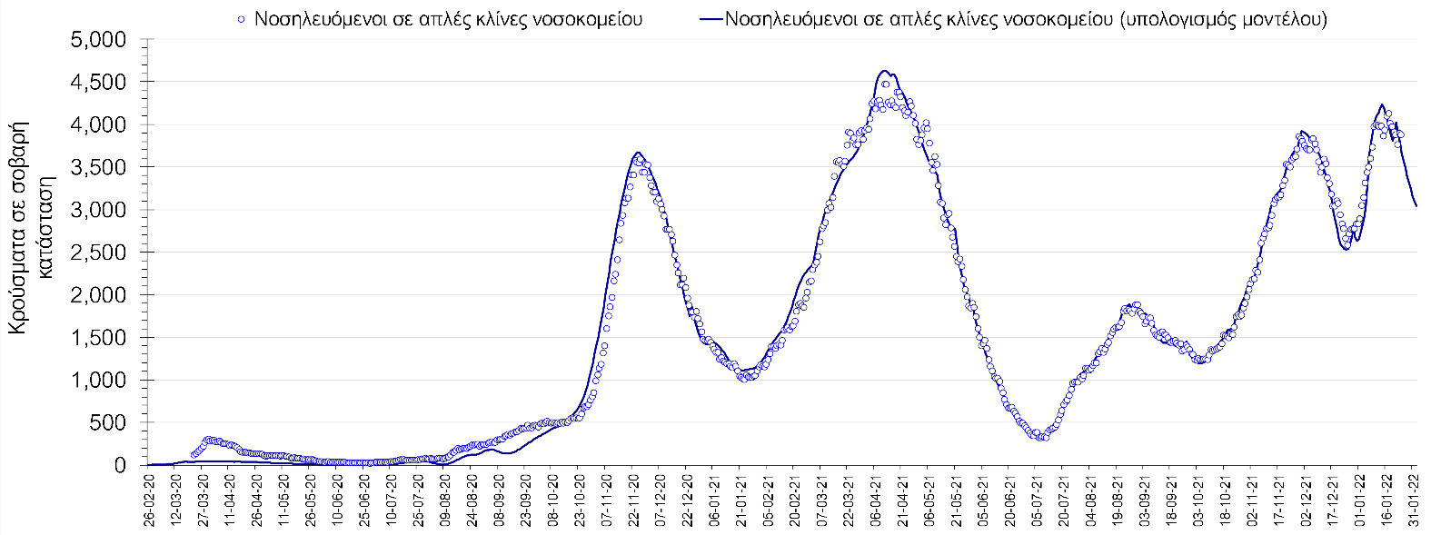 Σχήμα 2. Αριθμός κρουσμάτων σε σοβαρή κατάσταση (νοσηλευόμενοι σε απλές κλίνες) σύμφωνα με τα στοιχεία του ΕΟΔΥ και τις προβλέψεις της υπολογιστικής πλατφόρμας CORE.