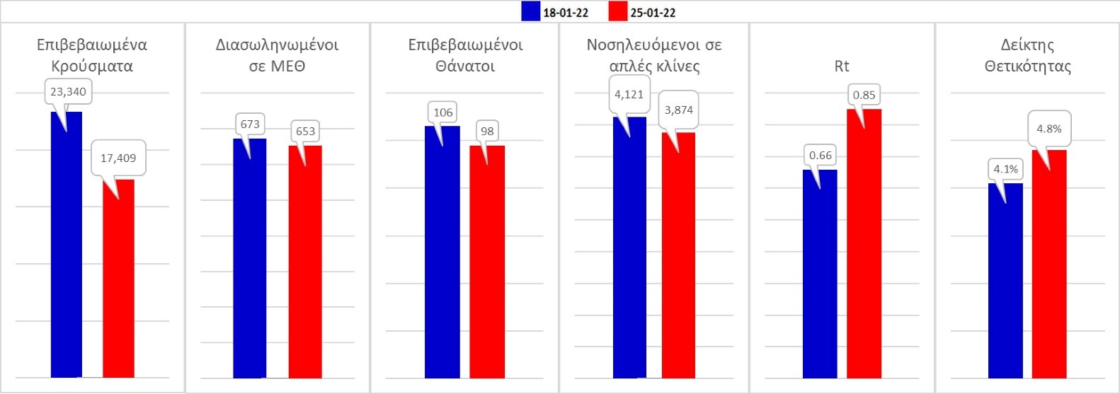 Σχήμα 59. Συγκριτικά αποτελέσματα της επιδημιολογικής εικόνας της σημερινής Τρίτης(25/01/2022) σε σχέση με το προηγούμενο (18/01/2022)