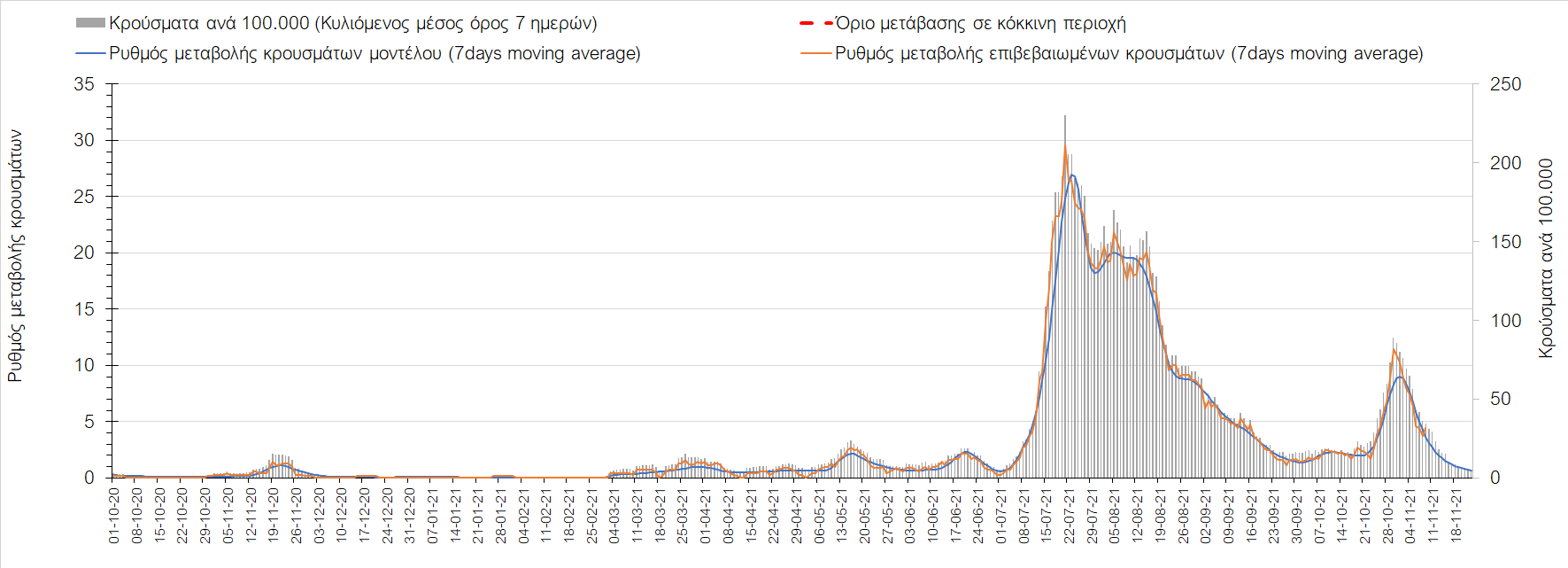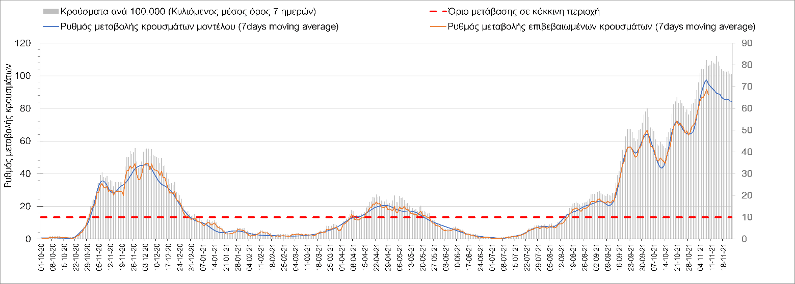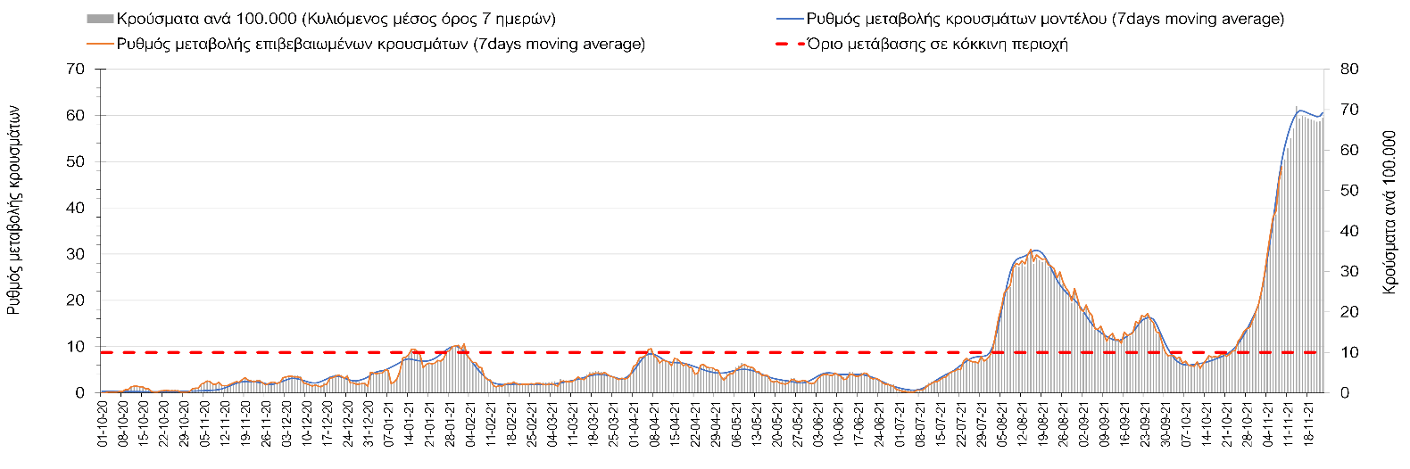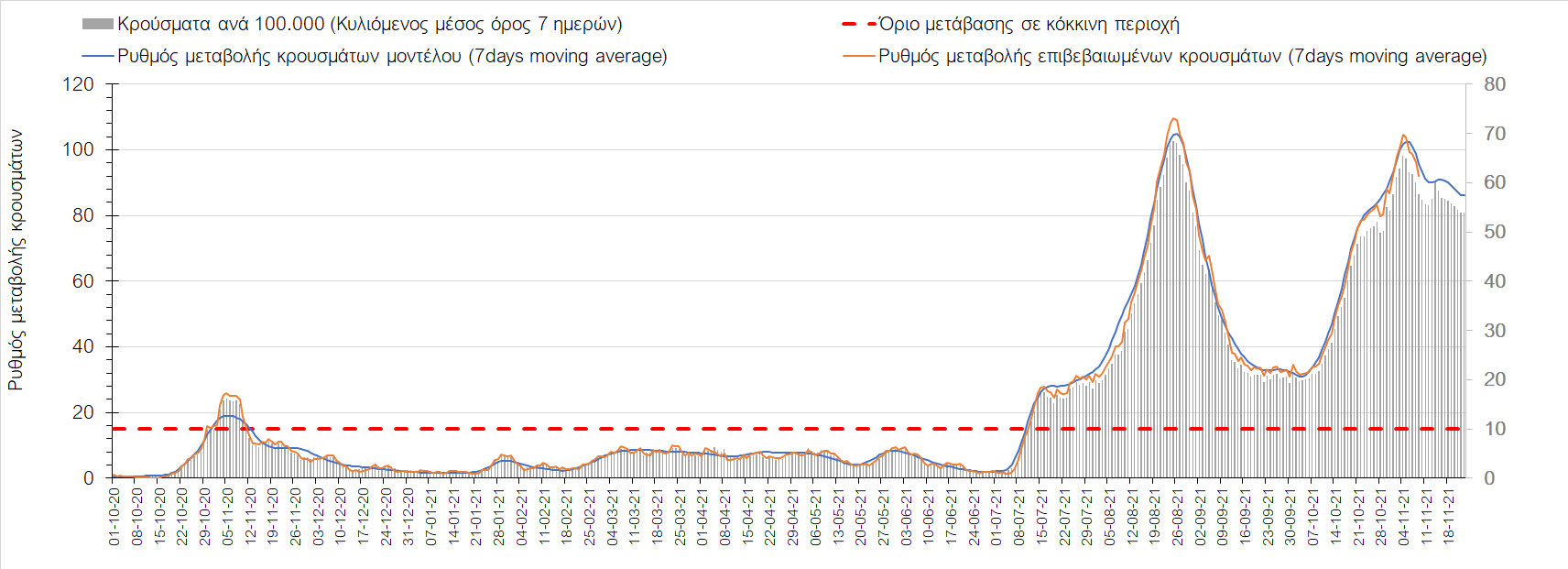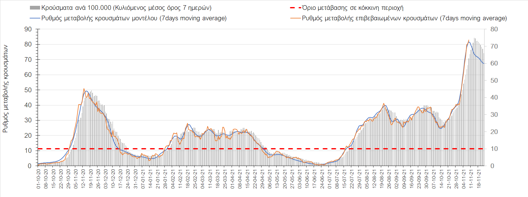 Η αποτύπωση των τάσεων στις επιμέρους περιοχές, παρουσιάζεται στο Σχήμα 61, όπου παρουσιάζεται ο ρυθμός μεταβολής των νέων κρουσμάτων ανά 100.000 κατοίκους (κυλιόμενος μέσος όρος 7 ημερών) των επιμέρους περιοχών. Θετικές τιμές του ρυθμού μεταβολής υποδηλώνουν άνοδο, ενώ αρνητικές τιμές υποδηλώνουν πτωτική πορεία. Το σχήμα αυτό είναι ιδιαίτερα κατατοπιστικό, γιατί οι τιμές που παρουσιάζονται είναι κανονικοποιημένες ως προς τον πληθυσμό, και η σύγκριση των τάσεων ανάμεσα στις επιμέρους περιοχές είναι άμεση. Με βάση και τα σημερινά δεδομένα, πολύ λίγες περιοχές της χώρα παρουσιάζουν αποκλιμάκωση της πανδημίας, πέρα από κάποιες που είναι είτε σε σταθεροποίηση (Καστοριά), είτε διανύουν διακυμάνσεις από μέρα σε μέρα (Γρεβενά).
