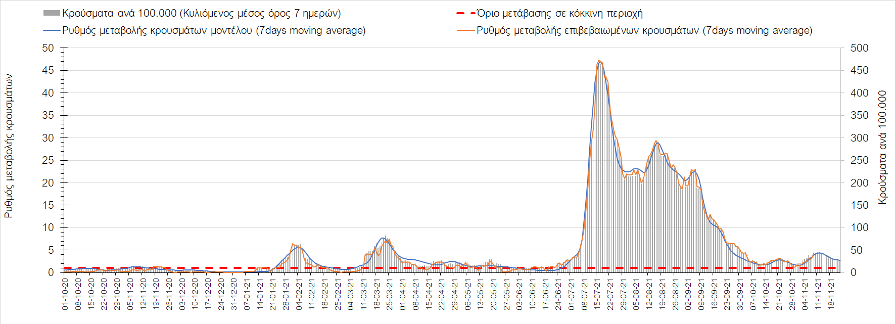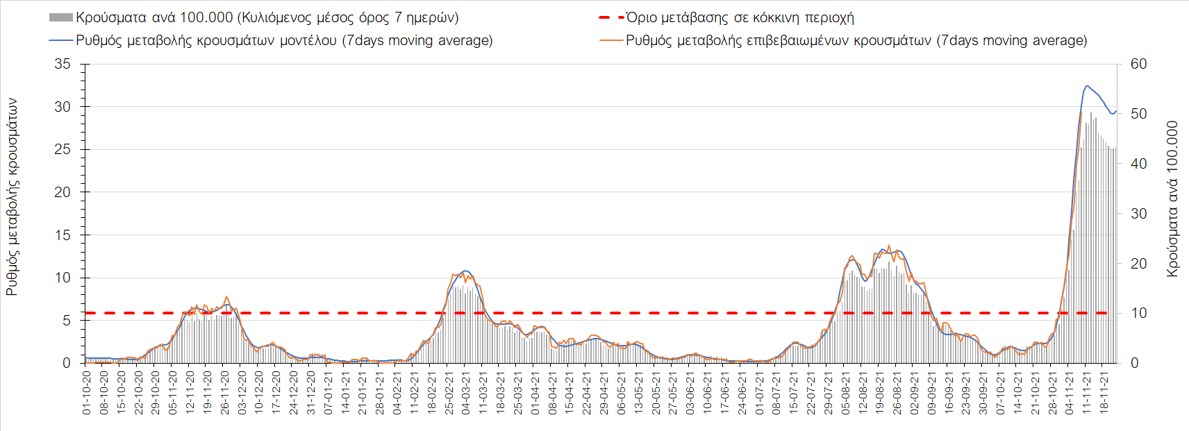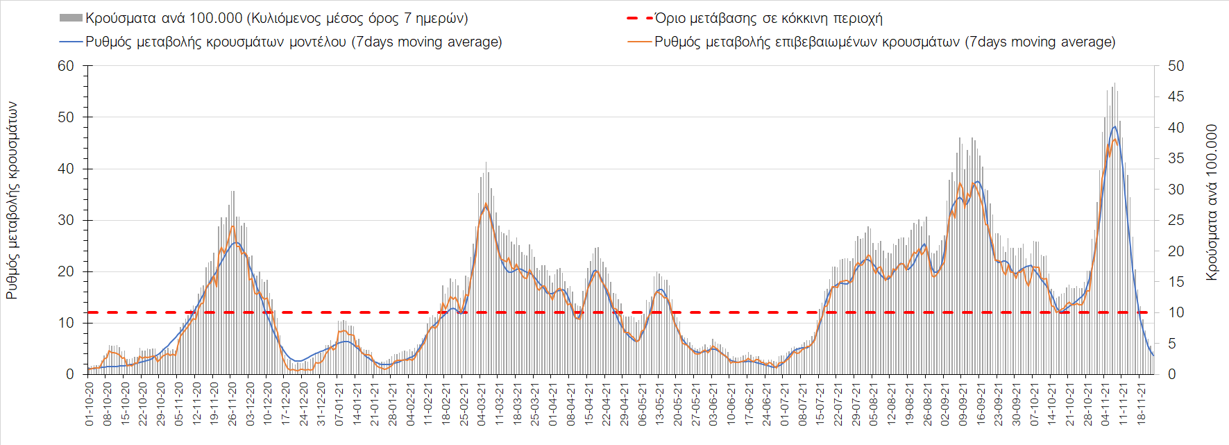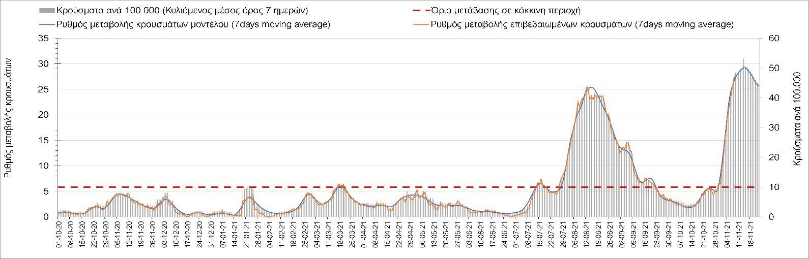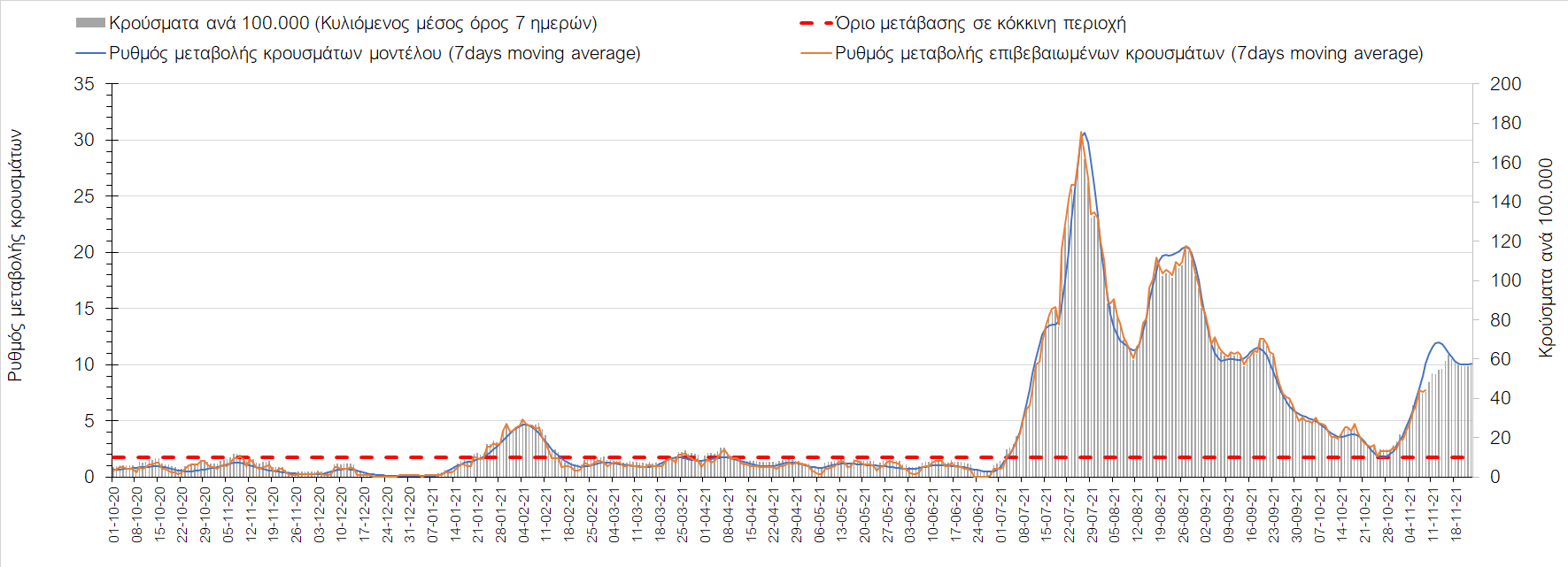 Η αποτύπωση των τάσεων στις επιμέρους περιοχές, παρουσιάζεται στο Σχήμα 61, όπου παρουσιάζεται ο ρυθμός μεταβολής των νέων κρουσμάτων ανά 100.000 κατοίκους (κυλιόμενος μέσος όρος 7 ημερών) των επιμέρους περιοχών. Θετικές τιμές του ρυθμού μεταβολής υποδηλώνουν άνοδο, ενώ αρνητικές τιμές υποδηλώνουν πτωτική πορεία. Το σχήμα αυτό είναι ιδιαίτερα κατατοπιστικό, γιατί οι τιμές που παρουσιάζονται είναι κανονικοποιημένες ως προς τον πληθυσμό, και η σύγκριση των τάσεων ανάμεσα στις επιμέρους περιοχές είναι άμεση. Με βάση και τα σημερινά δεδομένα, πολύ λίγες περιοχές της χώρα παρουσιάζουν αποκλιμάκωση της πανδημίας, πέρα από κάποιες που είναι είτε σε σταθεροποίηση (Καστοριά), είτε διανύουν διακυμάνσεις από μέρα σε μέρα (Γρεβενά).