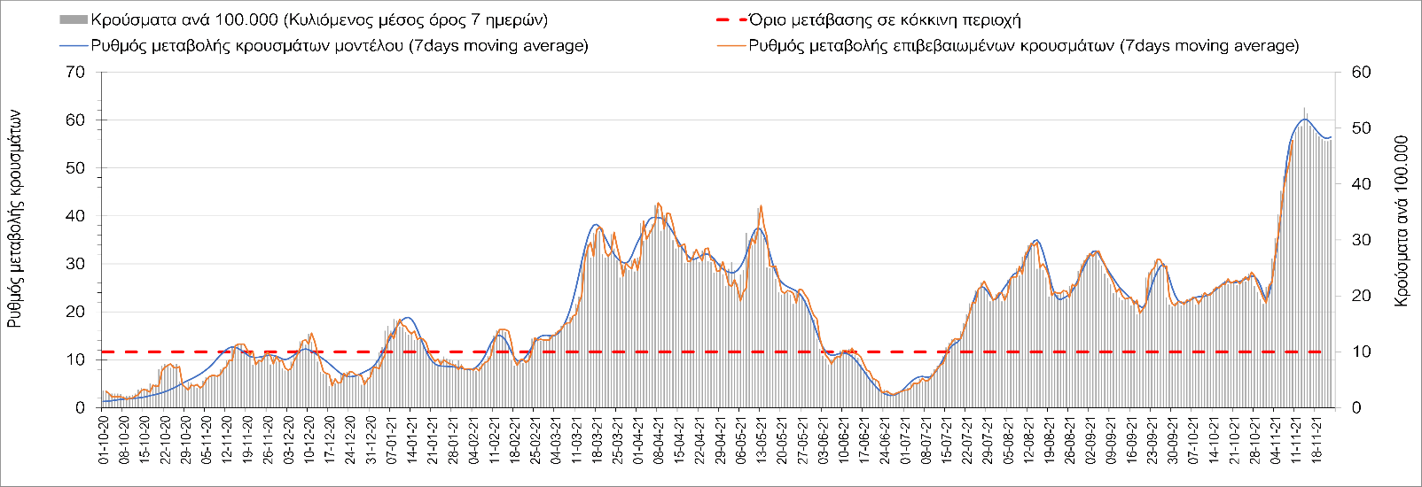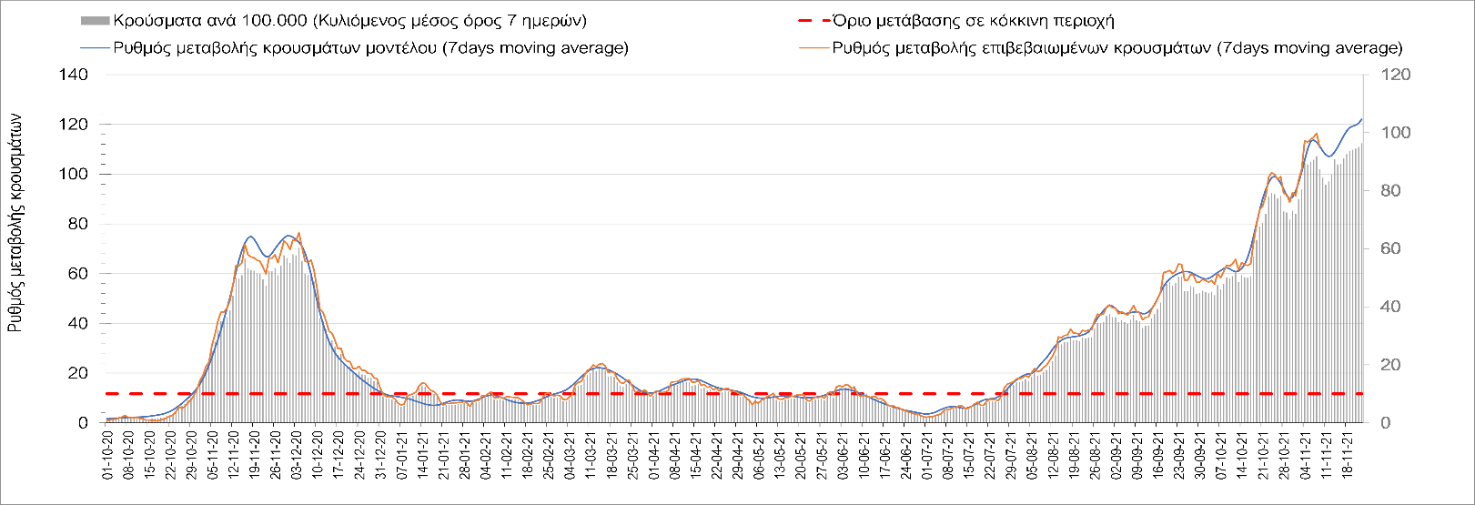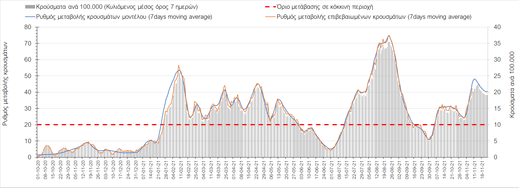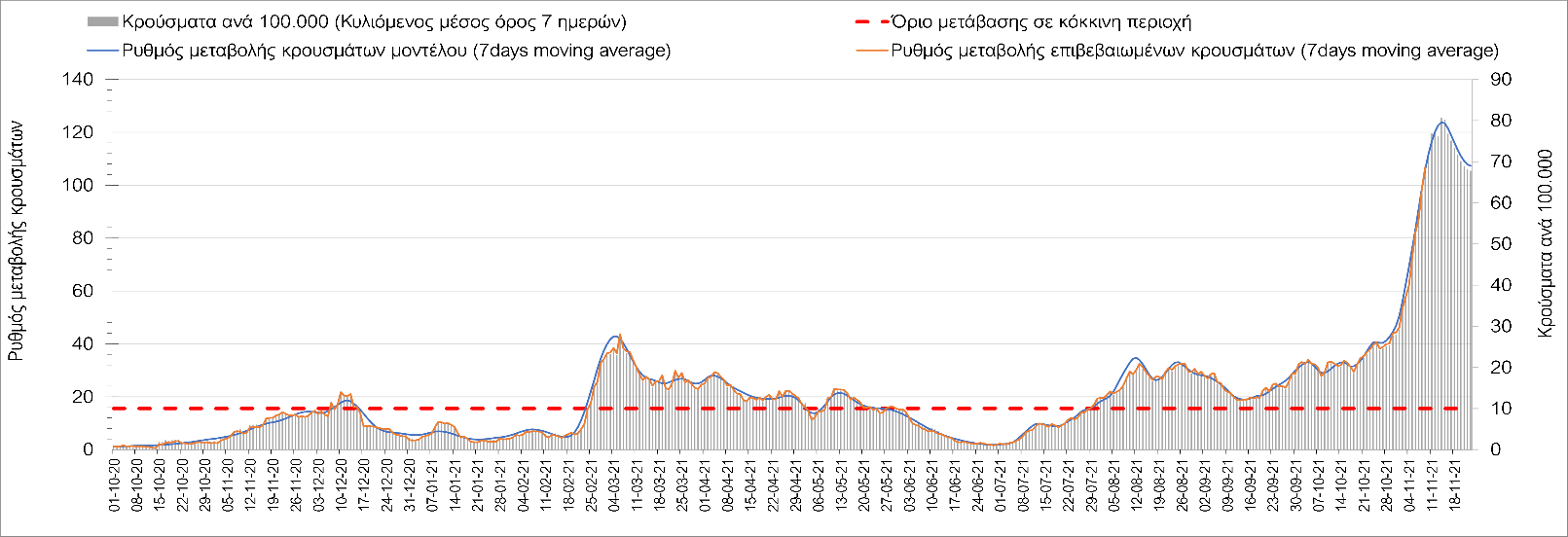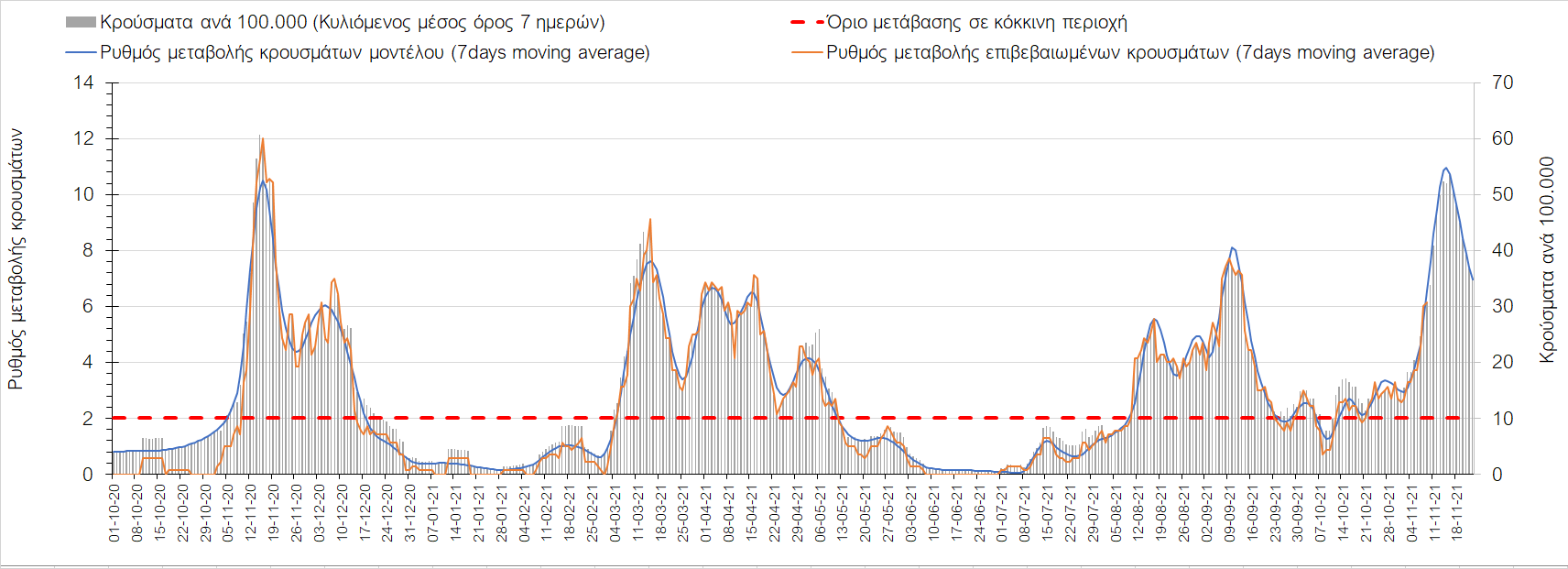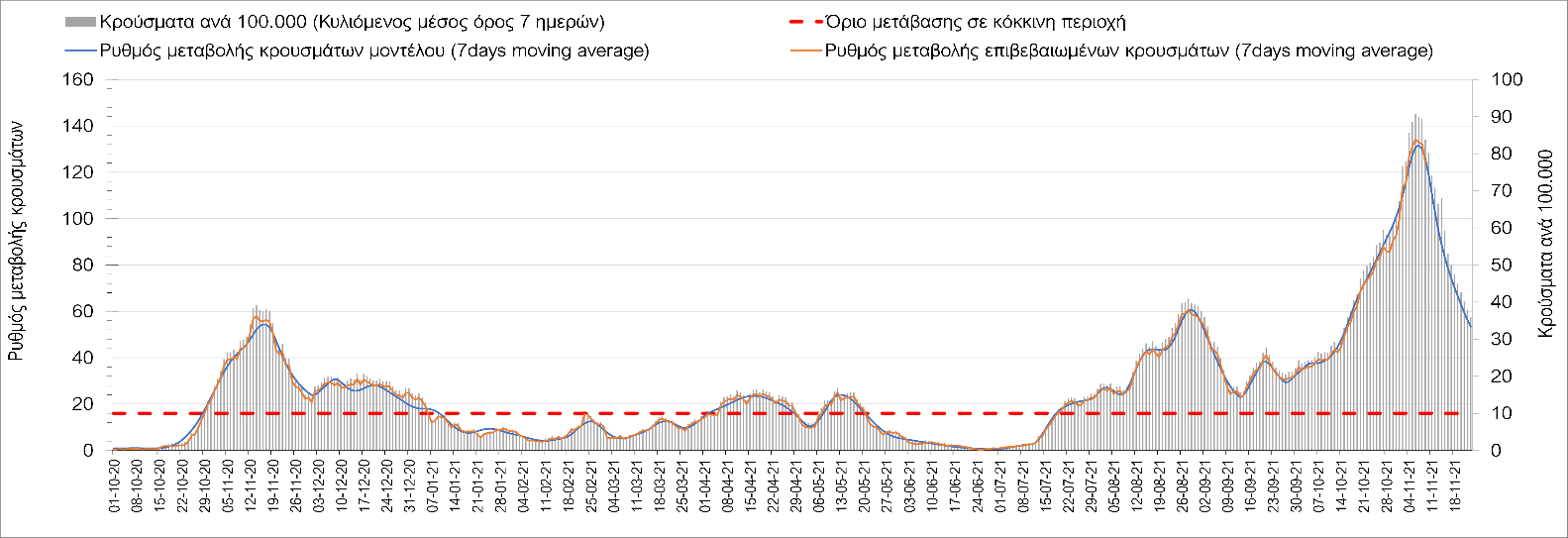 Η αποτύπωση των τάσεων στις επιμέρους περιοχές, παρουσιάζεται στο Σχήμα 61, όπου παρουσιάζεται ο ρυθμός μεταβολής των νέων κρουσμάτων ανά 100.000 κατοίκους (κυλιόμενος μέσος όρος 7 ημερών) των επιμέρους περιοχών. Θετικές τιμές του ρυθμού μεταβολής υποδηλώνουν άνοδο, ενώ αρνητικές τιμές υποδηλώνουν πτωτική πορεία. Το σχήμα αυτό είναι ιδιαίτερα κατατοπιστικό, γιατί οι τιμές που παρουσιάζονται είναι κανονικοποιημένες ως προς τον πληθυσμό, και η σύγκριση των τάσεων ανάμεσα στις επιμέρους περιοχές είναι άμεση. Με βάση και τα σημερινά δεδομένα, πολύ λίγες περιοχές της χώρα παρουσιάζουν αποκλιμάκωση της πανδημίας, πέρα από κάποιες που είναι είτε σε σταθεροποίηση (Καστοριά), είτε διανύουν διακυμάνσεις από μέρα σε μέρα (Γρεβενά).