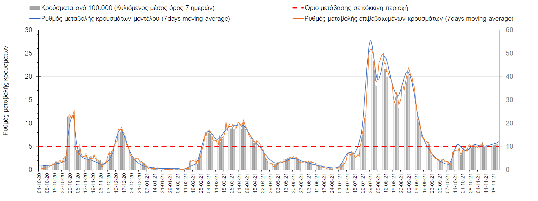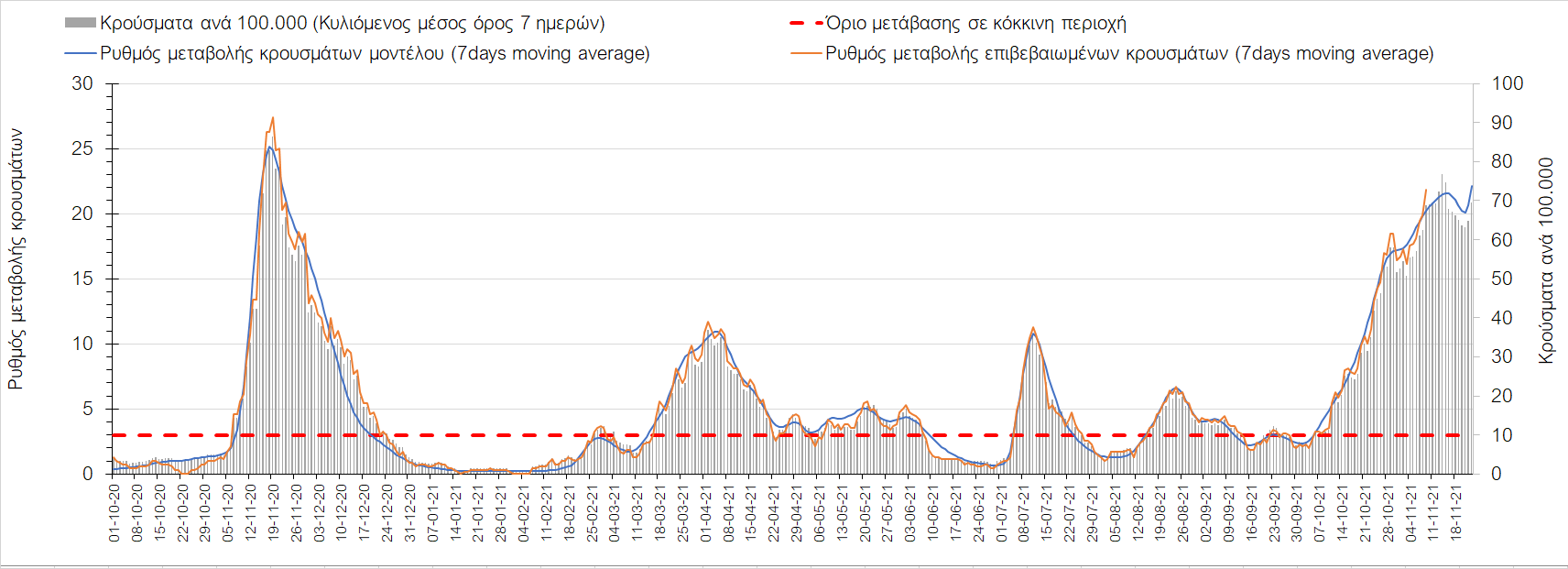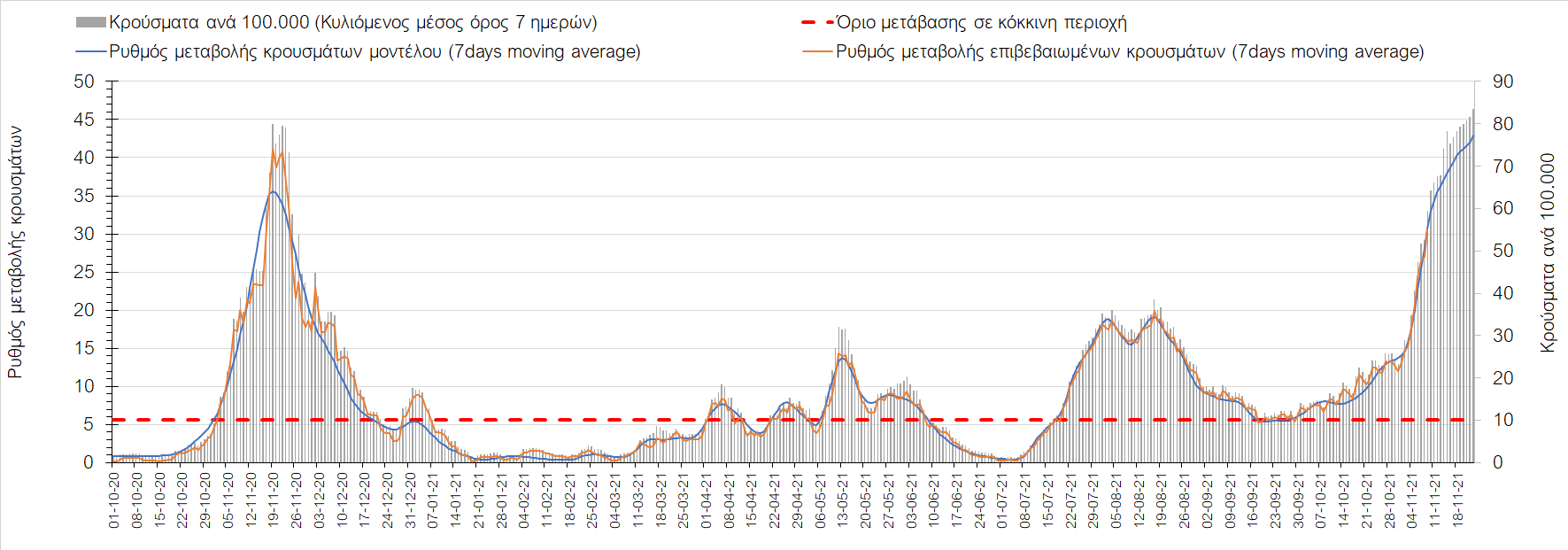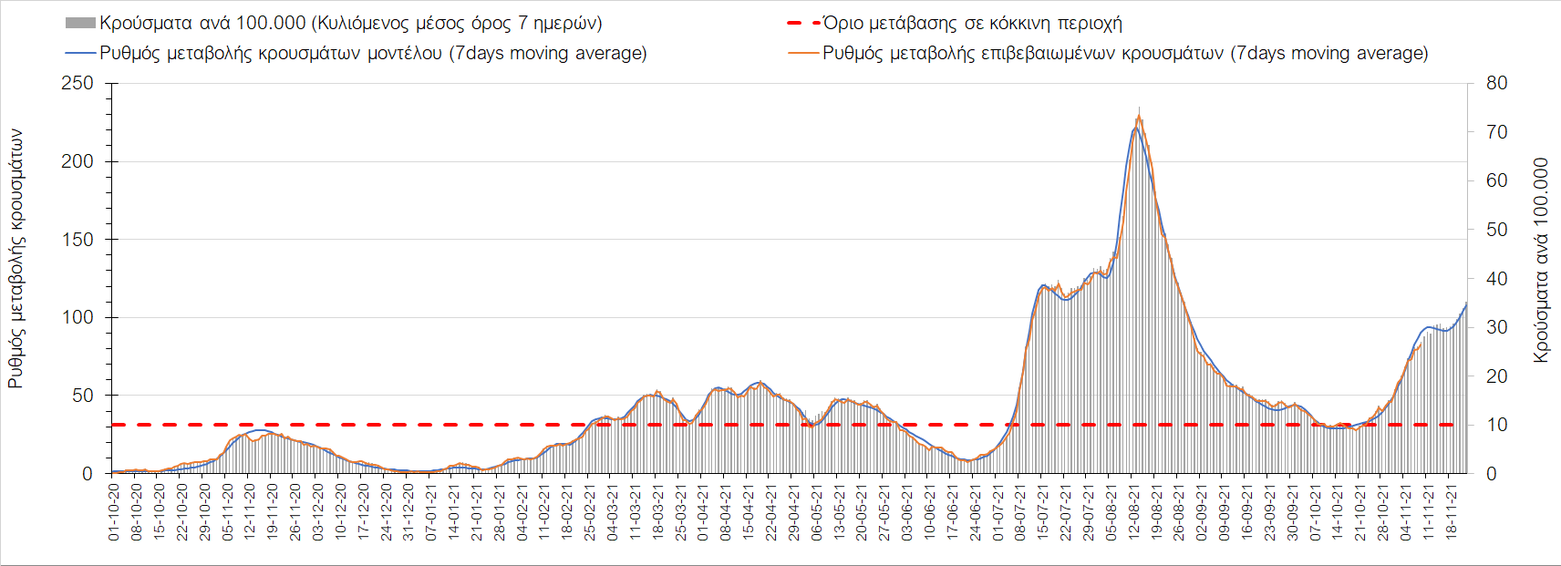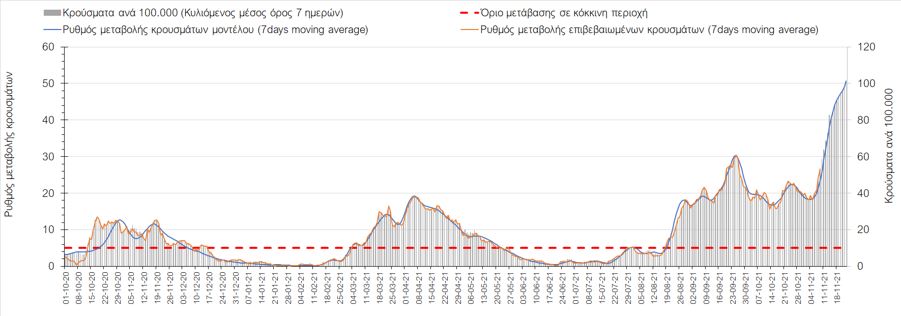 Συνολικά η ανοδική τάση των τελευταίων ημερών αντικατοπτρίζεται και από τον ημερήσιο αριθμό των κρουσμάτων (κυλιόμενος μέσος όρος 7 ημερών), ο οποίος ξεπέρασε τα 6600 (6645). Γενικά την τελευταία εβδομάδα παρατηρείται ακόμη εντονότερη αύξηση του αριθμού των κρουσμάτων (κυλιόμενος μέσος όρος 7 ημερών) που ξεκίνησε την προηγούμενη, κάτι που αναμέναμε να συμβεί μετά τα μέσα Οκτώβρη.