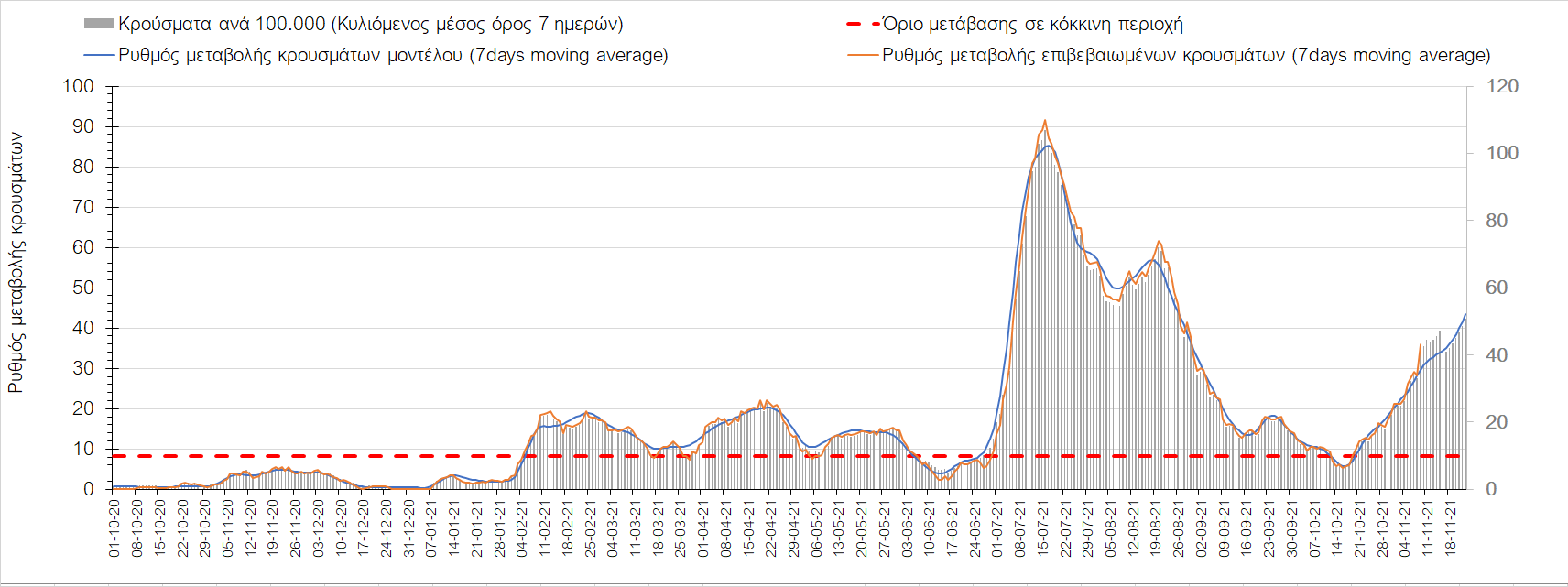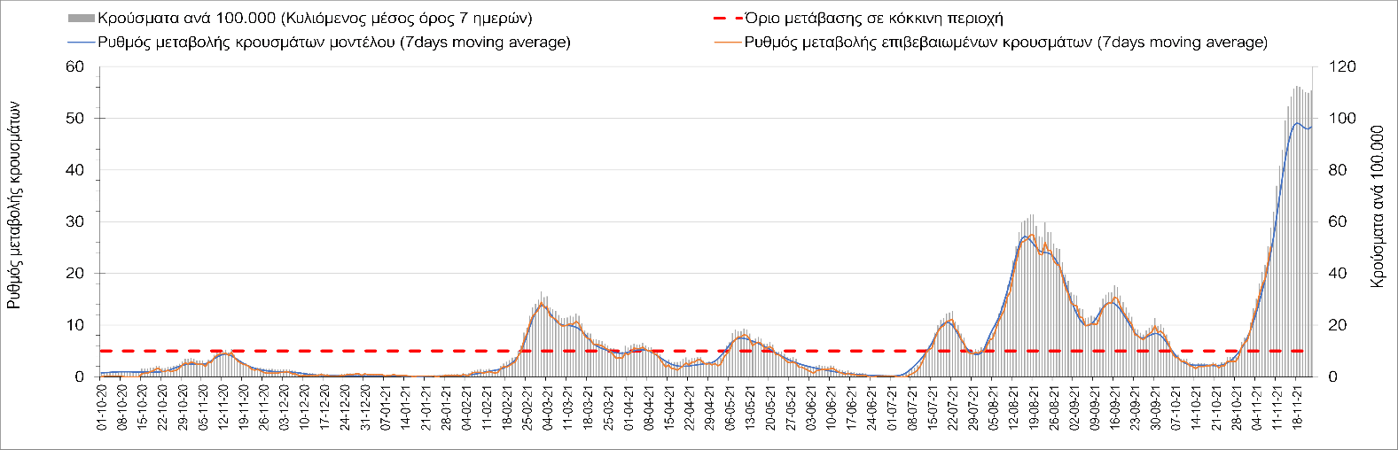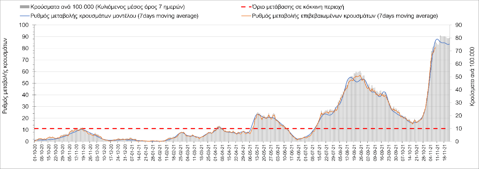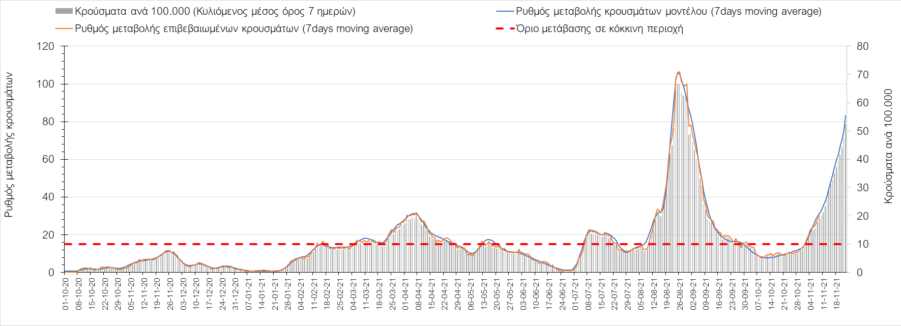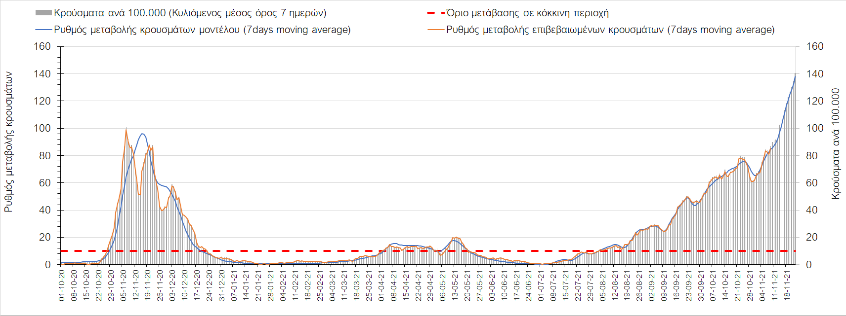 Συνολικά η ανοδική τάση των τελευταίων ημερών αντικατοπτρίζεται και από τον ημερήσιο αριθμό των κρουσμάτων (κυλιόμενος μέσος όρος 7 ημερών), ο οποίος ξεπέρασε τα 6600 (6645). Γενικά την τελευταία εβδομάδα παρατηρείται ακόμη εντονότερη αύξηση του αριθμού των κρουσμάτων (κυλιόμενος μέσος όρος 7 ημερών) που ξεκίνησε την προηγούμενη, κάτι που αναμέναμε να συμβεί μετά τα μέσα Οκτώβρη.