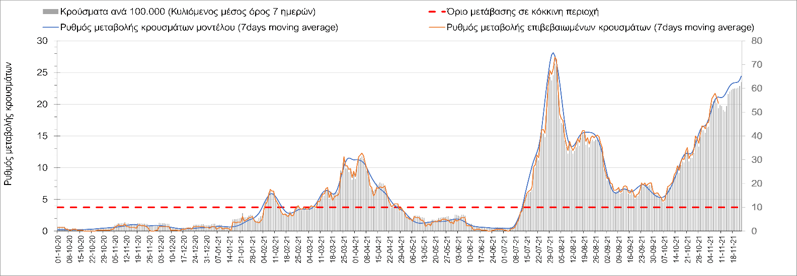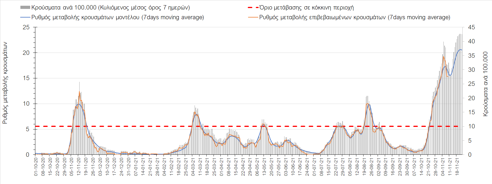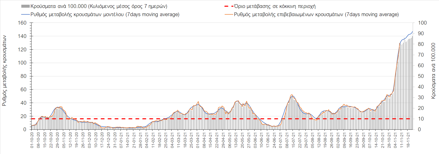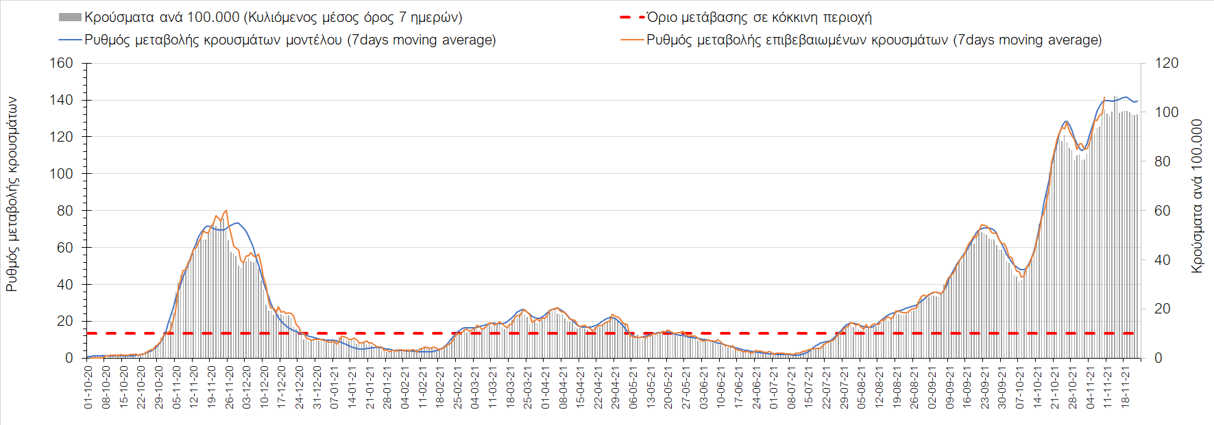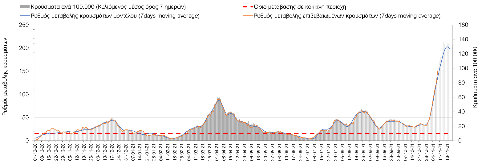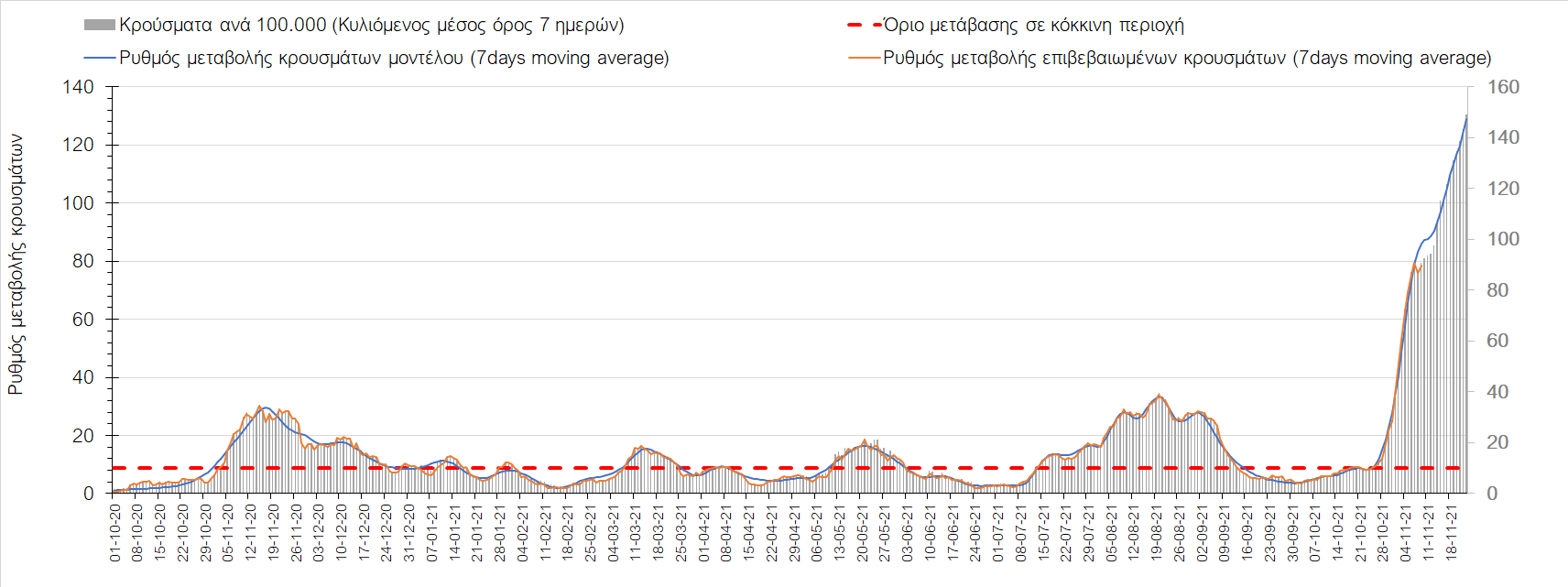 Συνολικά η ανοδική τάση των τελευταίων ημερών αντικατοπτρίζεται και από τον ημερήσιο αριθμό των κρουσμάτων (κυλιόμενος μέσος όρος 7 ημερών), ο οποίος ξεπέρασε τα 6600 (6645). Γενικά την τελευταία εβδομάδα παρατηρείται ακόμη εντονότερη αύξηση του αριθμού των κρουσμάτων (κυλιόμενος μέσος όρος 7 ημερών) που ξεκίνησε την προηγούμενη, κάτι που αναμέναμε να συμβεί μετά τα μέσα Οκτώβρη.