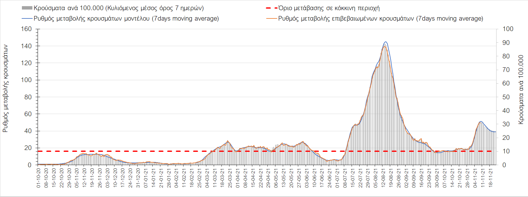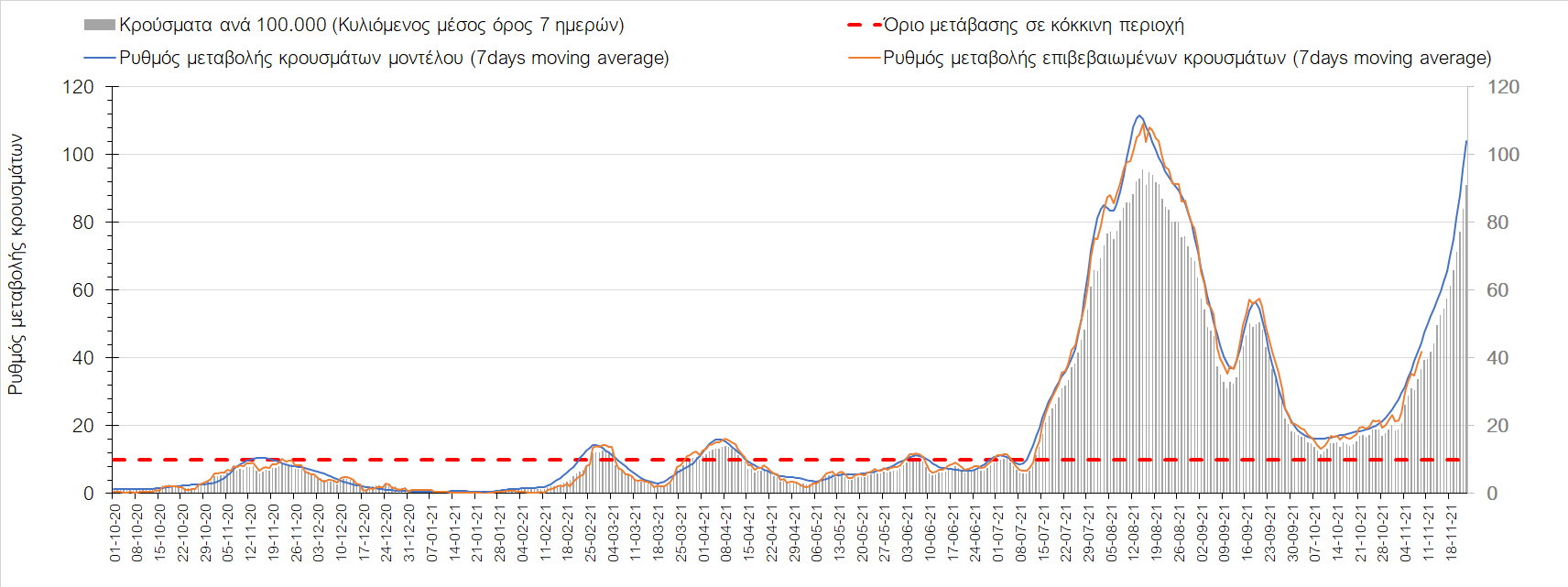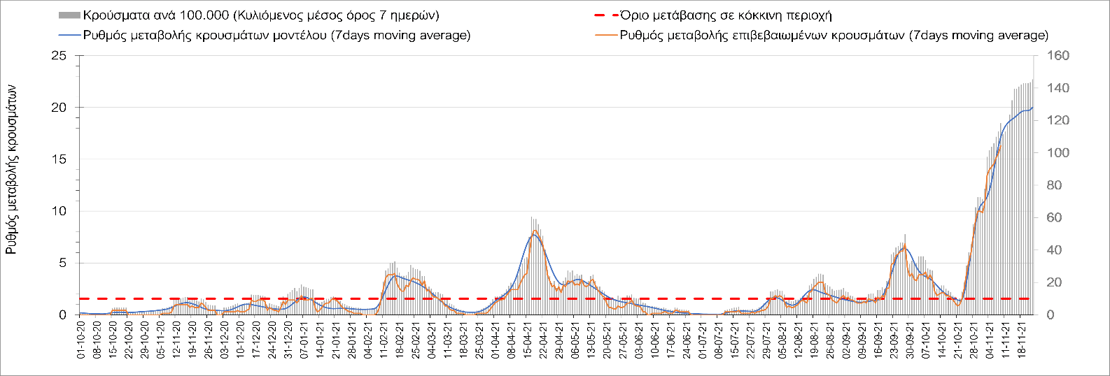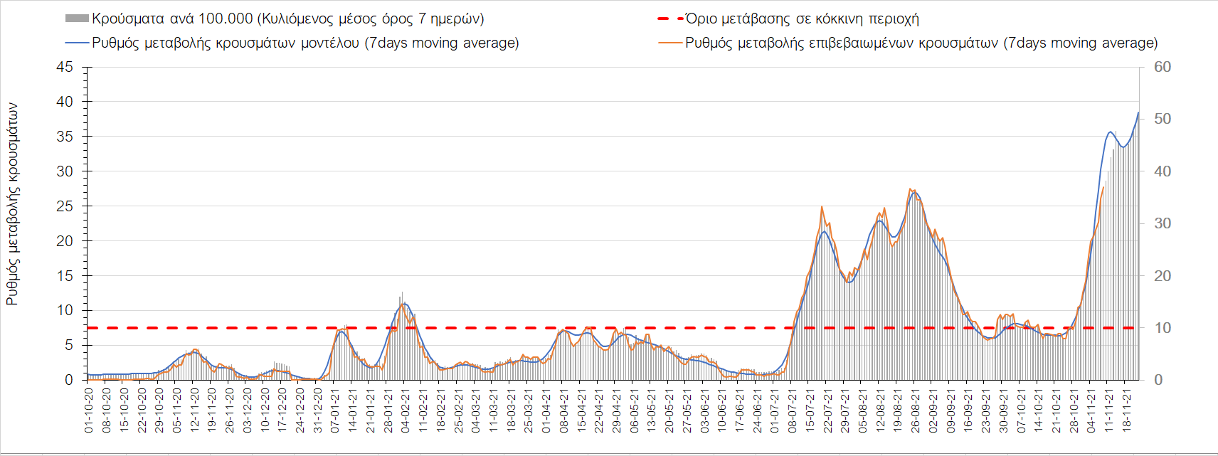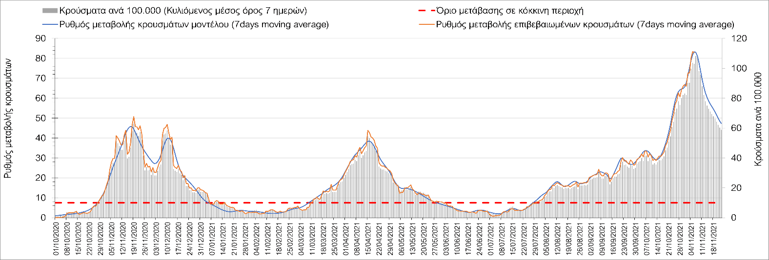 Συνολικά η ανοδική τάση των τελευταίων ημερών αντικατοπτρίζεται και από τον ημερήσιο αριθμό των κρουσμάτων (κυλιόμενος μέσος όρος 7 ημερών), ο οποίος ξεπέρασε τα 6600 (6645). Γενικά την τελευταία εβδομάδα παρατηρείται ακόμη εντονότερη αύξηση του αριθμού των κρουσμάτων (κυλιόμενος μέσος όρος 7 ημερών) που ξεκίνησε την προηγούμενη, κάτι που αναμέναμε να συμβεί μετά τα μέσα Οκτώβρη.