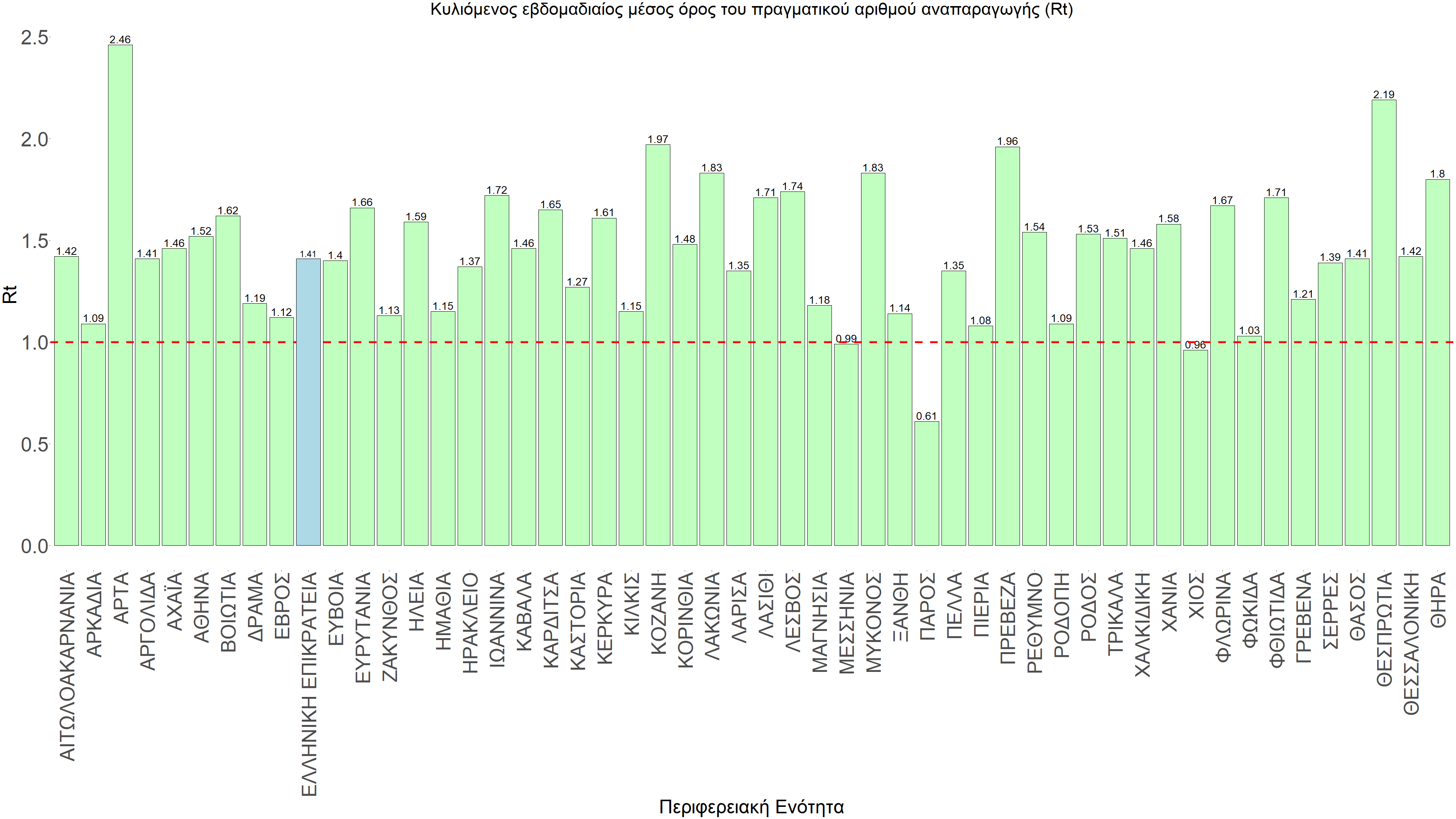 O πραγματικός αριθμός αναπαραγωγής Rt ανά περιφερειακή ενότητα της χώρας παρουσιάζεται στο Σχήμα 58.