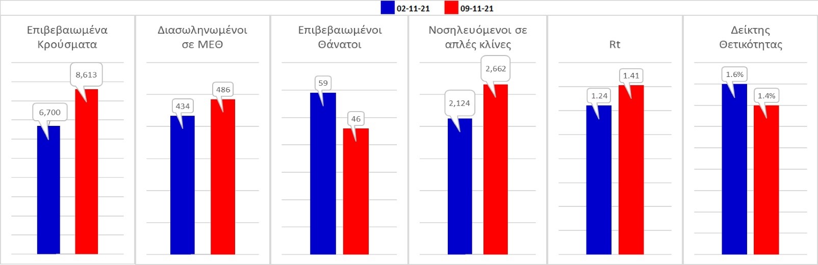 Σχήμα 59. Συγκριτικά αποτελέσματα της επιδημιολογικής εικόνας της σημερινής Τρίτης (09/11/2021) σε σχέση με το προηγούμενη (02/11/2021)