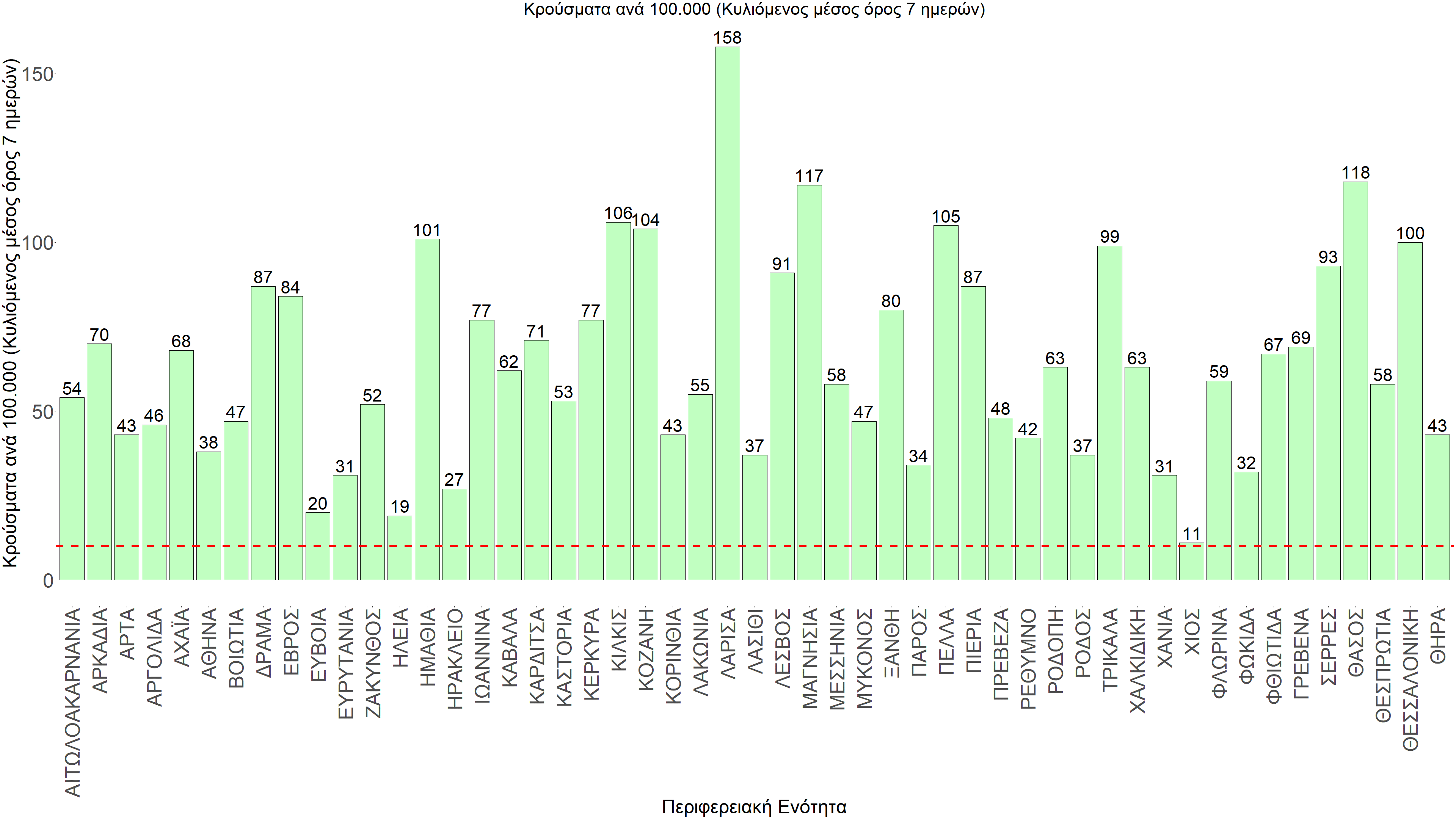 Σχήμα 60. Συγκεντρωτική εικόνα των νέων κρουσμάτων ανά 100.000 κατοίκους (κυλιόμενος μέσος όρος 7 ημερών) των επιμέρους περιοχών