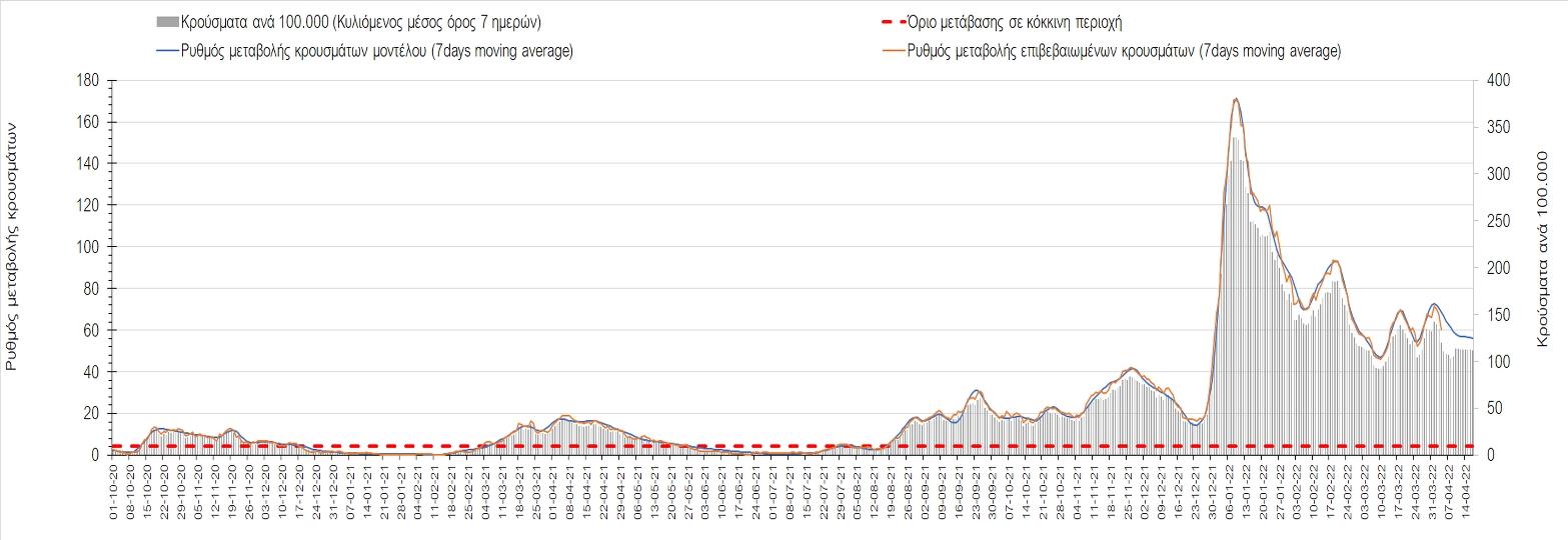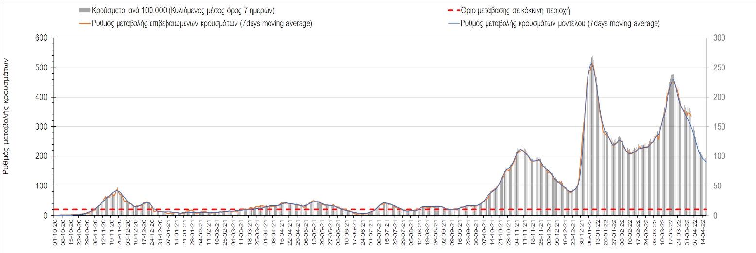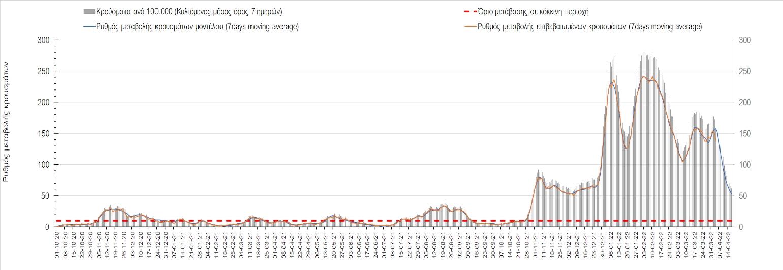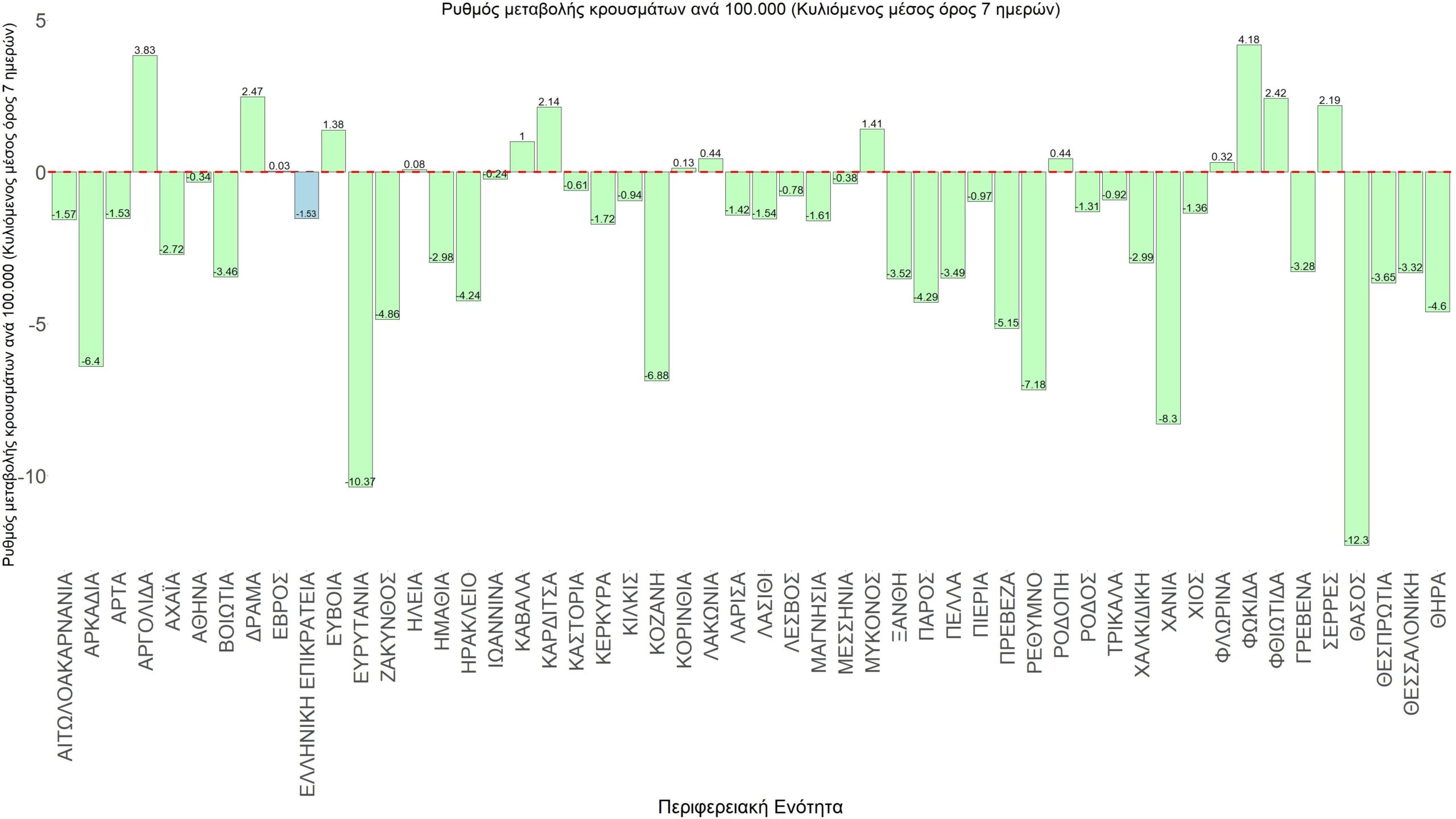 Η αποτύπωση των τάσεων στις επιμέρους περιοχές, παρουσιάζεται στο Σχήμα 61, όπου παρουσιάζεται ο ρυθμός μεταβολής των νέων κρουσμάτων ανά 100.000 κατοίκους (κυλιόμενος μέσος όρος 7 ημερών) των επιμέρους περιοχών. Θετικές τιμές του ρυθμού μεταβολής υποδηλώνουν άνοδο, ενώ αρνητικές τιμές υποδηλώνουν πτωτική πορεία.