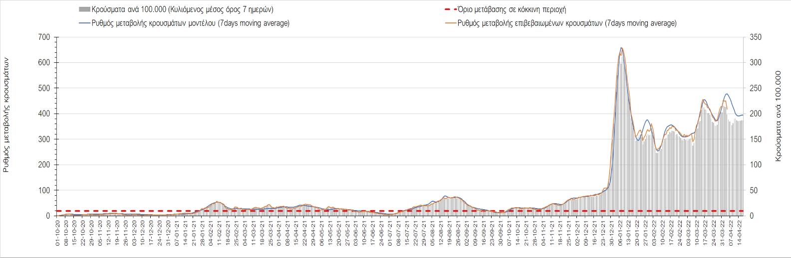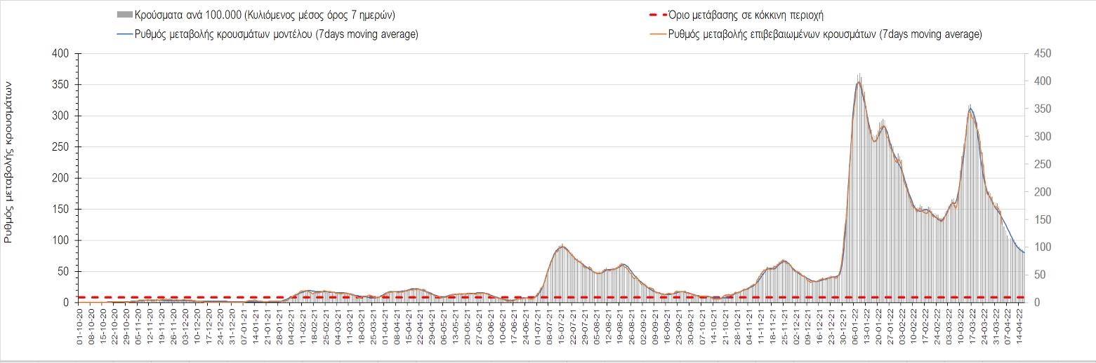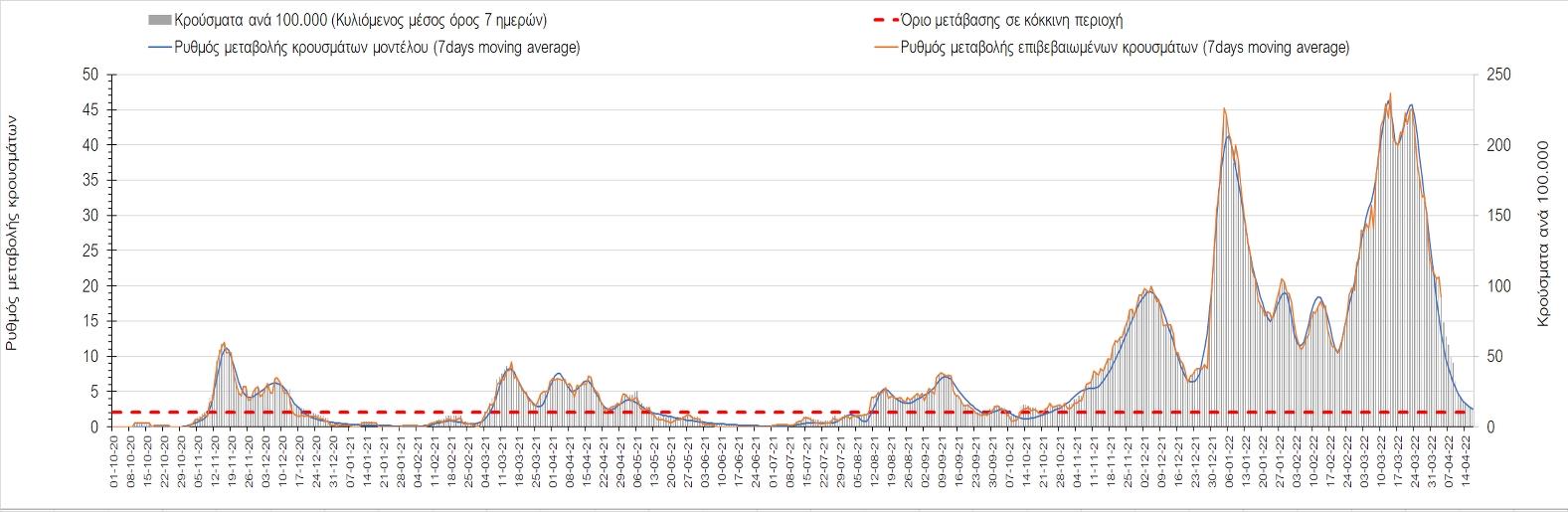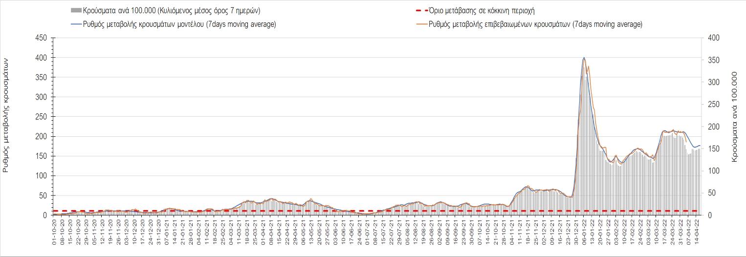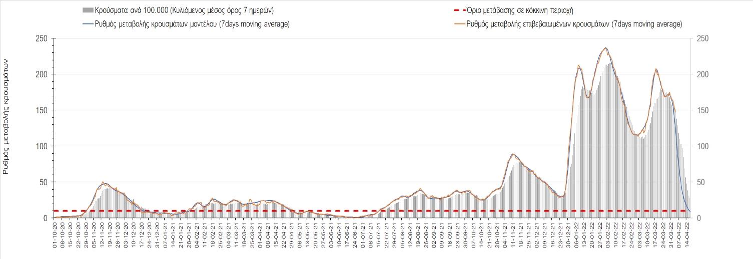 Η αποτύπωση των τάσεων στις επιμέρους περιοχές, παρουσιάζεται στο Σχήμα 61, όπου παρουσιάζεται ο ρυθμός μεταβολής των νέων κρουσμάτων ανά 100.000 κατοίκους (κυλιόμενος μέσος όρος 7 ημερών) των επιμέρους περιοχών. Θετικές τιμές του ρυθμού μεταβολής υποδηλώνουν άνοδο, ενώ αρνητικές τιμές υποδηλώνουν πτωτική πορεία.