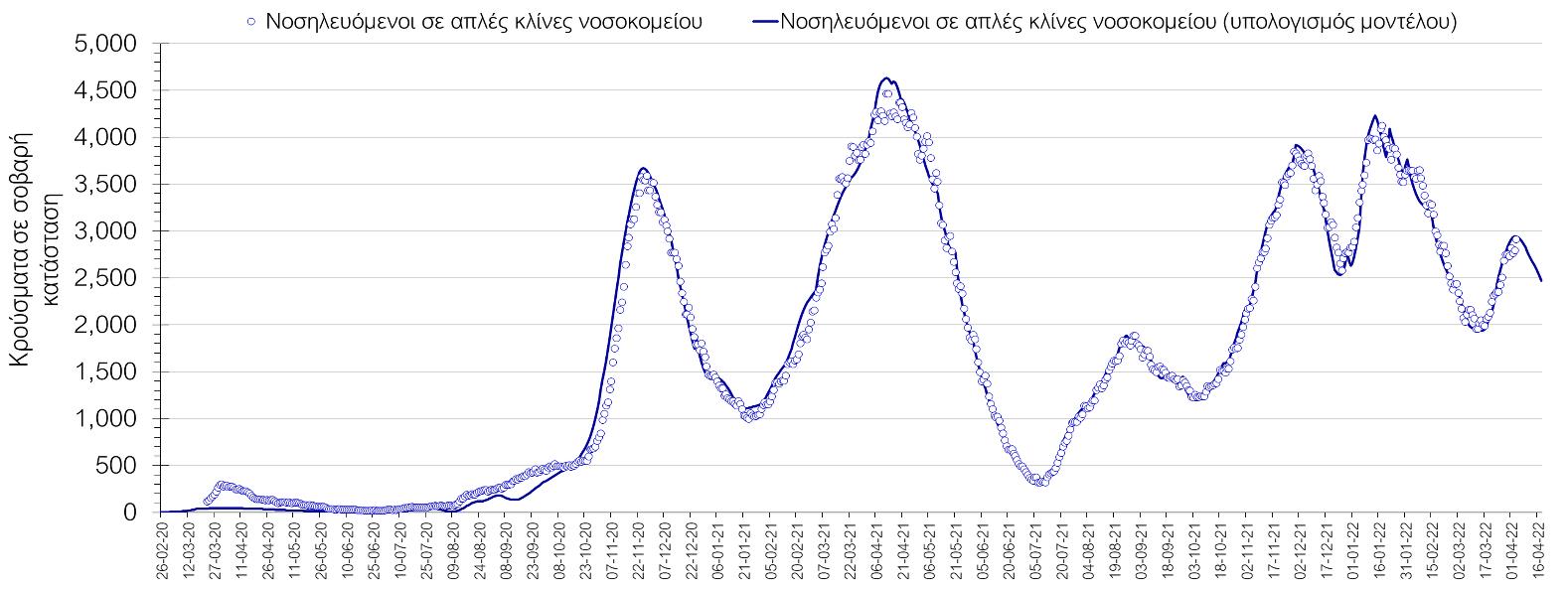 Σχήμα 2. Αριθμός κρουσμάτων σε σοβαρή κατάσταση (νοσηλευόμενοι σε απλές κλίνες) σύμφωνα με τα στοιχεία του ΕΟΔΥ και τις προβλέψεις της υπολογιστικής πλατφόρμας CORE.