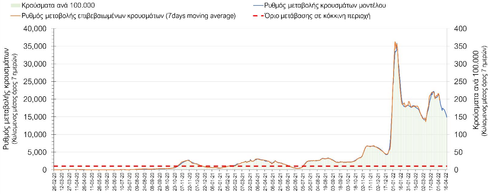 Η πορεία της μέσης εβδομαδιαίας τιμής των κρουσμάτων, καθώς και του κυλιόμενου μέσου όρου 7 ημερών του αριθμού των κρουσμάτων ανά 100.000 πληθυσμού, όπως έχουν καταγραφεί από τον ΕΟΔΥ και η αναμενόμενη πορεία τους, όπως προδιαγράφεται από την υπολογιστική πλατφόρμα CORE για την Ελληνική επικράτεια (όπως και στην Αττική και τη Θεσσαλονίκη) μέχρι τις 15 Απριλίου, αποτυπώνονται στο Σχήμα 4. Αυτή η προβλεπόμενη πορεία, που αφορά τα κρούσματα, τους νοσηλευόμενους σε απλές κλίνες, όσο και σε ΜΕΘ, καθώς επίσης και τους θανάτους, βασίζεται στις ακόλουθες παραδοχές: