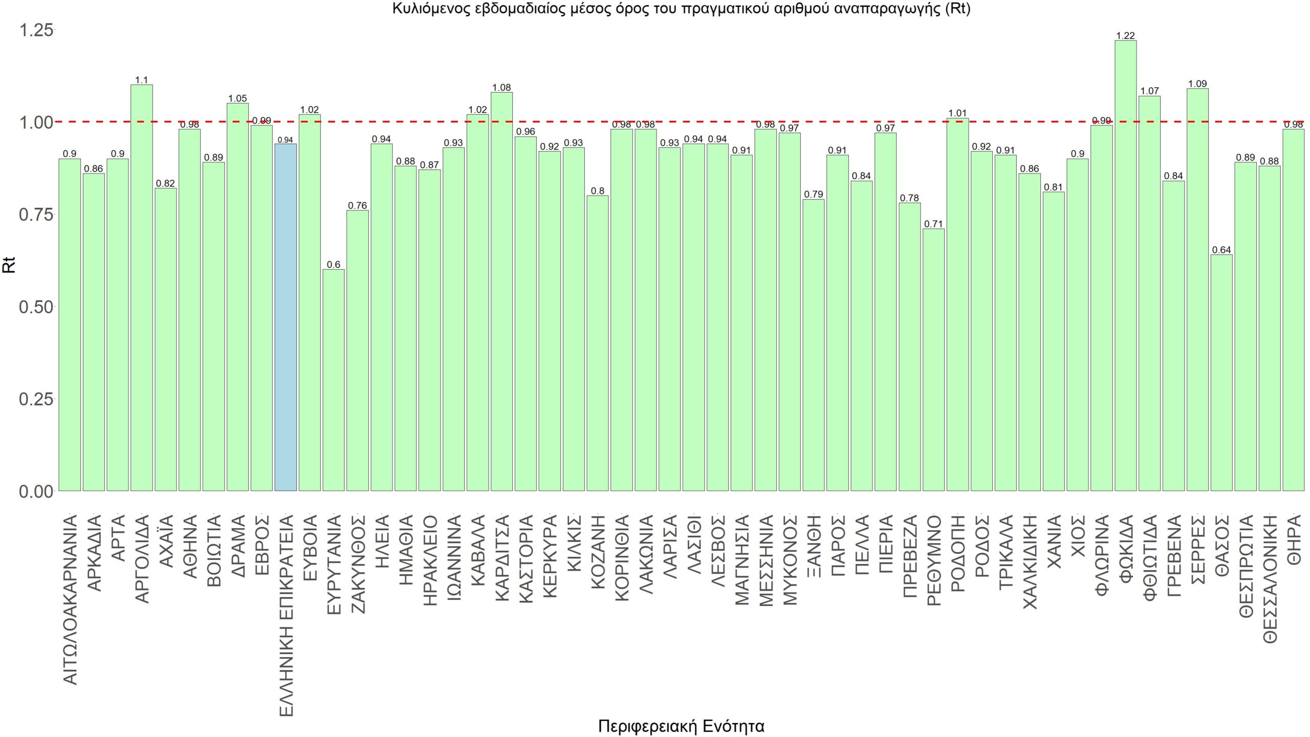 O πραγματικός αριθμός αναπαραγωγής Rt ανά περιφερειακή ενότητα της χώρας παρουσιάζεται στο Σχήμα 58.