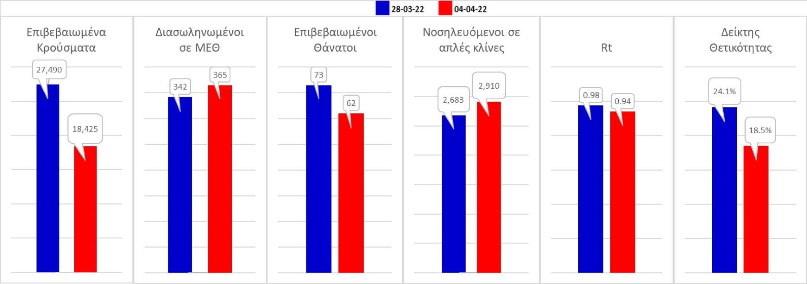 Σχήμα 59. Συγκριτικά αποτελέσματα της επιδημιολογικής εικόνας της Δευτέρας (04/04/2022) σε σχέση με την προηγούμενη (28/03/2022)
