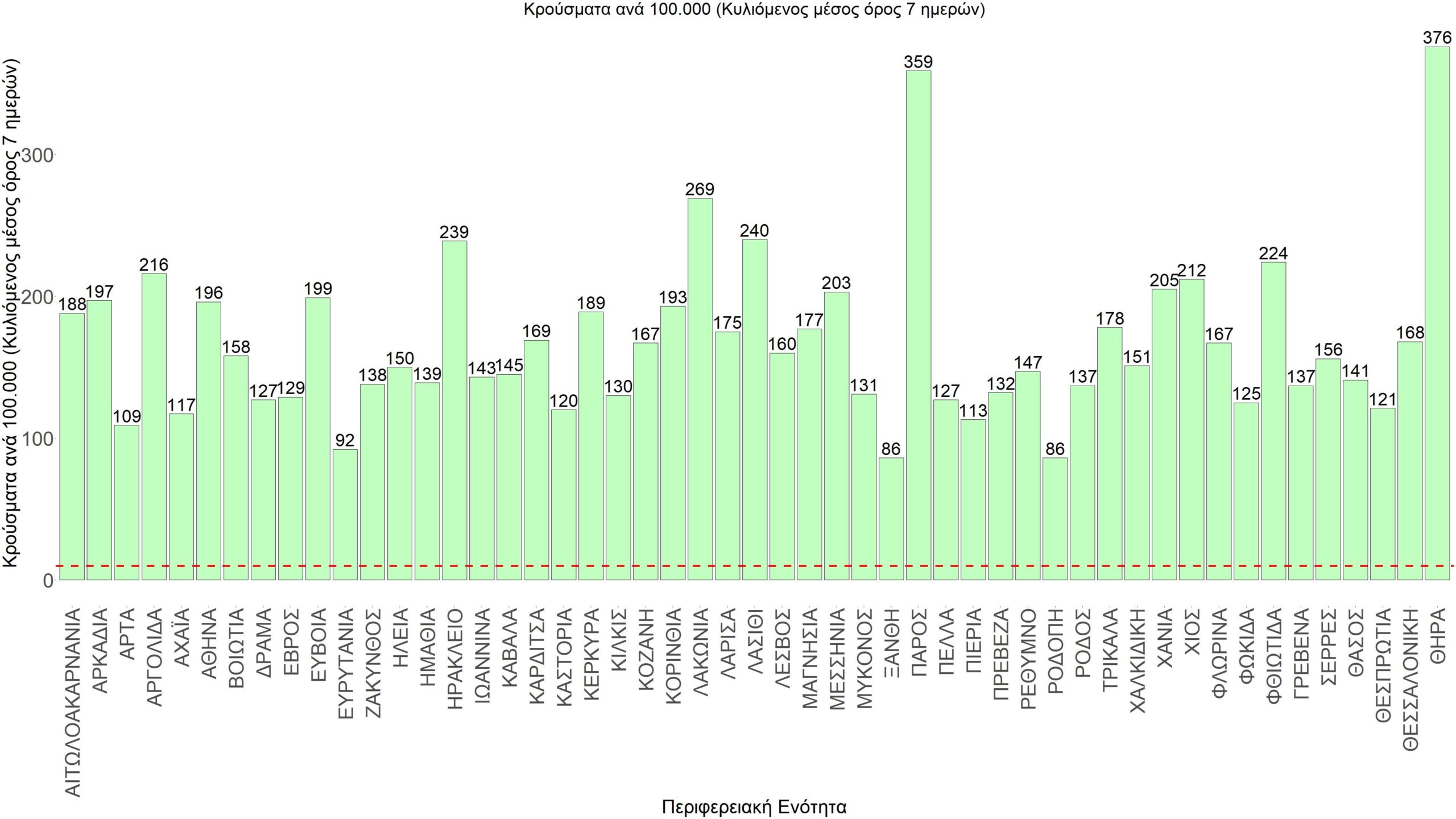 Σχήμα 60. Συγκεντρωτική εικόνα των νέων κρουσμάτων ανά 100.000 κατοίκους (κυλιόμενος μέσος όρος 7 ημερών) των επιμέρους περιοχών