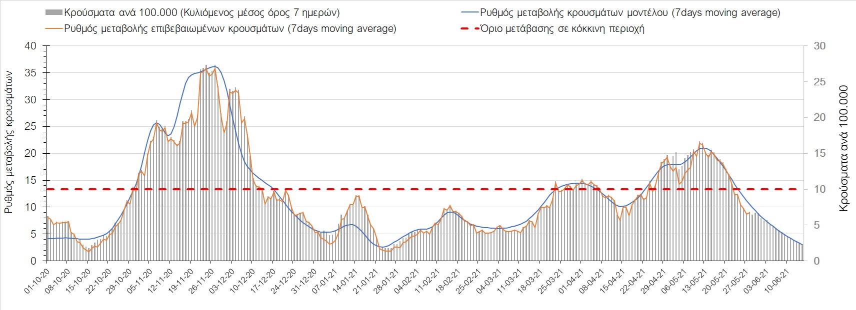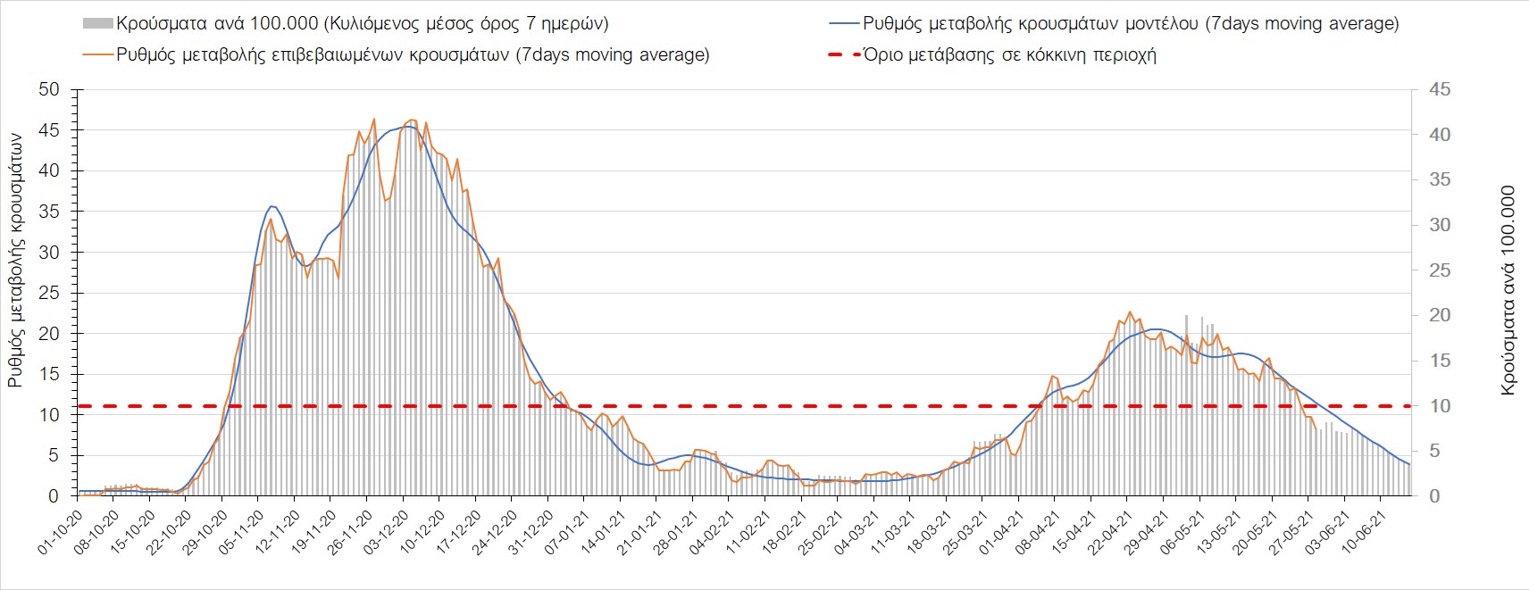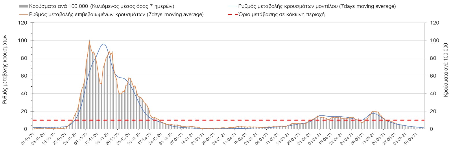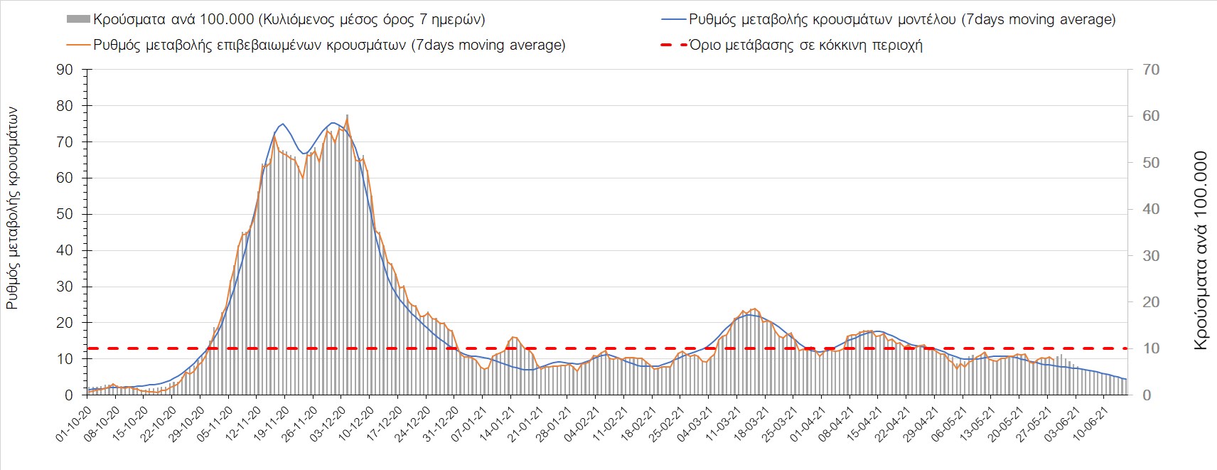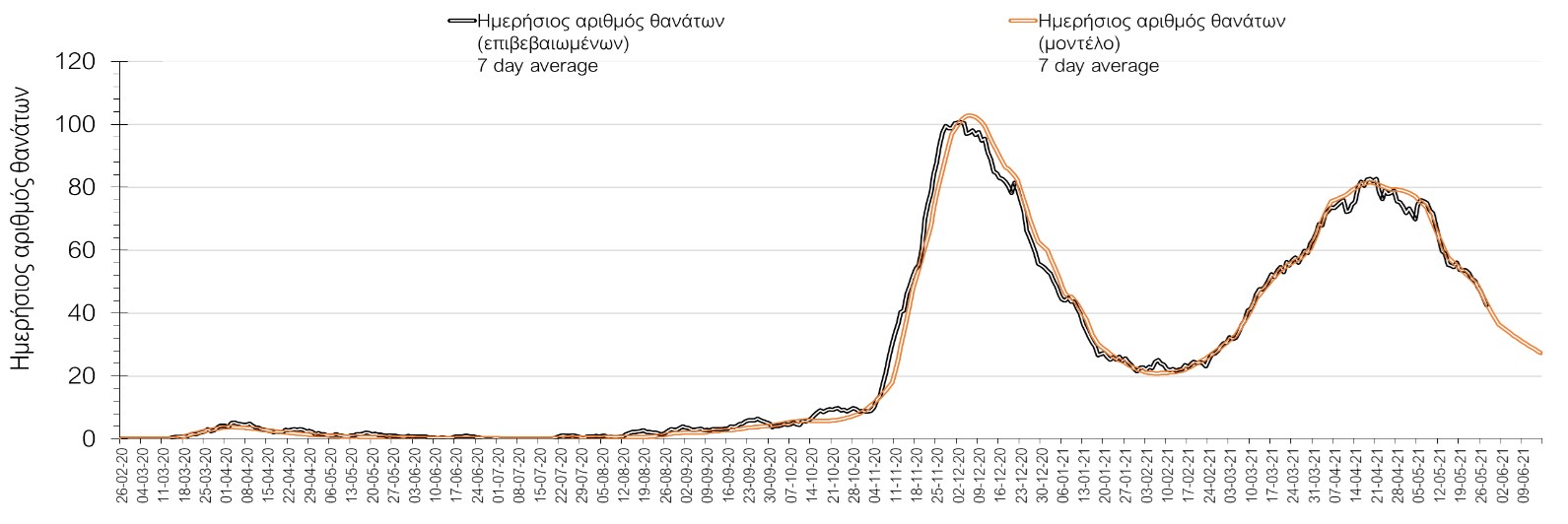 Σχήμα 3. Αριθμός θανάτων (κυλιόμενος μέσος όρος 7 ημερών) σύμφωνα με τα στοιχεία του ΕΟΔΥ και τις προβλέψεις της υπολογιστικής πλατφόρμας CORE.Η πορεία της μέσης εβδομαδιαίας τιμής των κρουσμάτων, καθώς και του κυλιόμενου μέσου όρου 7 ημερών του αριθμού των κρουσμάτων ανά 100.000 πληθυσμού, όπως έχουν καταγραφεί από τον ΕΟΔΥ και η αναμενόμενη πορεία τους όπως προδιαγράφεται από την υπολογιστική πλατφόρμα CORE για την Ελληνική επικράτεια μέχρι τις 15 Ιουνίου, αποτυπώνονται στο Σχήμα 4. Με βάση το συνδυασμένο άνοιγμα της εστίασης στις 3 Μαΐου, και των προβλεπόμενων βαθμίδων εκπαίδευσης (Δημοτικά και Γυμνάσια) στις 10 Μαΐου, αναμέναμε την επιβράδυνση της πορείας αποκλιμάκωσης, με σημαντική πιθανότητα να υπάρξει και ένα μικρό ανοδικό κύμα το τελευταίο δεκαήμερο του Μαΐου. Εντούτοις, φάνηκε ότι ο συνδυασμός των self–test με την άνοδο της θερμοκρασίας, συνέβαλαν καθοριστικά και με αυξημένη αποτελεσματικότητα στον περιορισμό της εξάπλωσης της πανδημίας. Με βάση την επικαιροποιημένη πρόβλεψη που πραγματοποιήσαμε, σύμφωνα με τον αριθμό των κρουσμάτων που παρατηρείται αυτές τις ημέρες, δεν αναμένουμε πλέον την προσωρινή αναστροφή της πορείας αποκλιμάκωσης. Αντίθετα, αναμένουμε τη συνέχιση της αποκλιμάκωσης, η οποία θα υποβοηθηθεί περαιτέρω από τον υπάρχοντα ρυθμό εμβολιασμών και τη δημιουργία τείχους ανοσίας. Πρέπει επίσης να σημειωθεί, ότι με βάση την επικαιροποιημένη ανάλυση των δεδομένων διασποράς της πανδημίας στη χώρα, παρατηρήθηκε αύξηση των ενεργών επαφών τις τελευταίες ημέρες του Απριλίου. Αυτές μπορούν να οφείλονται στο άνοιγμα των μεγάλων εμπορικών κέντρων (να σημειωθεί ότι έγινε χωρίς την εγκατάσταση συσκευών απολύμανσης του αέρα αν και πρόκειται για εσωτερικούς χώρους με ανάγκη τεχνητού εξαερισμού) και στην κίνηση της αγοράς λόγω του Πάσχα, αλλά και στις αυξημένες κοινωνικές επαφές κατά τη διάρκεια των εορτών του Πάσχα. Αντίθετα, η εφαρμογή του μέτρου των self-test (σε μαθητές, εκπαιδευτικούς και εργαζομένους σε διάφορους τομείς οικονομικών δραστηριοτήτων που άνοιξαν), συντέλεσε στο να μη γίνει αναστροφή της πορείας αποκλιμάκωσης. Αυτή η προβλεπόμενη πορεία, που αφορά τα κρούσματα, τους νοσηλευόμενους σε απλές κλίνες, όσο και σε ΜΕΘ, καθώς επίσης και τους θανάτους, βασίζεται στις ακόλουθες παραδοχές: