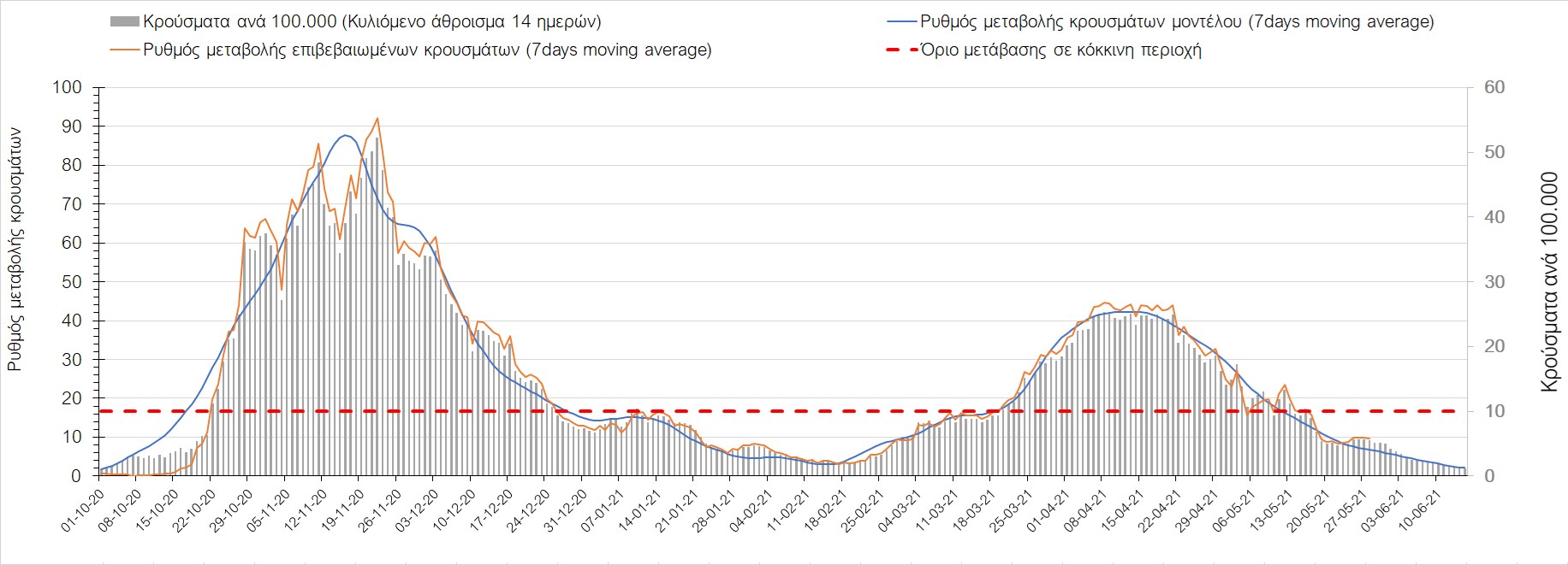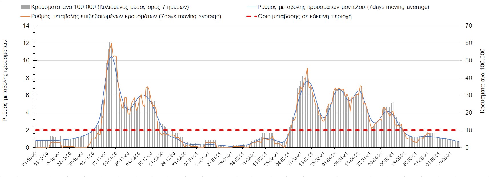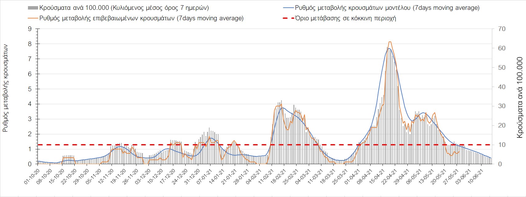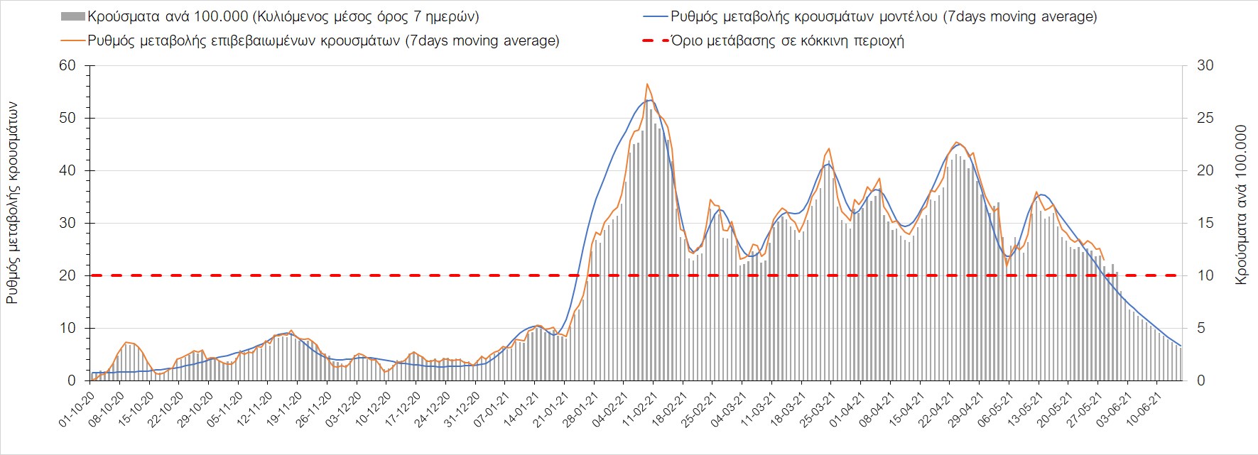Σχήμα 3. Αριθμός θανάτων (κυλιόμενος μέσος όρος 7 ημερών) σύμφωνα με τα στοιχεία του ΕΟΔΥ και τις προβλέψεις της υπολογιστικής πλατφόρμας CORE.Η πορεία της μέσης εβδομαδιαίας τιμής των κρουσμάτων, καθώς και του κυλιόμενου μέσου όρου 7 ημερών του αριθμού των κρουσμάτων ανά 100.000 πληθυσμού, όπως έχουν καταγραφεί από τον ΕΟΔΥ και η αναμενόμενη πορεία τους όπως προδιαγράφεται από την υπολογιστική πλατφόρμα CORE για την Ελληνική επικράτεια μέχρι τις 15 Ιουνίου, αποτυπώνονται στο Σχήμα 4. Με βάση το συνδυασμένο άνοιγμα της εστίασης στις 3 Μαΐου, και των προβλεπόμενων βαθμίδων εκπαίδευσης (Δημοτικά και Γυμνάσια) στις 10 Μαΐου, αναμέναμε την επιβράδυνση της πορείας αποκλιμάκωσης, με σημαντική πιθανότητα να υπάρξει και ένα μικρό ανοδικό κύμα το τελευταίο δεκαήμερο του Μαΐου. Εντούτοις, φάνηκε ότι ο συνδυασμός των self–test με την άνοδο της θερμοκρασίας, συνέβαλαν καθοριστικά και με αυξημένη αποτελεσματικότητα στον περιορισμό της εξάπλωσης της πανδημίας. Με βάση την επικαιροποιημένη πρόβλεψη που πραγματοποιήσαμε, σύμφωνα με τον αριθμό των κρουσμάτων που παρατηρείται αυτές τις ημέρες, δεν αναμένουμε πλέον την προσωρινή αναστροφή της πορείας αποκλιμάκωσης. Αντίθετα, αναμένουμε τη συνέχιση της αποκλιμάκωσης, η οποία θα υποβοηθηθεί περαιτέρω από τον υπάρχοντα ρυθμό εμβολιασμών και τη δημιουργία τείχους ανοσίας. Πρέπει επίσης να σημειωθεί, ότι με βάση την επικαιροποιημένη ανάλυση των δεδομένων διασποράς της πανδημίας στη χώρα, παρατηρήθηκε αύξηση των ενεργών επαφών τις τελευταίες ημέρες του Απριλίου. Αυτές μπορούν να οφείλονται στο άνοιγμα των μεγάλων εμπορικών κέντρων (να σημειωθεί ότι έγινε χωρίς την εγκατάσταση συσκευών απολύμανσης του αέρα αν και πρόκειται για εσωτερικούς χώρους με ανάγκη τεχνητού εξαερισμού) και στην κίνηση της αγοράς λόγω του Πάσχα, αλλά και στις αυξημένες κοινωνικές επαφές κατά τη διάρκεια των εορτών του Πάσχα. Αντίθετα, η εφαρμογή του μέτρου των self-test (σε μαθητές, εκπαιδευτικούς και εργαζομένους σε διάφορους τομείς οικονομικών δραστηριοτήτων που άνοιξαν), συντέλεσε στο να μη γίνει αναστροφή της πορείας αποκλιμάκωσης. Αυτή η προβλεπόμενη πορεία, που αφορά τα κρούσματα, τους νοσηλευόμενους σε απλές κλίνες, όσο και σε ΜΕΘ, καθώς επίσης και τους θανάτους, βασίζεται στις ακόλουθες παραδοχές: