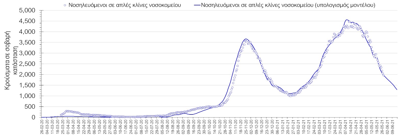 Σχήμα 2. Αριθμός κρουσμάτων σε σοβαρή κατάσταση (νοσηλευόμενοι σε απλές κλίνες) σύμφωνα με τα στοιχεία του ΕΟΔΥ και τις προβλέψεις της υπολογιστικής πλατφόρμας CORE.