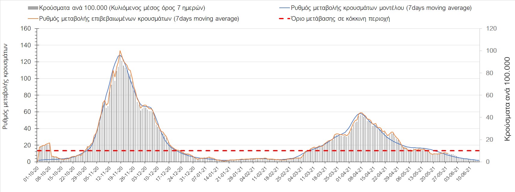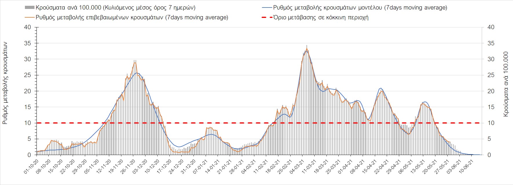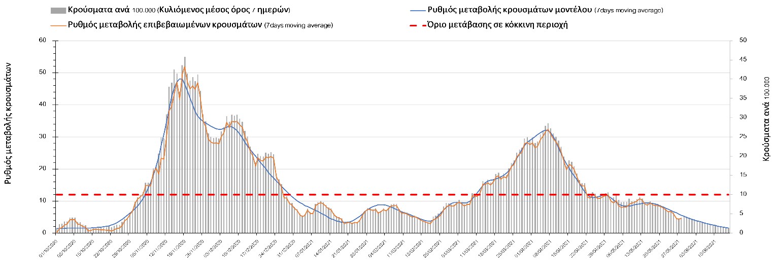 Σχήμα 48. Πορεία του ημερησίου αριθμού των κρουσμάτων (κυλιόμενος μέσος όρος 7 ημερών) στο ΛασίθιΣτη Λέσβο εντοπίστηκαν 7 κρούσματα (Σχήμα 49), η έντονα ανοδική πορεία των προηγουμένων ημερών έχει περιέλθει σε αποκλιμάκωση, όπως είχαμε προβλέψει από τις προηγούμενες ημέρες. Στην Κέρκυρα με 17 κρούσματα (Σχήμα 50) παρατηρείται μείωση σε σχέση με προχθές, και ενώ το πολύ έντονο ανοδικό κύμα που διαμορφώθηκε ξανά λόγω του Πάσχα και του ανοίγματος δραστηριοτήτων, είχε ξεκινήσει την αναμενόμενη αποκλιμάκωση, υπόκειται μια αναζωπύρωση, η έκταση της οποίας θα προσδιοριστεί και τις επόμενες ημέρες, σίγουρα όμως αυτές οι διακυμάνσεις θα επιβραδύνουν τη συστηματική αποκλιμάκωση. Στη Χίο παρατηρείται ίδιος αριθμός κρουσμάτων σε σχέση με προχθές με 3 κρούσματα και (Σχήμα 51), η συνολική πορεία παραμένει καθοδική και η Χίος έχει πλέον απομακρυνθεί έντονα από το όριο της κόκκινης περιοχής. Στη Θάσο, όπου εντοπίστηκε 1 κρούσμα (Σχήμα 52), παρόλο που παρατηρούνται διακυμάνσεις στη συνολικά έντονα καθοδική τάση, πλέον βρίσκεται κάτω από το όριο του χαρακτηρισμού ως κόκκινη περιοχή.