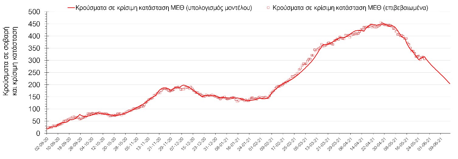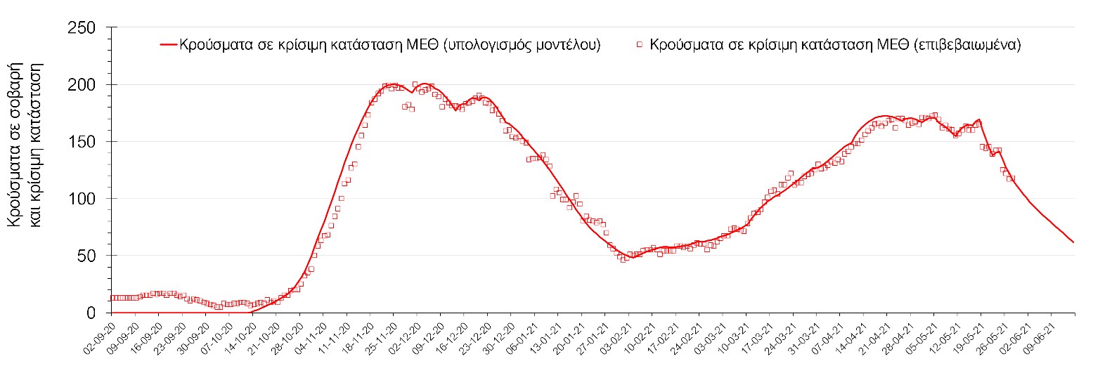 Σύμφωνα με τα στοιχεία του ΕΟΔΥ, ο αριθμός κρουσμάτων της Παρασκευής ανέρχεται στα 1585 νέα κρούσματα, με τα αποτελέσματα να συνάδουν με τις προβλέψεις της υπολογιστικής πλατφόρμας CORE (n=1579) μετά από επαναπαραμετροποίηση της αποτελεσματικότητας των ισχύοντων μέτρων, ώστε να γίνει η απαραίτητη σύγκλιση με τον αριθμό επιβεβαιωμένων κρουσμάτων, που ήταν χαμηλότερος από τον αναμενόμενο σύμφωνα με τις προβλέψεις του μοντέλου. Ο αριθμός των τεστ που πραγματοποιήθηκαν ήταν 48989 και σε συνδυασμό με τον αριθμό των κρουσμάτων, ο δείκτης θετικότητας διαμορφώθηκε στο 3,2%. Η πραγματοποίηση αριθμού τεστ σε επίπεδα άνω των 50.000 την ημέρα (όπως και πραγματοποιείται τις τελευταίες ημέρες), συντελεί στο να εξάγουμε πιο ασφαλή συμπεράσματα σχετικά με την πορεία της πανδημίας, αλλά και να εντοπίζονται περισσότεροι ασυμπτωματικοί και προσυμπτωματικοί, συντελώντας στον περιορισμό της πανδημίας. Γενικά όμως θα πρέπει να αυξηθεί κι άλλο ο αριθμός των τεστ ανίχνευσης του SARS-CoV-2 χρησιμοποιώντας τα rapid test και τα self test για να καταπολεμηθεί η δυναμική αύξησης της διασποράς στις περιοχές όπου μια τέτοια αύξηση διαφαίνεται από τα μέχρι τώρα δεδομένα και την υπολογιστική πλατφόρμα CORE.Ο αριθμός ημερήσιων θανάτων (40) που καταγράφηκε είναι ελαφρώς αυξημένος σε σχέση με προχθές (39) και όπως είχαμε προβλέψει από την προηγούμενη εβδομάδα, ο κυλιόμενος εβδομαδιαίος μέσος όρος που την Παρασκευή είναι 43 έχει ξεκινήσει ήπια αποκλιμάκωση σε συνδυασμό με την πτωτική πορεία του αριθμού των κρουσμάτων.Όσον αφορά στους ασθενείς σε κρίσιμη κατάσταση (διασωληνωμένοι σε ΜΕΘ), ο αριθμός τους μειώθηκε σε σχέση με προχθές (521 από 540). Παρά τις παρατηρούμενες διακυμάνσεις, συνεχίζει η αποκλιμάκωση με βάση την επικαιροποιημένη πρόβλεψη (αυτό βέβαια με την παραδοχή ότι θα συνεχίσουν να τηρούνται τα ισχύοντα μέτρα, συμπεριλαμβανομένων των προβλεπόμενων self–test και ανοίγματα δραστηριοτήτων υψηλού συγχρωτισμού, όπως τα mall και η εστίαση θα γίνουν με την κατάλληλη προετοιμασία), η οποία όμως είναι αργή και έχει διακυμάνσεις. Αξίζει να σημειωθεί ότι ο αριθμός των ασθενών σε κρίσιμη κατάσταση όπως και των θανάτων είναι αναλογικά χαμηλότερος σε σχέση με τα αντίστοιχα μεγέθη στο δεύτερο κύμα, τόσο λόγω των εμβολιασμών ευπαθών ομάδων, όσο και του υψηλότερου αριθμού τεστ ανίχνευσης, που συντελεί στον εντοπισμό περισσότερων ασυμπτωματικών ή ήπια συμπτωματικών κρουσμάτων. Επίσης, η διασπορά των μεταλλαγμένων στελεχών που έχουν μεγαλύτερη μεταδοτικότητα από το στέλεχος του SARS-CoV-2 που κυριαρχούσε μέχρι το τέλος Φεβρουαρίου και η αυξημένη κινητικότητα του πληθυσμού έχουν μεγαλώσει το ποσοστό των νεότερων ηλικιών που μολύνονται με αποτέλεσμα η μέση ηλικία των μολύνσεων να έχει πέσει σημαντικά. Η καμπύλη εξέλιξης του αριθμού των ασθενών που νοσηλεύονται σε κλίνες ΜΕΘ με βάση τις προσομοιώσεις της πλατφόρμας CORE, όπως αυτή παρουσιάζεται στο Σχήμα 1, των ασθενών που νοσηλεύονται σε απλές κλίνες στο Σχήμα 2, ενώ μια εκτίμηση για την πορεία των θανάτων ανά ημέρα παρουσιάζεται στο Σχήμα 3. Η πτωτική πορεία σε όλους τους δείκτες θα συνεχιστεί αλλά σε ό,τι αφορά στον αριθμό εισαγωγών στα νοσοκομεία και στους θανάτους η ταχύτητα αποκλιμάκωσης θα είναι μειωμένη σε σχέση με την προηγούμενη περίοδο.