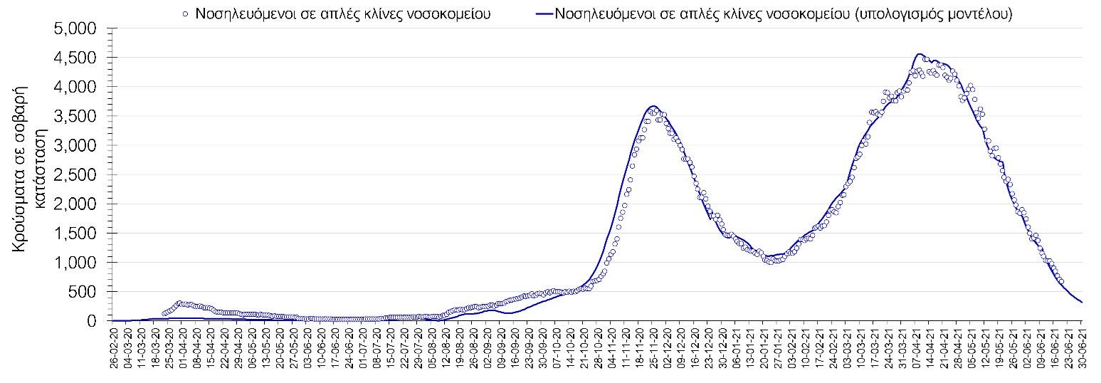 Σχήμα 2. Αριθμός κρουσμάτων σε σοβαρή κατάσταση (νοσηλευόμενοι σε απλές κλίνες) σύμφωνα με τα στοιχεία του ΕΟΔΥ και τις προβλέψεις της υπολογιστικής πλατφόρμας CORE.