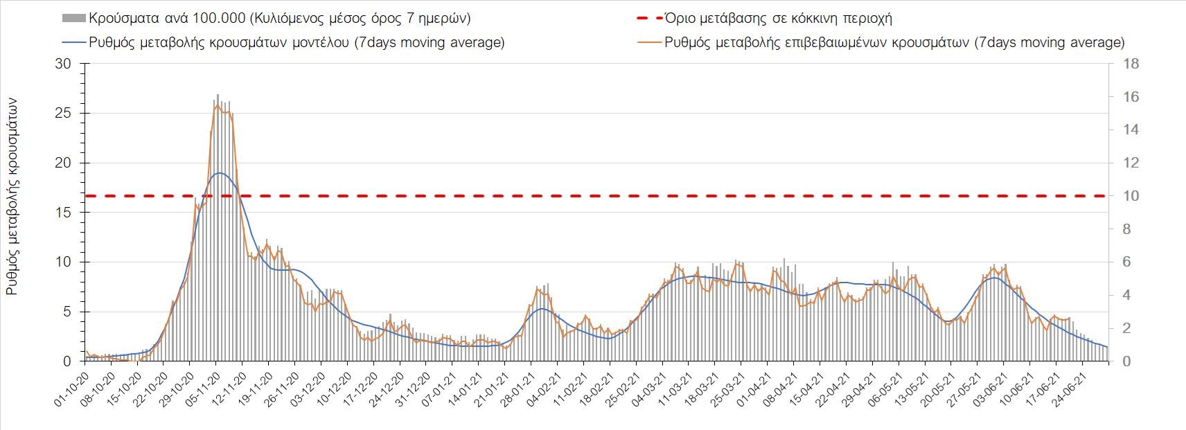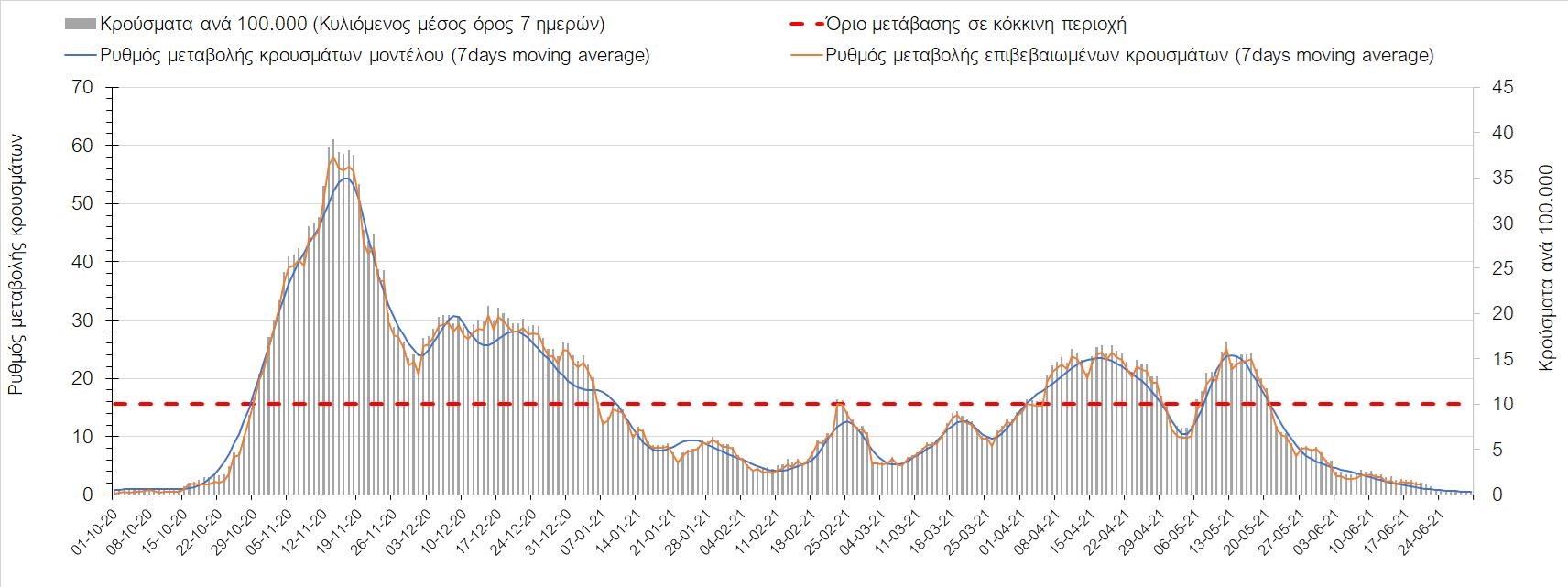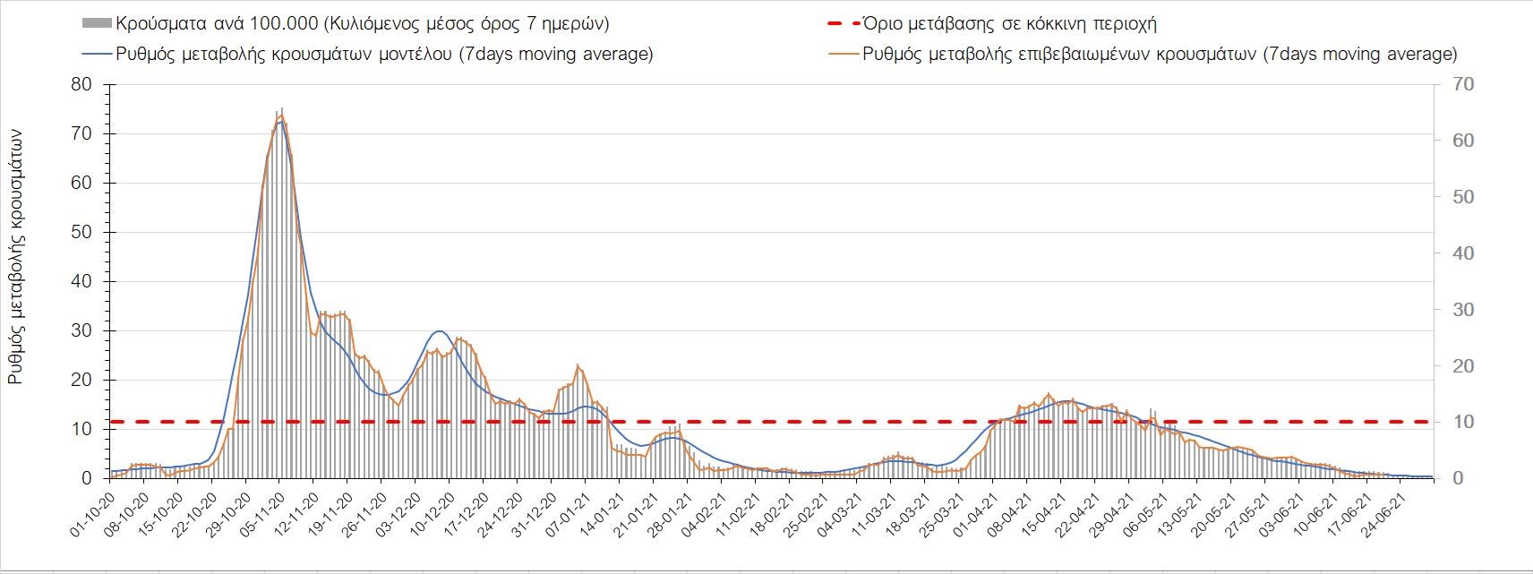Το enikos.gr καθημερινά, μετά τις ανακοινώσεις του ΕΟΔΥ για τον κορονοϊό παρουσιάζει την ποσοτική ανάλυση των επιδημιολογικών δεδομένων, σε συνεργασία με την ομάδα του Δημοσθένη Σαρηγιάννη, διευθυντή του Εργαστηρίου Περιβαλλοντικής Μηχανικής του Αριστοτελείου Πανεπιστημίου Θεσσαλονίκης και διευθυντή της Ερευνητικής Ομάδας HERACLES για το Εκθεσίωμα και την Ανθρώπινη Υγεία του Κέντρου Διεπιστημονικής Έρευνας και Καινοτομίας του ΑΠΘ. Σύμφωνα με την εκτίμηση του, η Αττική είναι στο όριο ώστε να πέσει ο εβδομαδιαίος μέσος όρος κάτω από τα 10 κρούσματα ανά 100.000 κατοίκους.