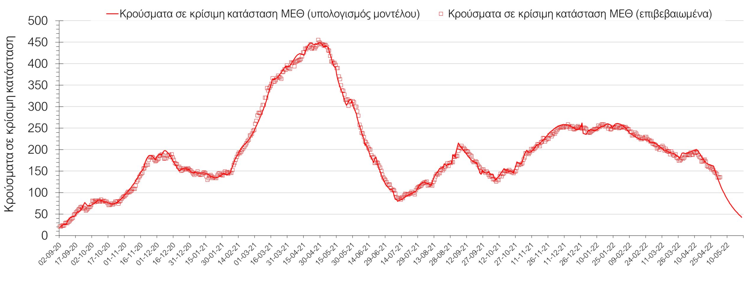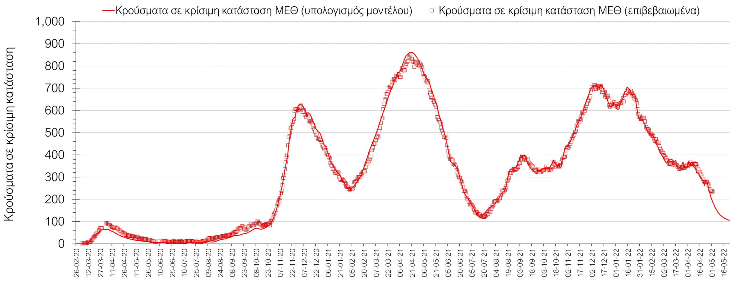 Η πορεία της μέσης εβδομαδιαίας τιμής των κρουσμάτων, καθώς και του κυλιόμενου μέσου όρου 7 ημερών του αριθμού των κρουσμάτων ανά 100.000 πληθυσμού, όπως έχουν καταγραφεί από τον ΕΟΔΥ και η αναμενόμενη πορεία τους, όπως προδιαγράφεται από την υπολογιστική πλατφόρμα CORE για την Ελληνική επικράτεια (όπως και στην Αττική και τη Θεσσαλονίκη) μέχρι τις 15 Μαΐου, αποτυπώνονται στο Σχήμα 4. Αυτή η προβλεπόμενη πορεία, που αφορά τα κρούσματα, τους νοσηλευόμενους σε απλές κλίνες, όσο και σε ΜΕΘ, καθώς επίσης και τους θανάτους, βασίζεται στις ακόλουθες παραδοχές: