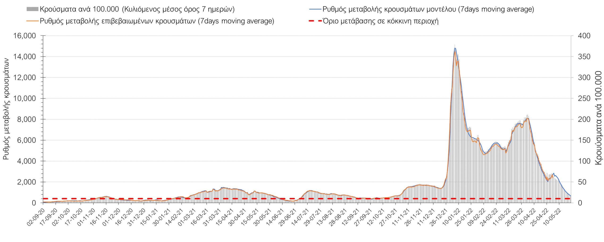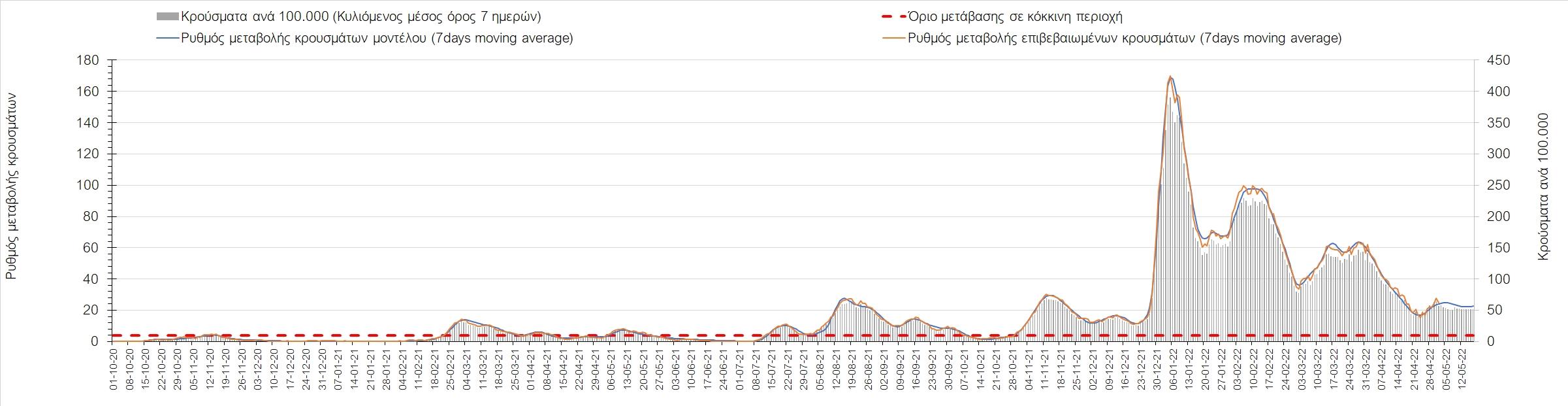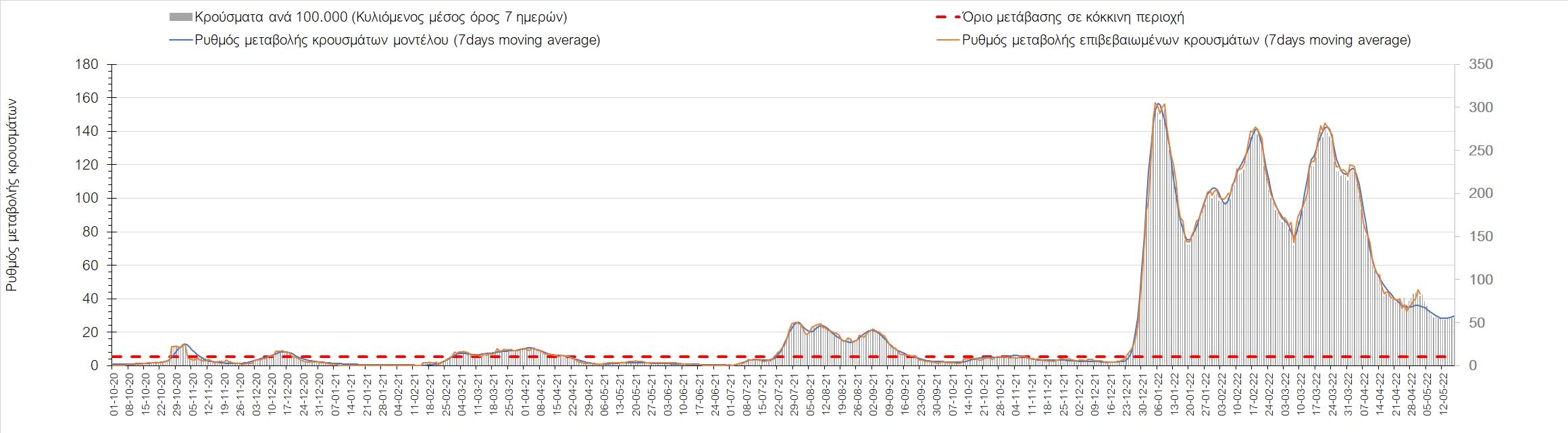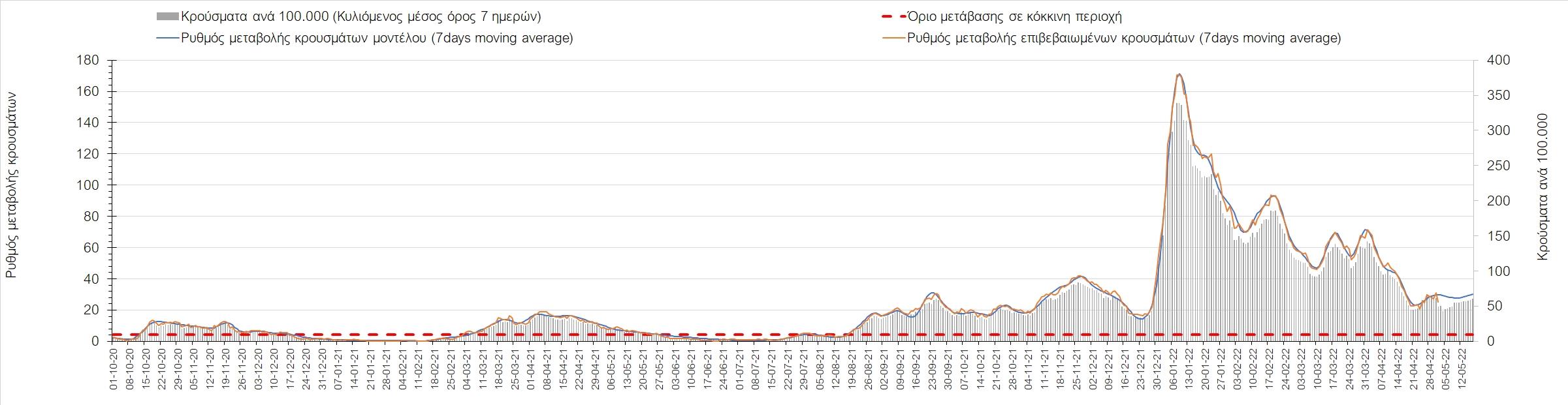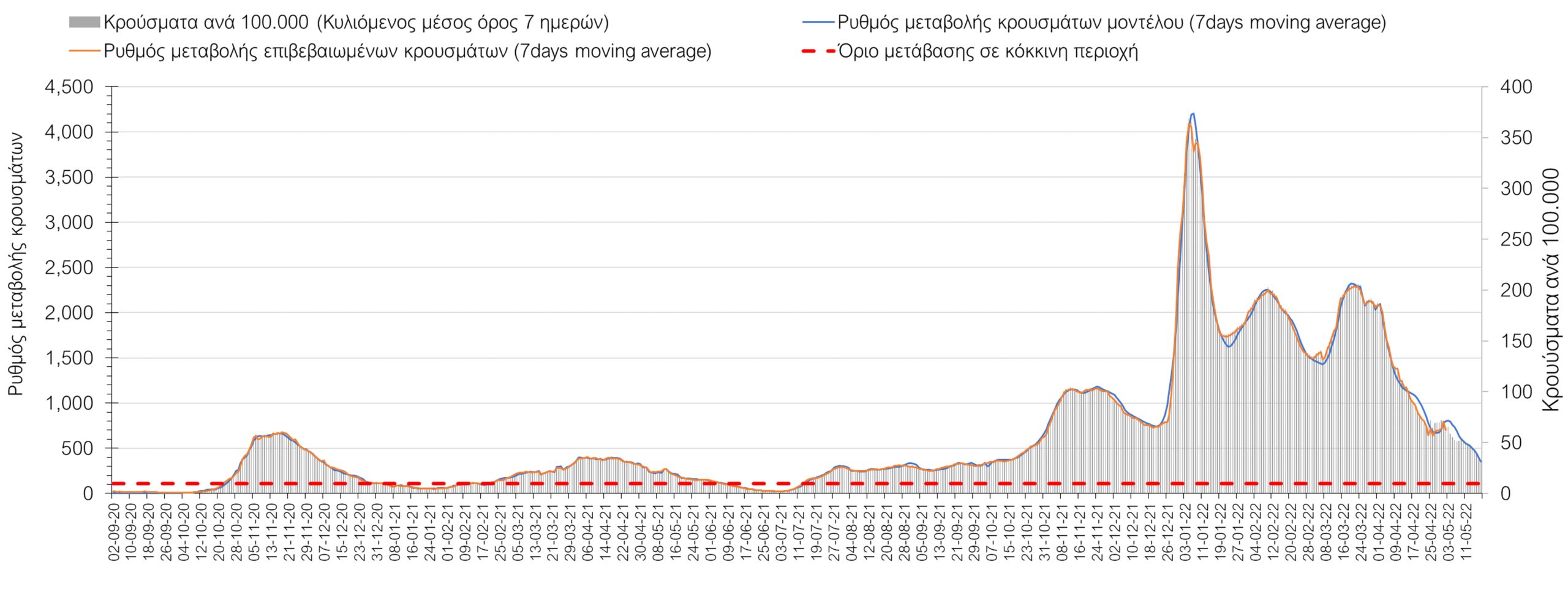 Η πτωτική πορεία των προηγούμενων δύο εβδομάδων έχει δώσει τη θέση της σε προσωρινή αναστροφή και αυτό αντικατοπτρίζεται και στον ημερήσιο αριθμό των κρουσμάτων (κυλιόμενος μέσος όρος 7 ημερών), ο οποίος εμφανίζει μείωση σε σχέση με χθες και παραμένει πάνω από τις 6.500 (6.731). Παρόλο που δεν αναμένεται να έχει διάρκεια μεγαλύτερη από 3-4 ημέρες, για να επανέλθει η συστηματική αποκλιμάκωση της πανδημίας, πέρα από την εφαρμογή των μέτρων (σε συνδυασμό με την σημαντική συνειδητοποίηση εκ μέρους του πληθυσμού ότι χρειάζεται προσοχή και σύνεση για την αντιμετώπιση της διασποράς της παραλλαγής Ο), θα πρέπει να στοχεύσουμε στη διατήρηση και την επέκταση της επίκτητης ανοσίας του πληθυσμού, αλλά και στον μεγάλο αριθμό των τεστ συνολικά (μοριακά, rapid και self-test) που πραγματοποιούνται καθημερινά. Για αυτό το λόγο και με δεδομένη τη μεγάλη διασπορά στα σχολεία θεωρούμε πρόωρη την κατάργηση των self-test στα παιδιά σχολικής ηλικίας με την επιστροφή τους μετά την Πρωτομαγιά, ειδικά σε συνδυασμό με την ανοδική διακύμανση που παρατηρείται.