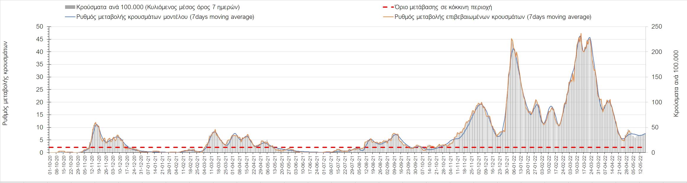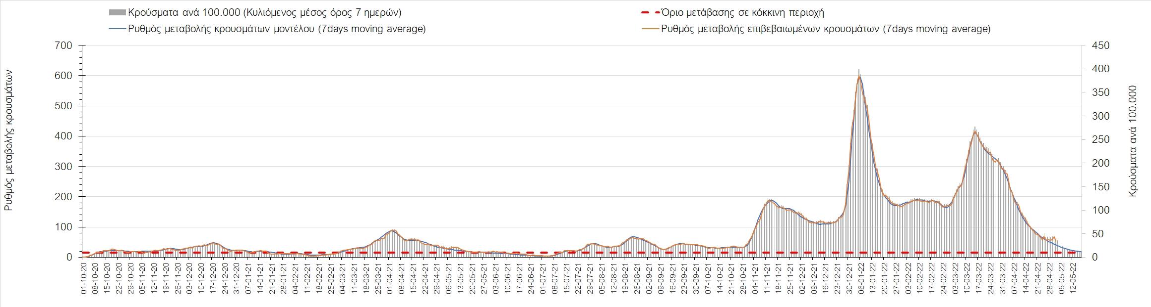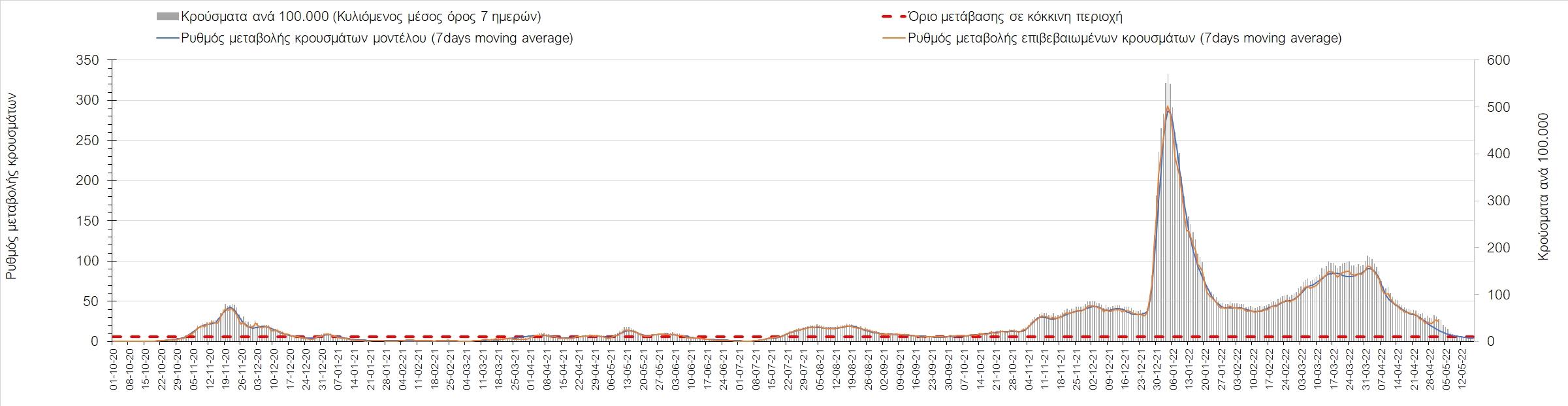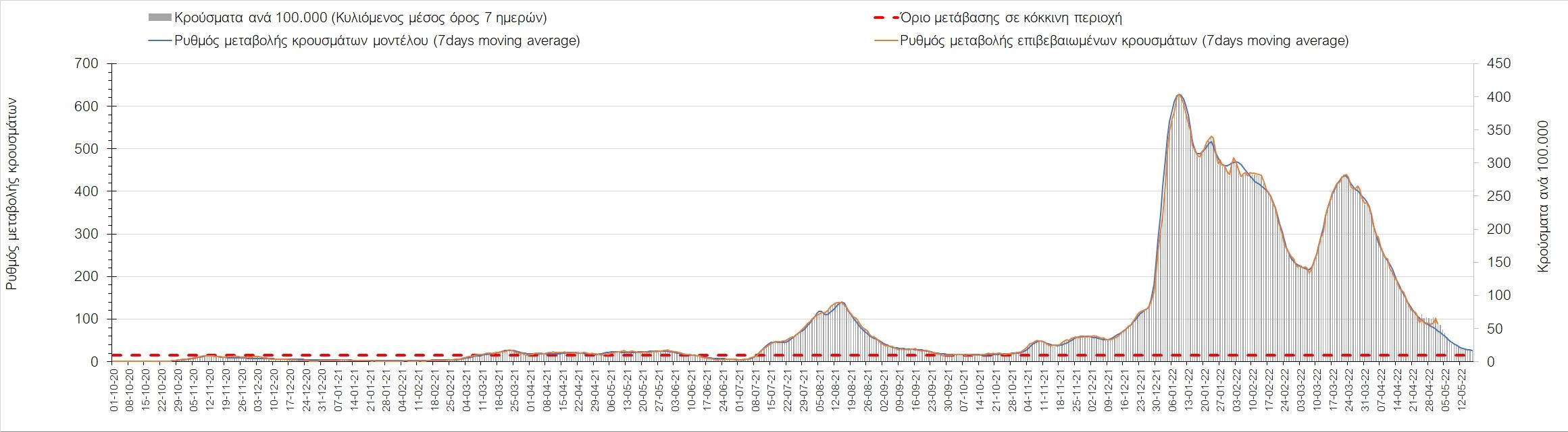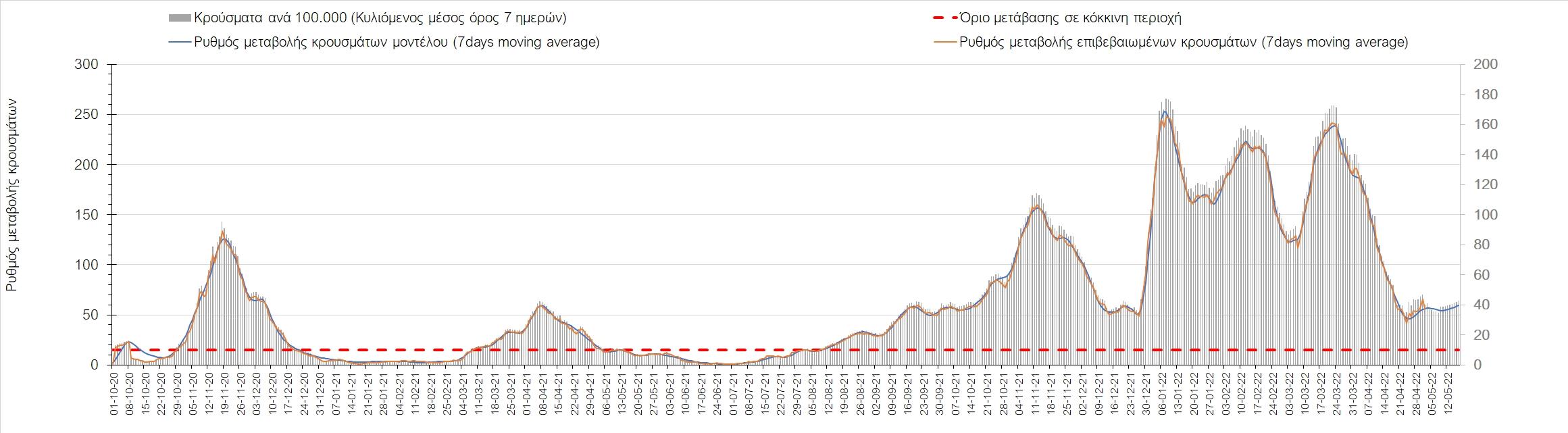 Η πτωτική πορεία των προηγούμενων δύο εβδομάδων έχει δώσει τη θέση της σε προσωρινή αναστροφή και αυτό αντικατοπτρίζεται και στον ημερήσιο αριθμό των κρουσμάτων (κυλιόμενος μέσος όρος 7 ημερών), ο οποίος εμφανίζει μείωση σε σχέση με χθες και παραμένει πάνω από τις 6.500 (6.731). Παρόλο που δεν αναμένεται να έχει διάρκεια μεγαλύτερη από 3-4 ημέρες, για να επανέλθει η συστηματική αποκλιμάκωση της πανδημίας, πέρα από την εφαρμογή των μέτρων (σε συνδυασμό με την σημαντική συνειδητοποίηση εκ μέρους του πληθυσμού ότι χρειάζεται προσοχή και σύνεση για την αντιμετώπιση της διασποράς της παραλλαγής Ο), θα πρέπει να στοχεύσουμε στη διατήρηση και την επέκταση της επίκτητης ανοσίας του πληθυσμού, αλλά και στον μεγάλο αριθμό των τεστ συνολικά (μοριακά, rapid και self-test) που πραγματοποιούνται καθημερινά. Για αυτό το λόγο και με δεδομένη τη μεγάλη διασπορά στα σχολεία θεωρούμε πρόωρη την κατάργηση των self-test στα παιδιά σχολικής ηλικίας με την επιστροφή τους μετά την Πρωτομαγιά, ειδικά σε συνδυασμό με την ανοδική διακύμανση που παρατηρείται.