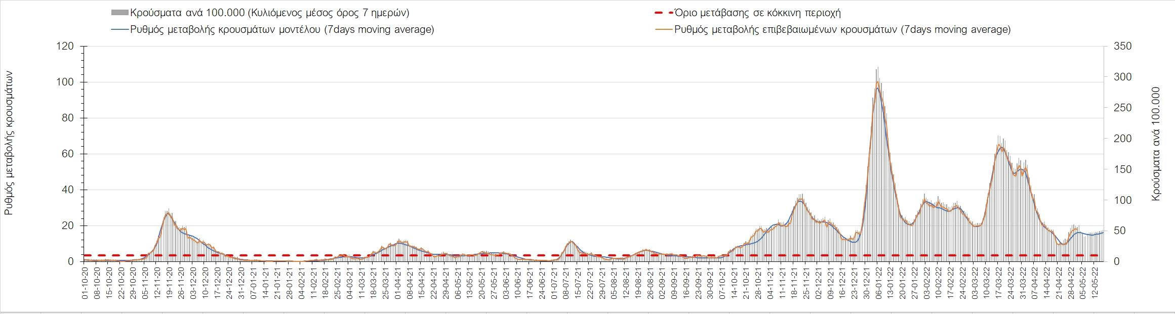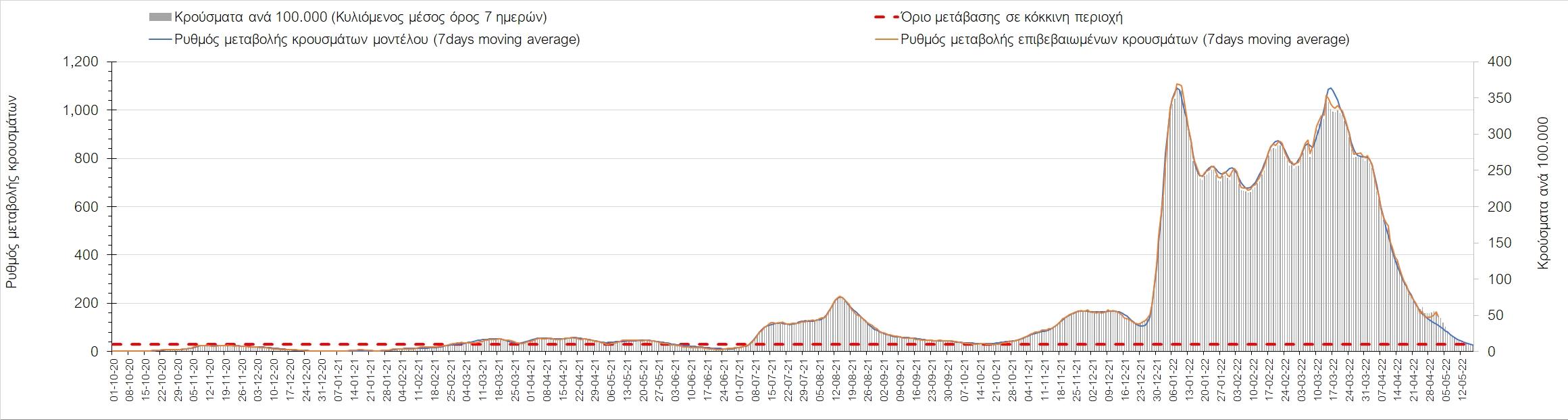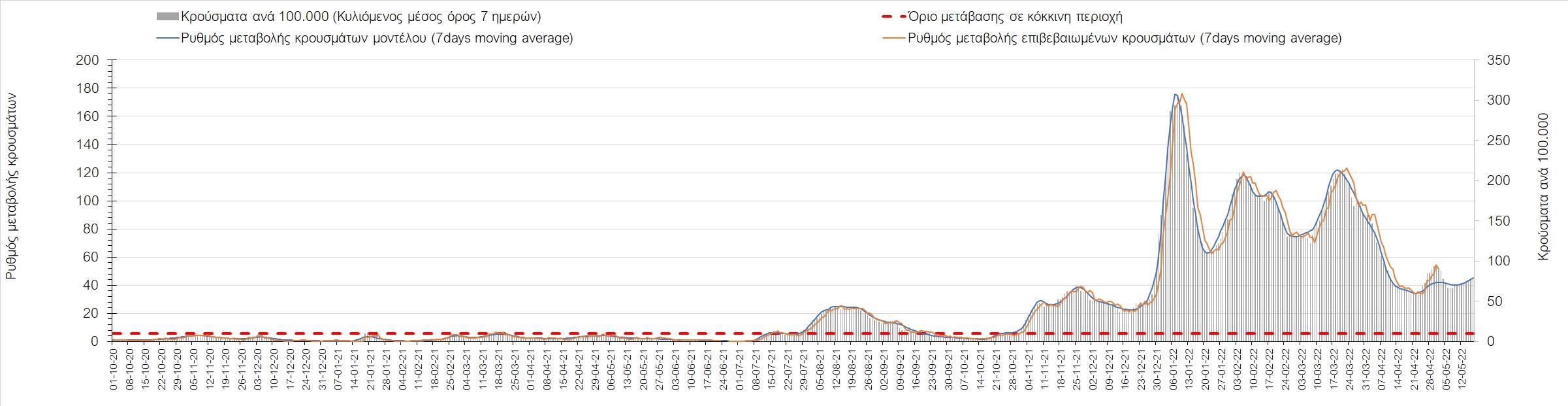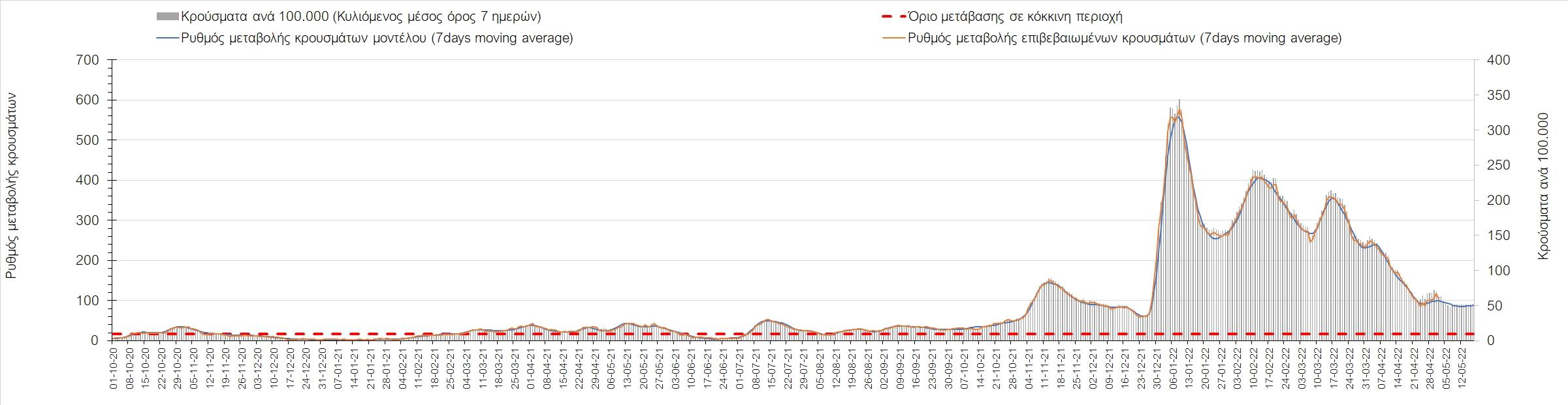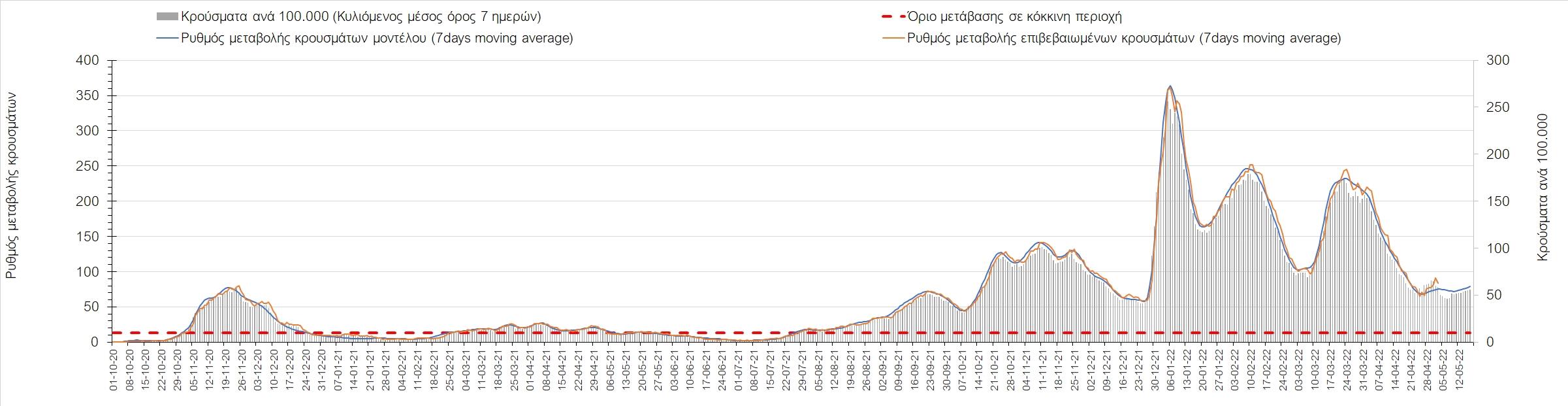 Η πτωτική πορεία των προηγούμενων δύο εβδομάδων έχει δώσει τη θέση της σε προσωρινή αναστροφή και αυτό αντικατοπτρίζεται και στον ημερήσιο αριθμό των κρουσμάτων (κυλιόμενος μέσος όρος 7 ημερών), ο οποίος εμφανίζει μείωση σε σχέση με χθες και παραμένει πάνω από τις 6.500 (6.731). Παρόλο που δεν αναμένεται να έχει διάρκεια μεγαλύτερη από 3-4 ημέρες, για να επανέλθει η συστηματική αποκλιμάκωση της πανδημίας, πέρα από την εφαρμογή των μέτρων (σε συνδυασμό με την σημαντική συνειδητοποίηση εκ μέρους του πληθυσμού ότι χρειάζεται προσοχή και σύνεση για την αντιμετώπιση της διασποράς της παραλλαγής Ο), θα πρέπει να στοχεύσουμε στη διατήρηση και την επέκταση της επίκτητης ανοσίας του πληθυσμού, αλλά και στον μεγάλο αριθμό των τεστ συνολικά (μοριακά, rapid και self-test) που πραγματοποιούνται καθημερινά. Για αυτό το λόγο και με δεδομένη τη μεγάλη διασπορά στα σχολεία θεωρούμε πρόωρη την κατάργηση των self-test στα παιδιά σχολικής ηλικίας με την επιστροφή τους μετά την Πρωτομαγιά, ειδικά σε συνδυασμό με την ανοδική διακύμανση που παρατηρείται.