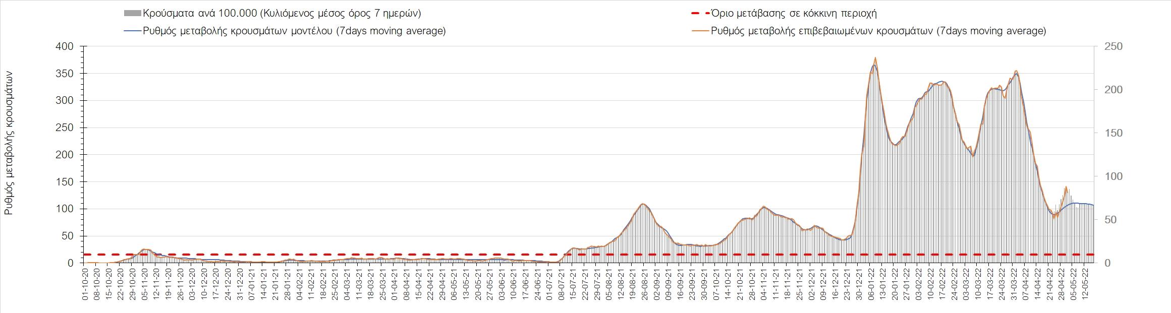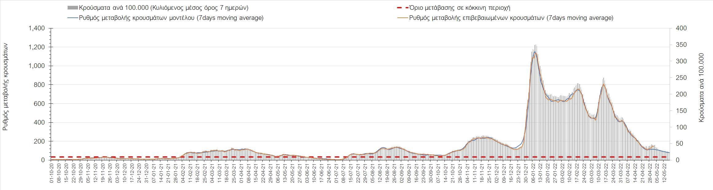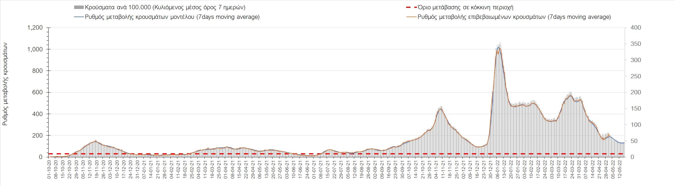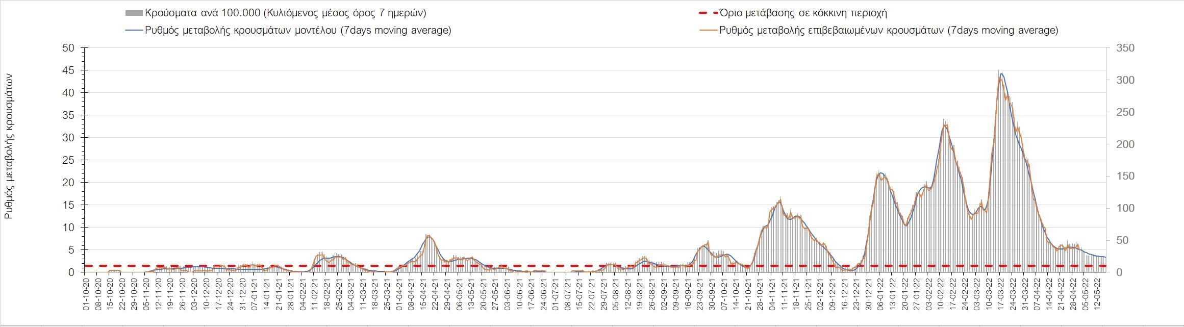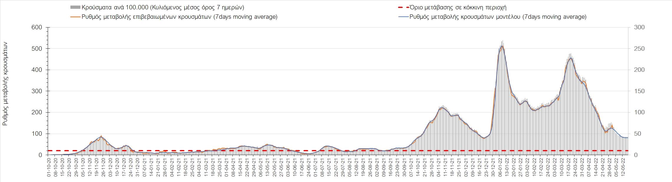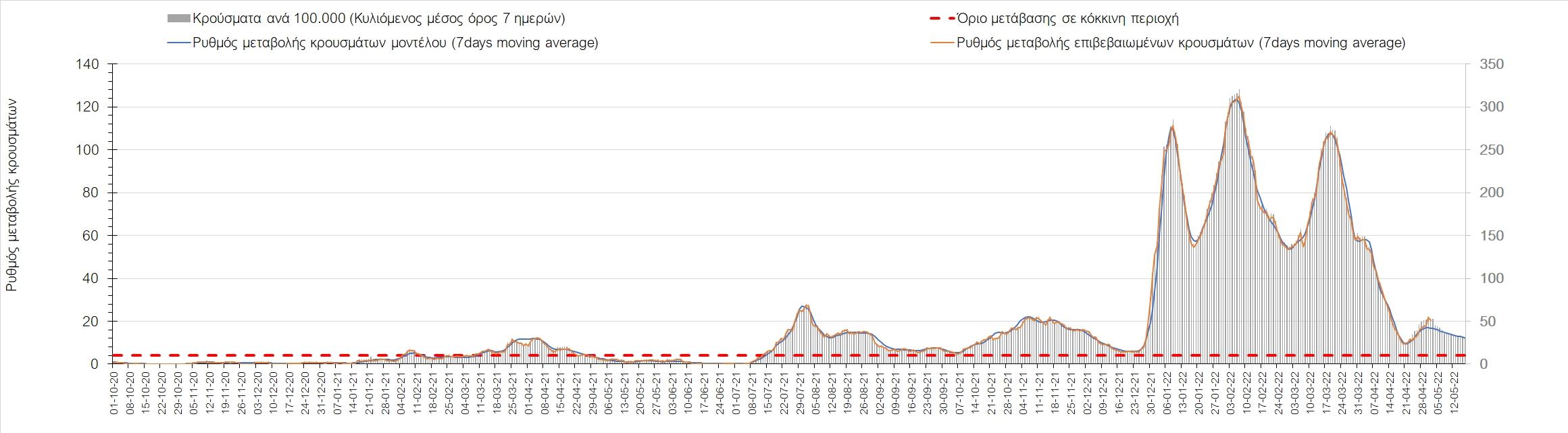 Η πτωτική πορεία των προηγούμενων δύο εβδομάδων έχει δώσει τη θέση της σε προσωρινή αναστροφή και αυτό αντικατοπτρίζεται και στον ημερήσιο αριθμό των κρουσμάτων (κυλιόμενος μέσος όρος 7 ημερών), ο οποίος εμφανίζει μείωση σε σχέση με χθες και παραμένει πάνω από τις 6.500 (6.731). Παρόλο που δεν αναμένεται να έχει διάρκεια μεγαλύτερη από 3-4 ημέρες, για να επανέλθει η συστηματική αποκλιμάκωση της πανδημίας, πέρα από την εφαρμογή των μέτρων (σε συνδυασμό με την σημαντική συνειδητοποίηση εκ μέρους του πληθυσμού ότι χρειάζεται προσοχή και σύνεση για την αντιμετώπιση της διασποράς της παραλλαγής Ο), θα πρέπει να στοχεύσουμε στη διατήρηση και την επέκταση της επίκτητης ανοσίας του πληθυσμού, αλλά και στον μεγάλο αριθμό των τεστ συνολικά (μοριακά, rapid και self-test) που πραγματοποιούνται καθημερινά. Για αυτό το λόγο και με δεδομένη τη μεγάλη διασπορά στα σχολεία θεωρούμε πρόωρη την κατάργηση των self-test στα παιδιά σχολικής ηλικίας με την επιστροφή τους μετά την Πρωτομαγιά, ειδικά σε συνδυασμό με την ανοδική διακύμανση που παρατηρείται.