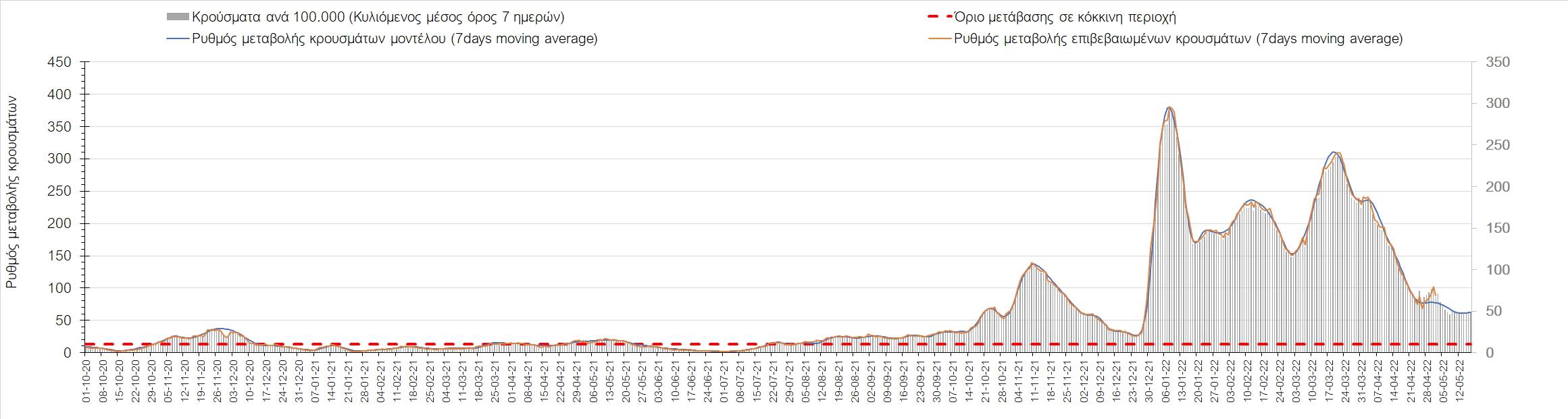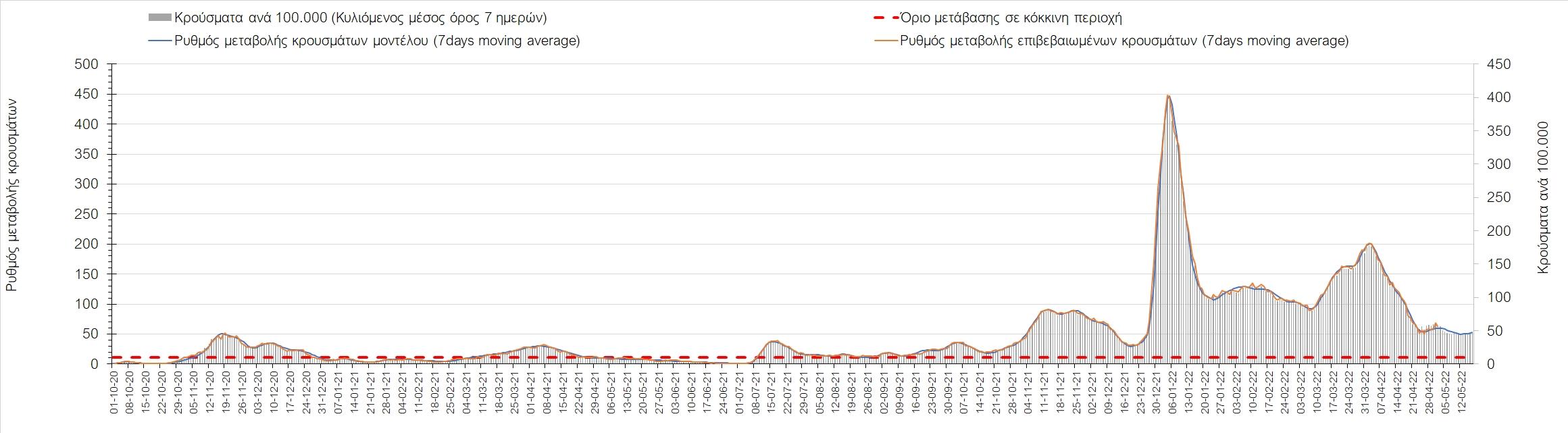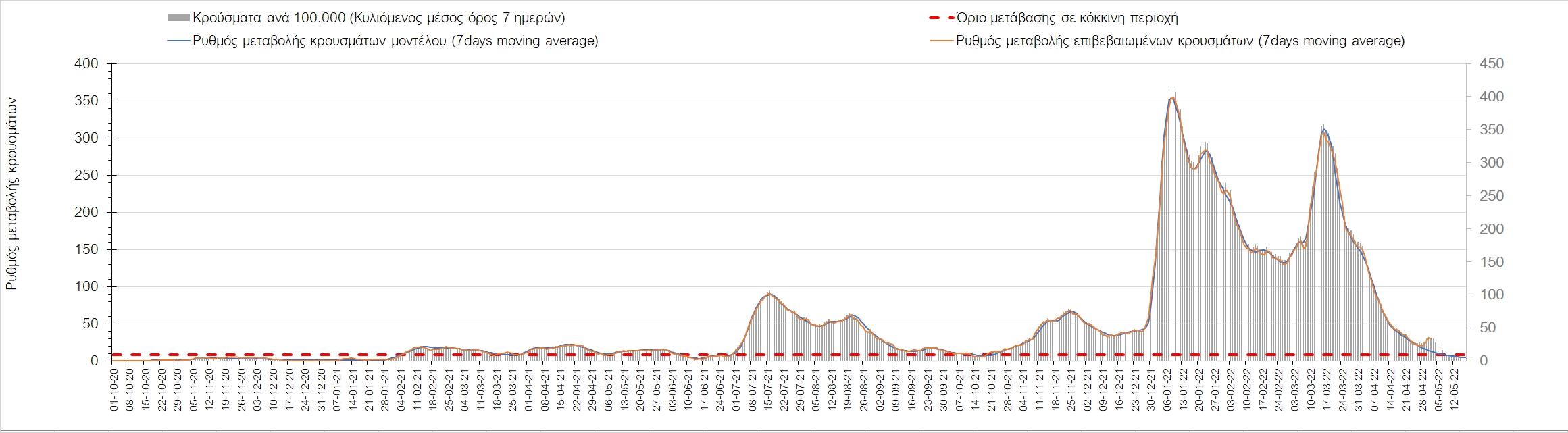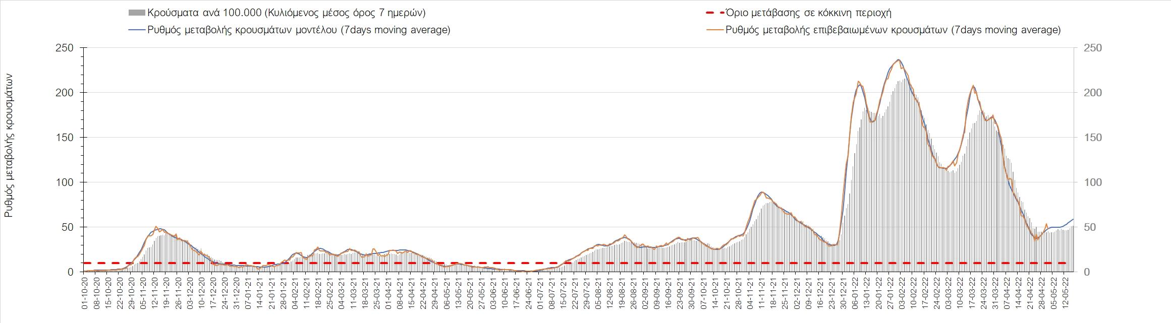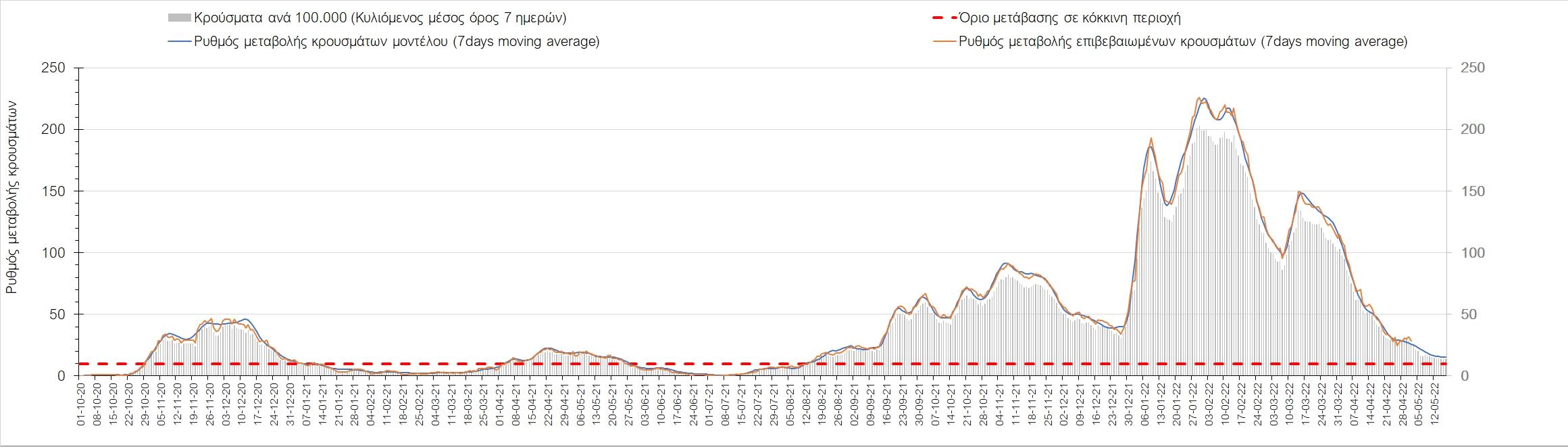 Η πτωτική πορεία των προηγούμενων δύο εβδομάδων έχει δώσει τη θέση της σε προσωρινή αναστροφή και αυτό αντικατοπτρίζεται και στον ημερήσιο αριθμό των κρουσμάτων (κυλιόμενος μέσος όρος 7 ημερών), ο οποίος εμφανίζει μείωση σε σχέση με χθες και παραμένει πάνω από τις 6.500 (6.731). Παρόλο που δεν αναμένεται να έχει διάρκεια μεγαλύτερη από 3-4 ημέρες, για να επανέλθει η συστηματική αποκλιμάκωση της πανδημίας, πέρα από την εφαρμογή των μέτρων (σε συνδυασμό με την σημαντική συνειδητοποίηση εκ μέρους του πληθυσμού ότι χρειάζεται προσοχή και σύνεση για την αντιμετώπιση της διασποράς της παραλλαγής Ο), θα πρέπει να στοχεύσουμε στη διατήρηση και την επέκταση της επίκτητης ανοσίας του πληθυσμού, αλλά και στον μεγάλο αριθμό των τεστ συνολικά (μοριακά, rapid και self-test) που πραγματοποιούνται καθημερινά. Για αυτό το λόγο και με δεδομένη τη μεγάλη διασπορά στα σχολεία θεωρούμε πρόωρη την κατάργηση των self-test στα παιδιά σχολικής ηλικίας με την επιστροφή τους μετά την Πρωτομαγιά, ειδικά σε συνδυασμό με την ανοδική διακύμανση που παρατηρείται.