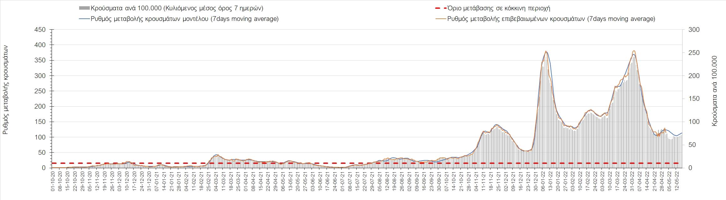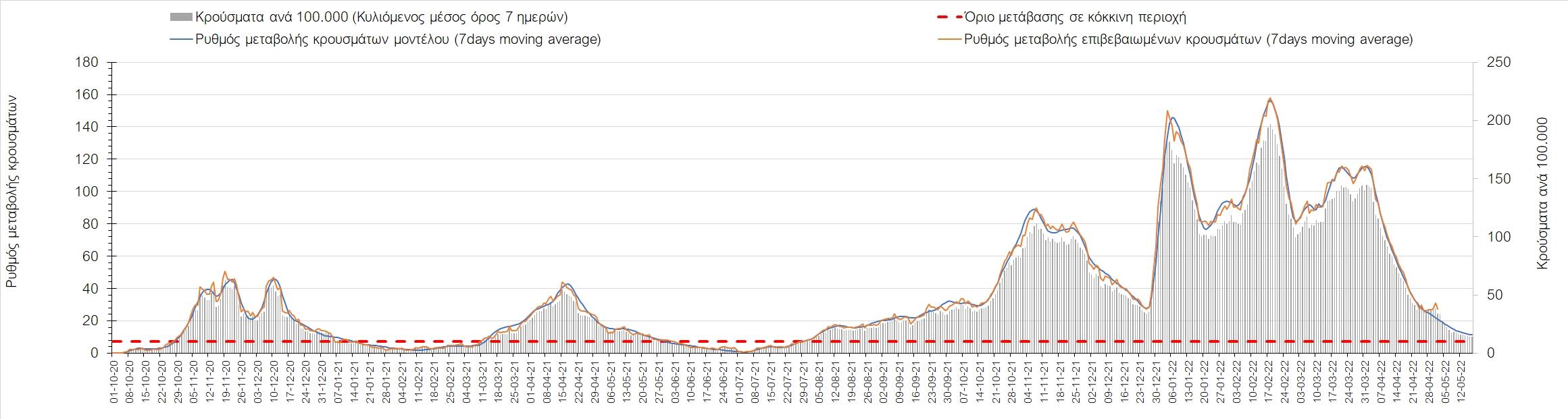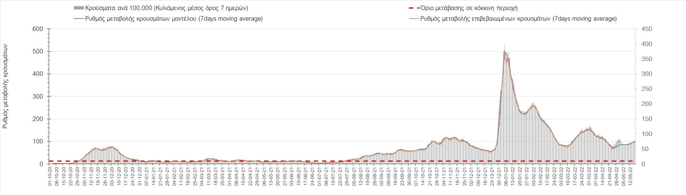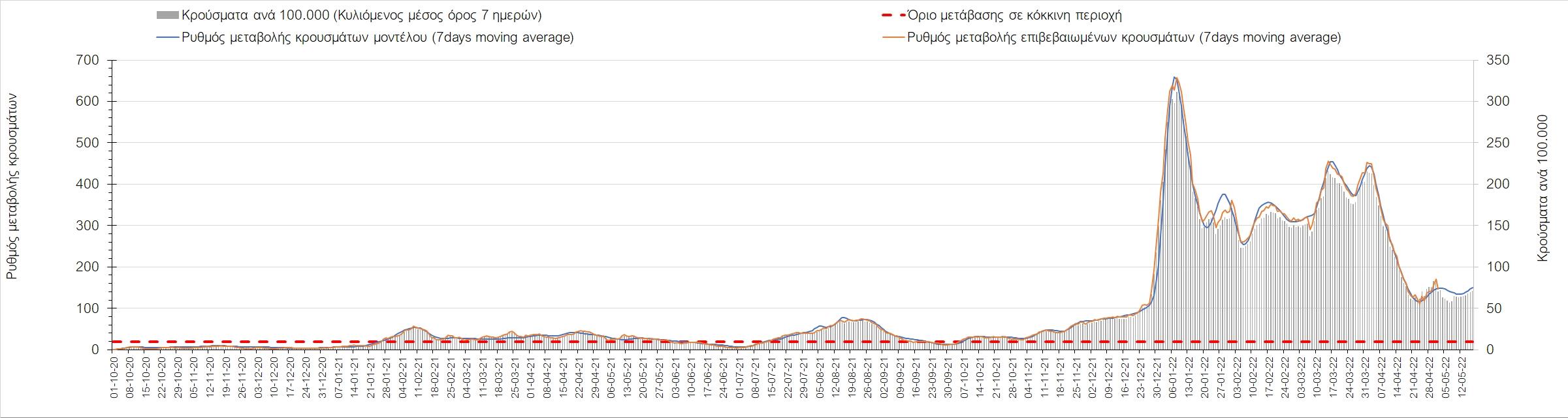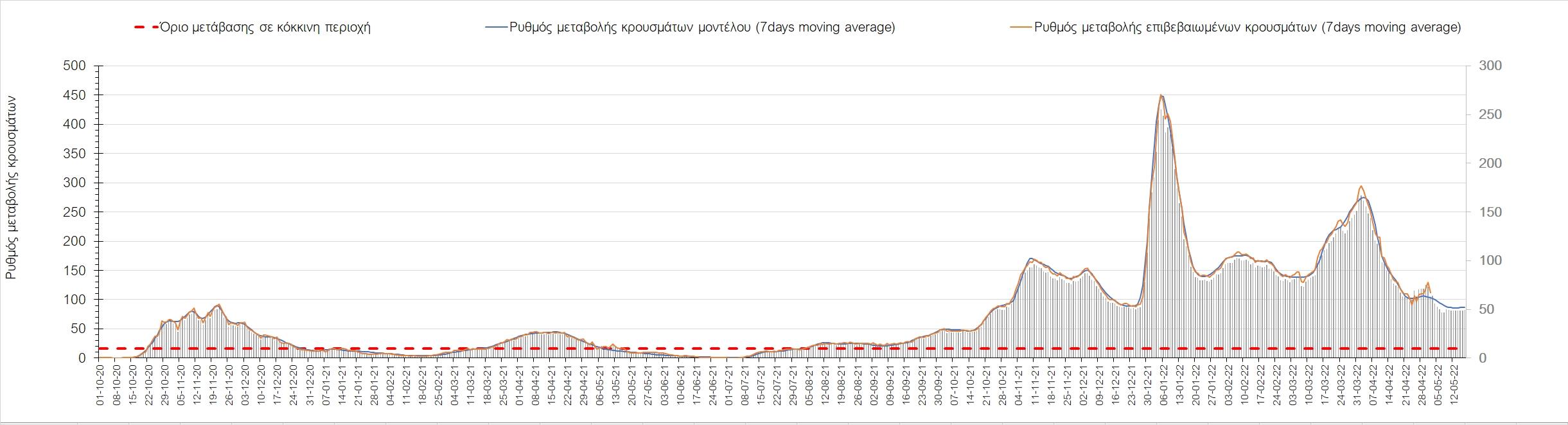 Η πτωτική πορεία των προηγούμενων δύο εβδομάδων έχει δώσει τη θέση της σε προσωρινή αναστροφή και αυτό αντικατοπτρίζεται και στον ημερήσιο αριθμό των κρουσμάτων (κυλιόμενος μέσος όρος 7 ημερών), ο οποίος εμφανίζει μείωση σε σχέση με χθες και παραμένει πάνω από τις 6.500 (6.731). Παρόλο που δεν αναμένεται να έχει διάρκεια μεγαλύτερη από 3-4 ημέρες, για να επανέλθει η συστηματική αποκλιμάκωση της πανδημίας, πέρα από την εφαρμογή των μέτρων (σε συνδυασμό με την σημαντική συνειδητοποίηση εκ μέρους του πληθυσμού ότι χρειάζεται προσοχή και σύνεση για την αντιμετώπιση της διασποράς της παραλλαγής Ο), θα πρέπει να στοχεύσουμε στη διατήρηση και την επέκταση της επίκτητης ανοσίας του πληθυσμού, αλλά και στον μεγάλο αριθμό των τεστ συνολικά (μοριακά, rapid και self-test) που πραγματοποιούνται καθημερινά. Για αυτό το λόγο και με δεδομένη τη μεγάλη διασπορά στα σχολεία θεωρούμε πρόωρη την κατάργηση των self-test στα παιδιά σχολικής ηλικίας με την επιστροφή τους μετά την Πρωτομαγιά, ειδικά σε συνδυασμό με την ανοδική διακύμανση που παρατηρείται.