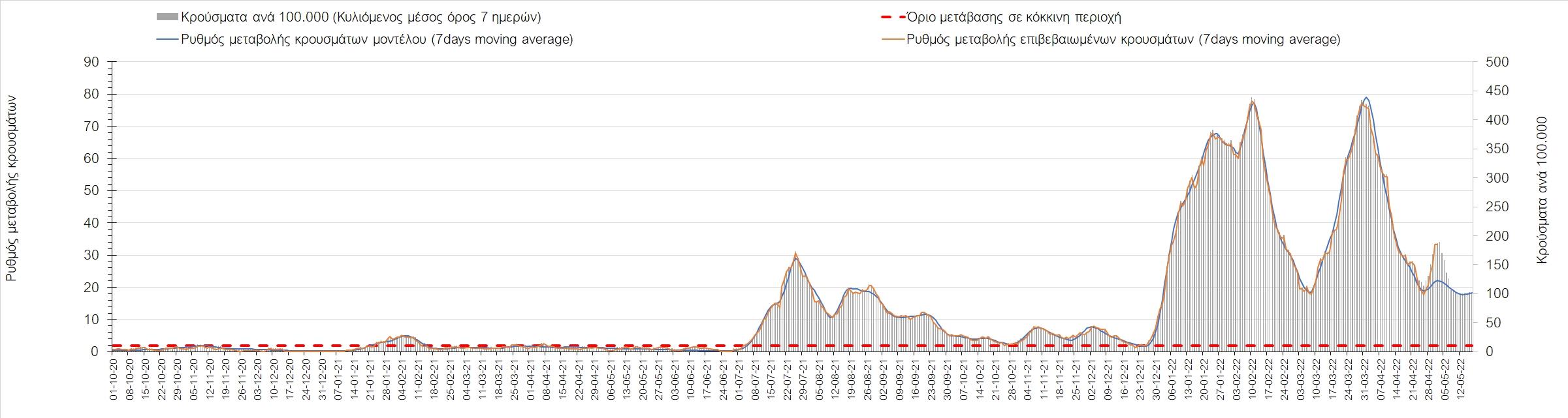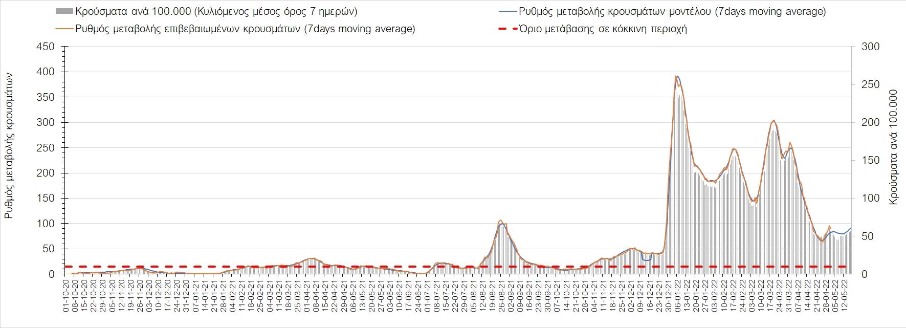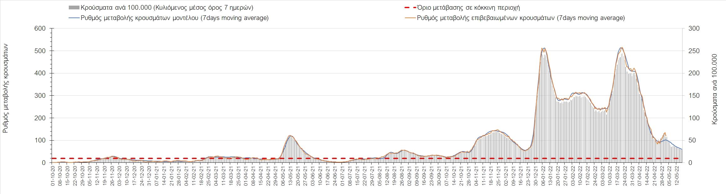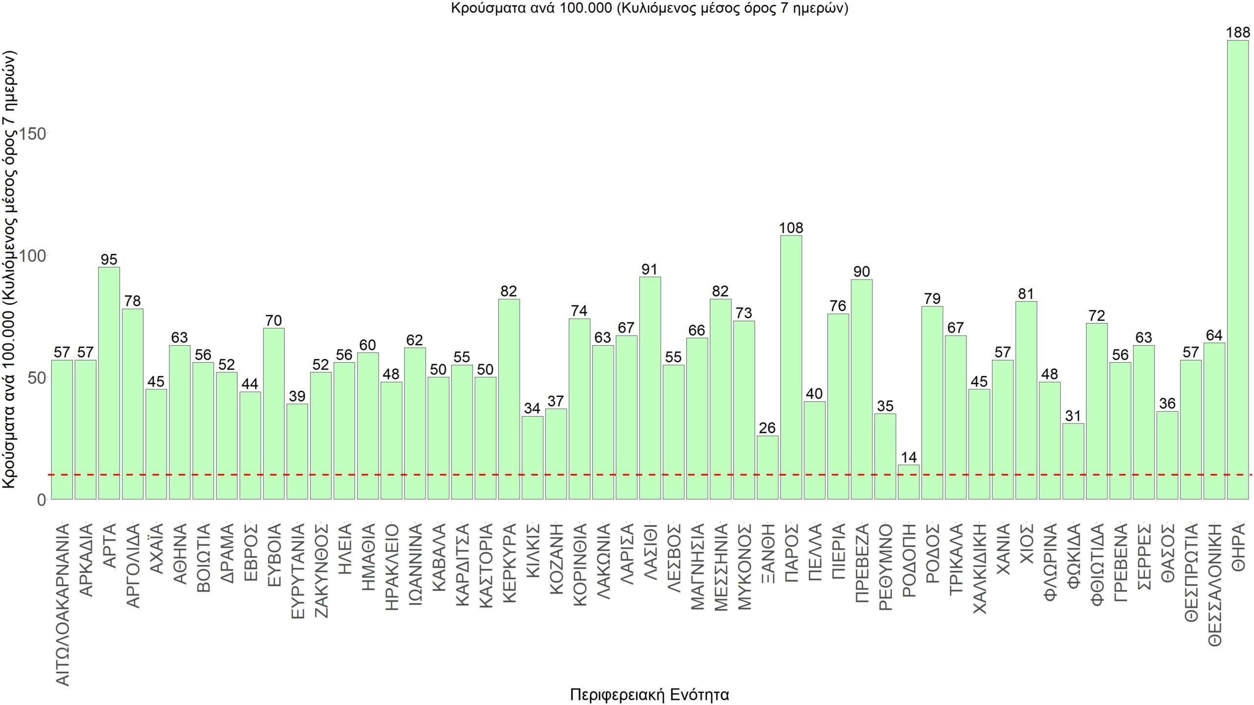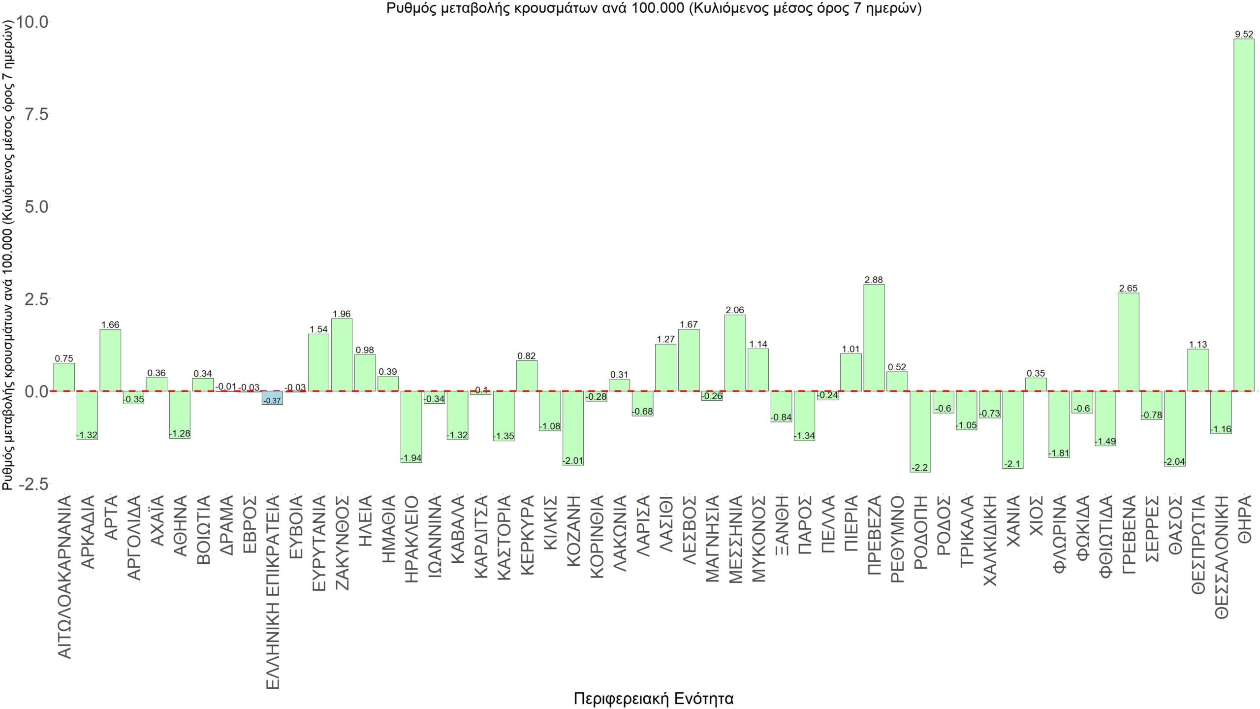 Η αποτύπωση των τάσεων στις επιμέρους περιοχές, παρουσιάζεται στο Σχήμα 61, όπου παρουσιάζεται ο ρυθμός μεταβολής των νέων κρουσμάτων ανά 100.000 κατοίκους (κυλιόμενος μέσος όρος 7 ημερών) των επιμέρους περιοχών. Θετικές τιμές του ρυθμού μεταβολής υποδηλώνουν άνοδο, ενώ αρνητικές τιμές υποδηλώνουν πτωτική πορεία.