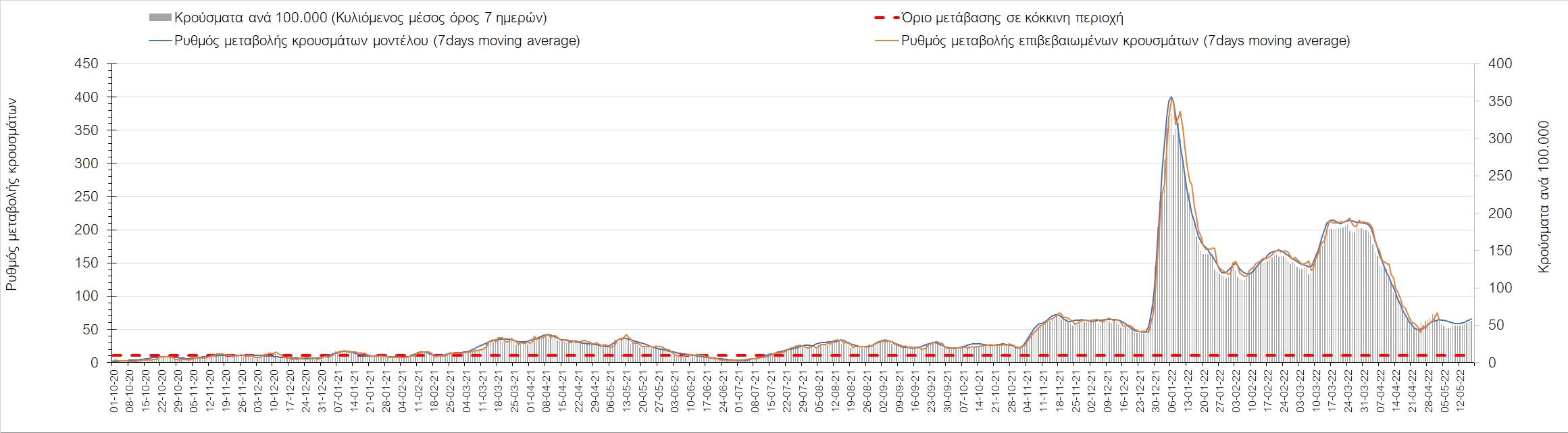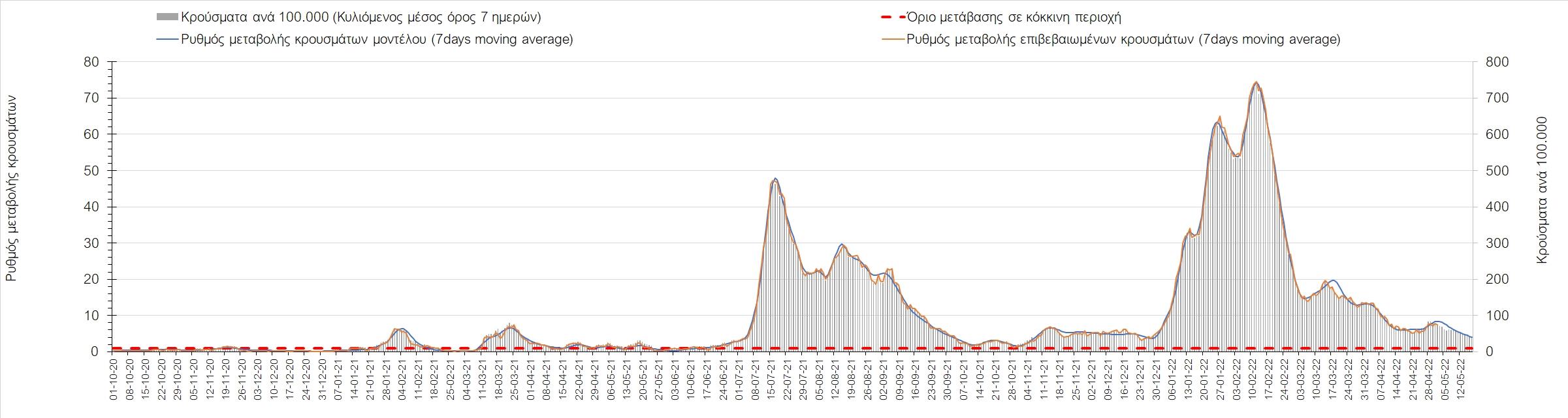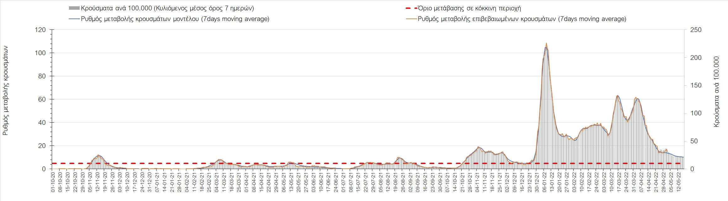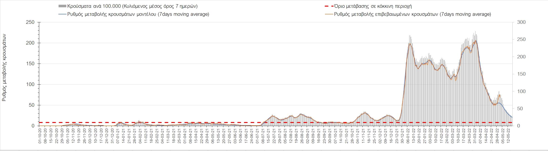 Η αποτύπωση των τάσεων στις επιμέρους περιοχές, παρουσιάζεται στο Σχήμα 61, όπου παρουσιάζεται ο ρυθμός μεταβολής των νέων κρουσμάτων ανά 100.000 κατοίκους (κυλιόμενος μέσος όρος 7 ημερών) των επιμέρους περιοχών. Θετικές τιμές του ρυθμού μεταβολής υποδηλώνουν άνοδο, ενώ αρνητικές τιμές υποδηλώνουν πτωτική πορεία.