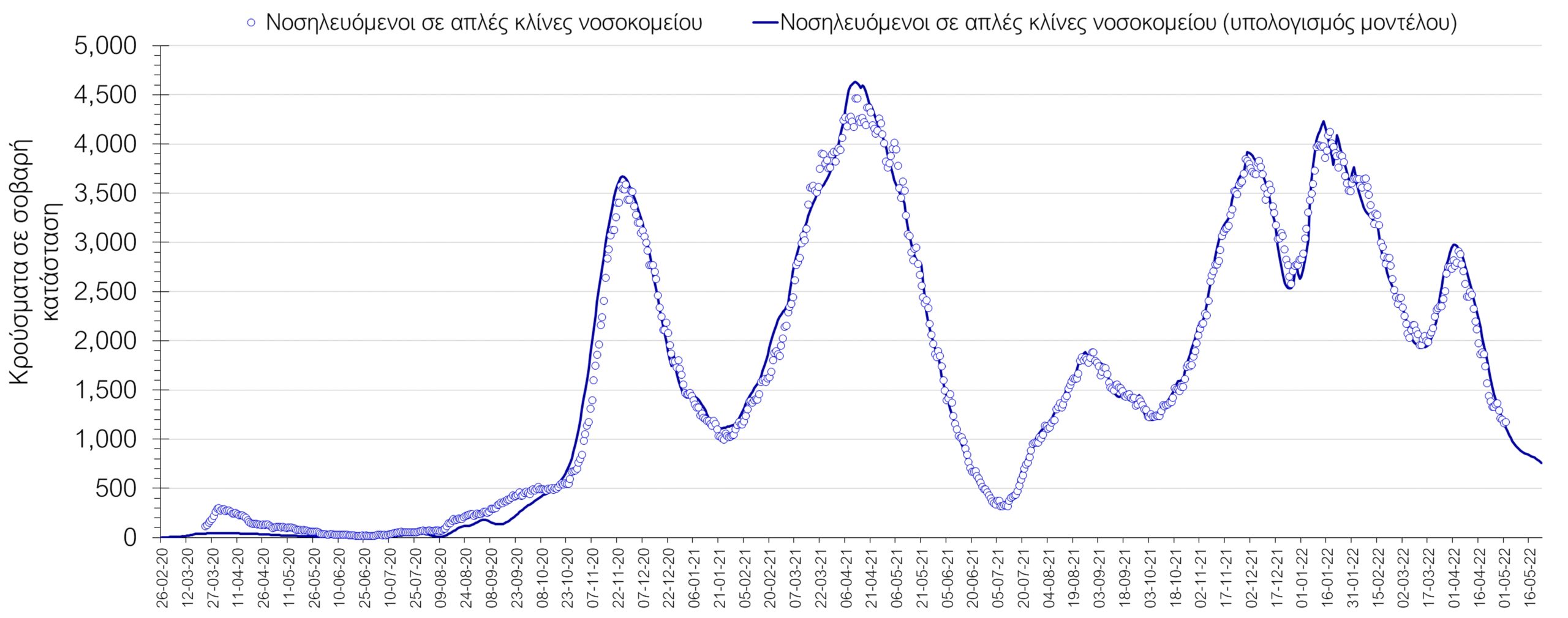 Σχήμα 2. Αριθμός κρουσμάτων σε σοβαρή κατάσταση (νοσηλευόμενοι σε απλές κλίνες) σύμφωνα με τα στοιχεία του ΕΟΔΥ και τις προβλέψεις της υπολογιστικής πλατφόρμας CORE.
