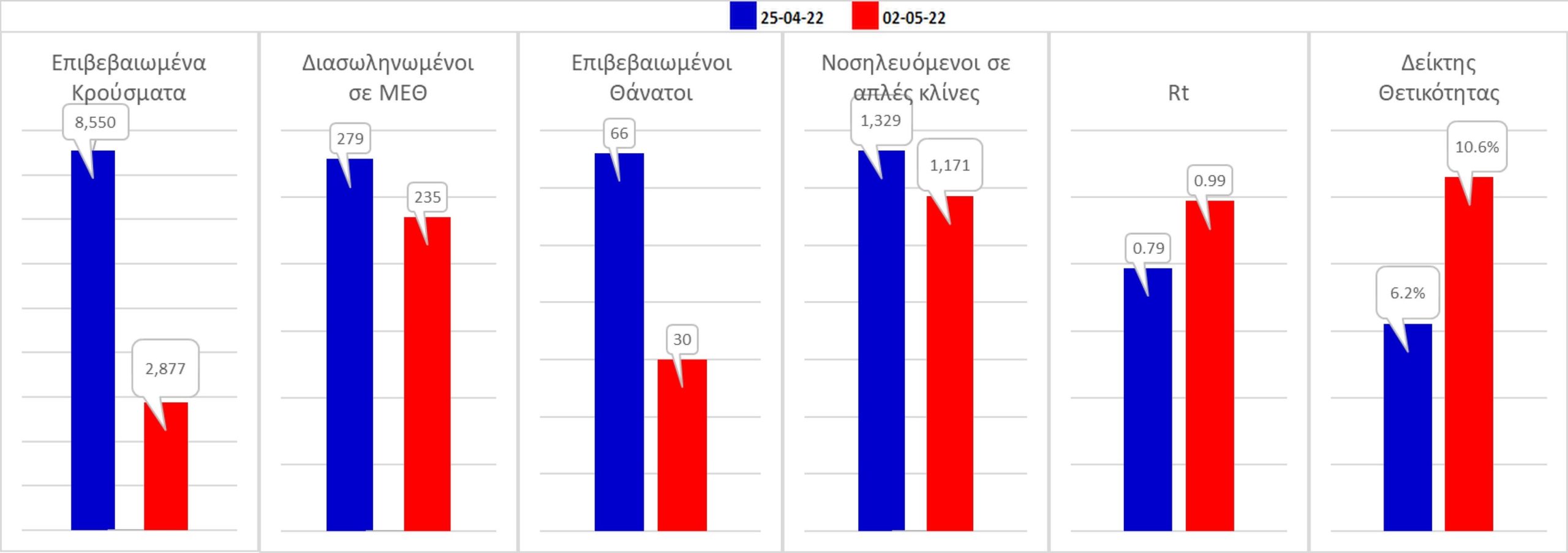 Σχήμα 59. Συγκριτικά αποτελέσματα της επιδημιολογικής εικόνας της Δευτέρας (02/05/2022) σε σχέση με την προηγούμενη (25/04/2022)