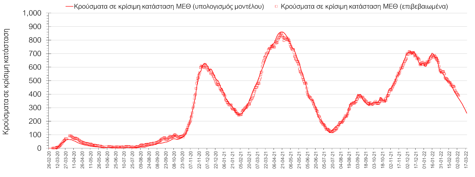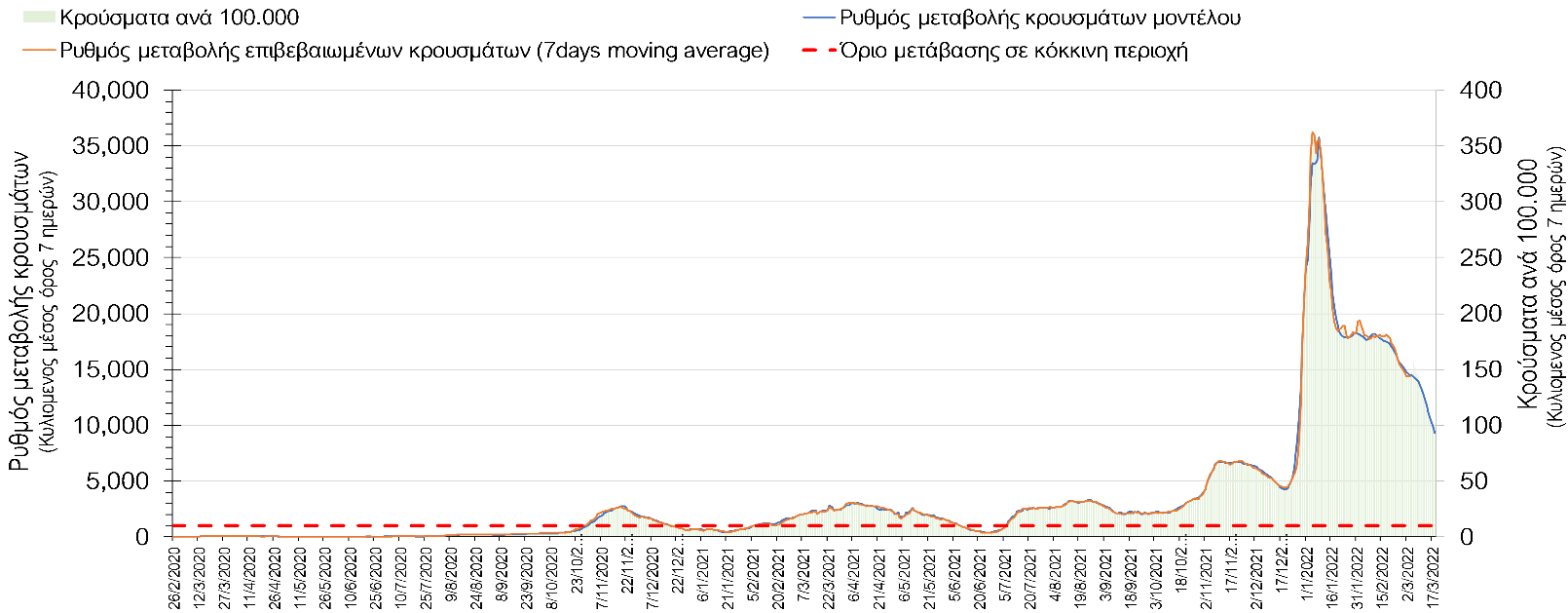 Η πορεία της μέσης εβδομαδιαίας τιμής των κρουσμάτων, καθώς και του κυλιόμενου μέσου όρου 7 ημερών του αριθμού των κρουσμάτων ανά 100.000 πληθυσμού, όπως έχουν καταγραφεί από τον ΕΟΔΥ και η αναμενόμενη πορεία τους, όπως προδιαγράφεται από την υπολογιστική πλατφόρμα CORE για την Ελληνική επικράτεια (όπως και στην Αττική και τη Θεσσαλονίκη) μέχρι τις 15 Μαρτίου, αποτυπώνονται στο Σχήμα 4. Αυτή η προβλεπόμενη πορεία, που αφορά τα κρούσματα, τους νοσηλευόμενους σε απλές κλίνες, όσο και σε ΜΕΘ, καθώς επίσης και τους θανάτους, βασίζεται στις ακόλουθες παραδοχές: