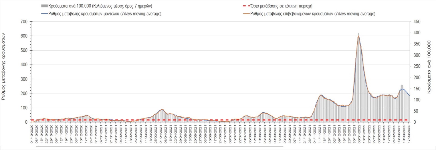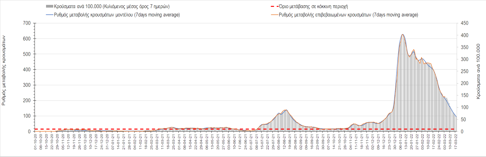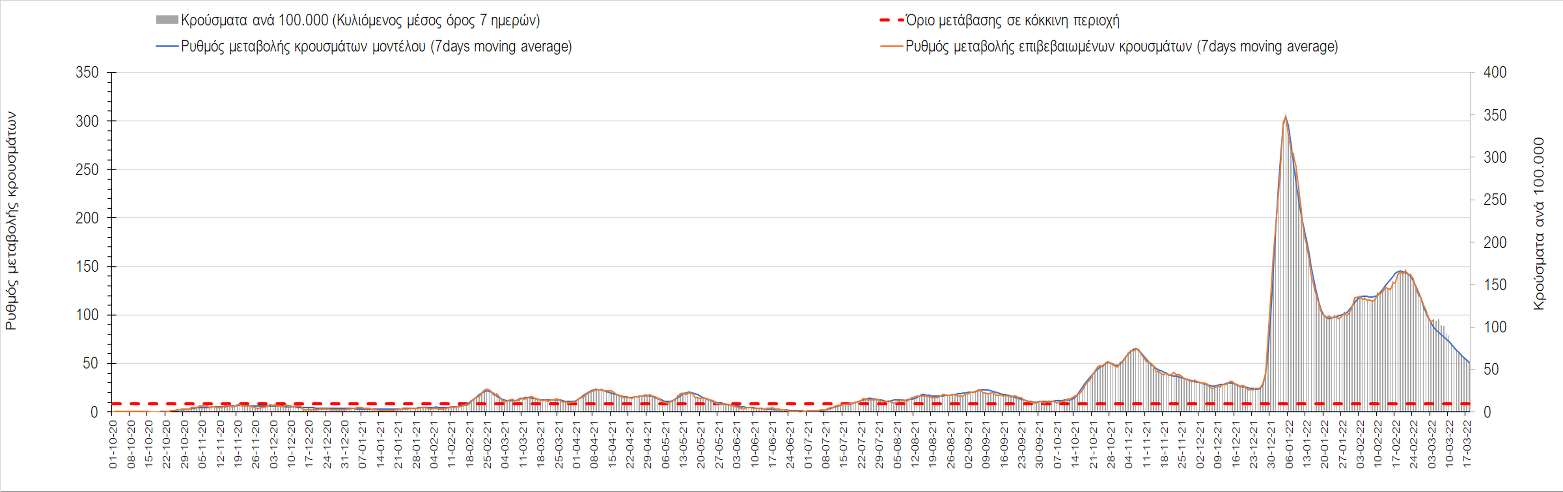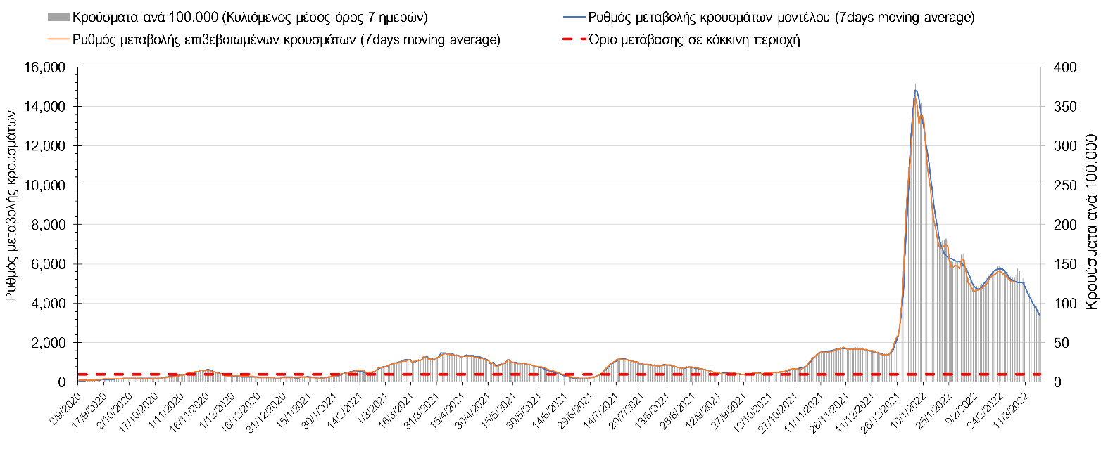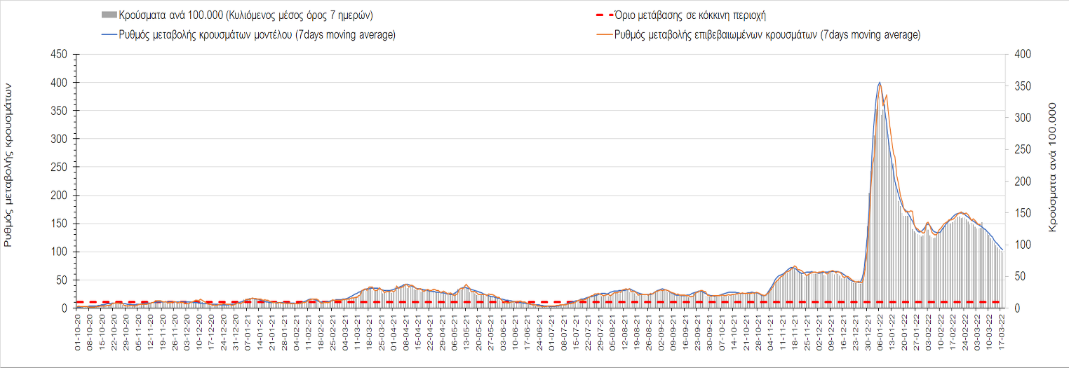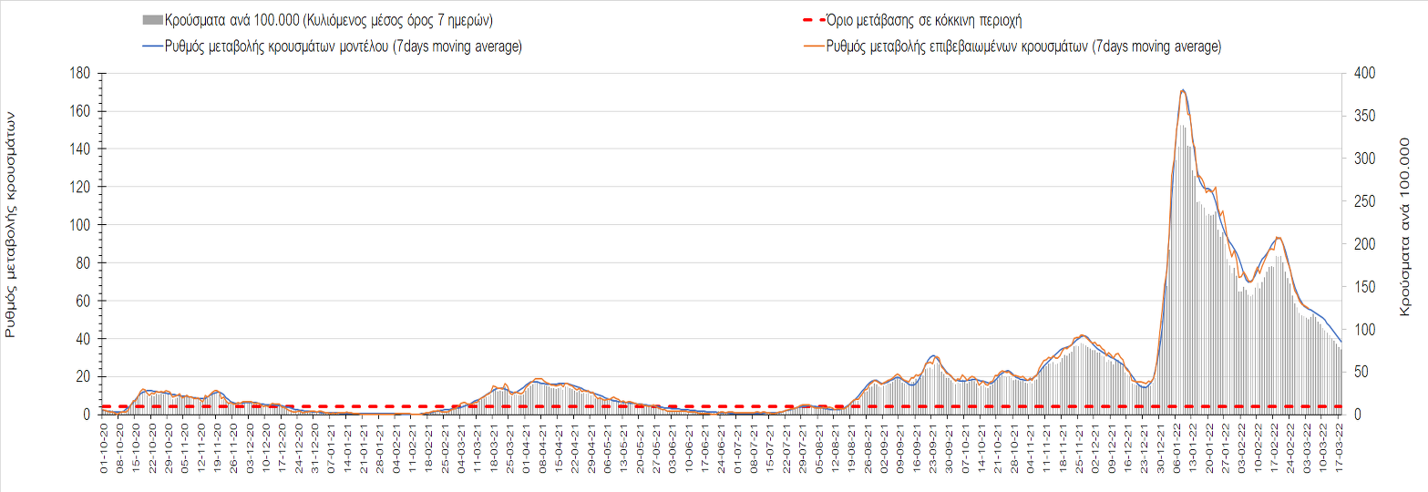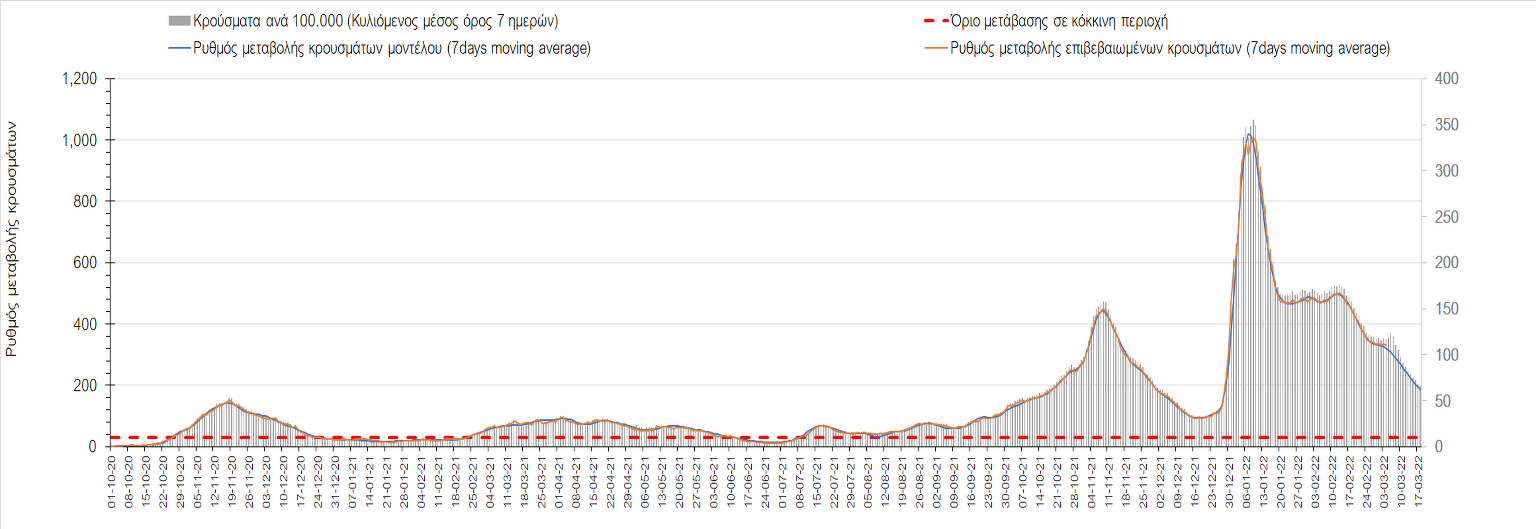 Δυστυχώς και πάλι παρατηρείται πολύ έντονη επιβράδυνση της αποκλιμάκωσης και φαίνεται να δημιουργείται προσωρινά σταθεροποιητική πορεία που αντικατοπτρίζεται και στον ημερήσιο αριθμό των κρουσμάτων (κυλιόμενος μέσος όρος 7 ημερών), ο οποίος παραμένει πάνω από τις 14.000 (14.421). Για να επανέλθει η ταχεία αποκλιμάκωση της πανδημίας, πέρα από την εφαρμογή των μέτρων (σε συνδυασμό με την σημαντική συνειδητοποίηση εκ μέρους του πληθυσμού ότι χρειάζεται προσοχή και σύνεση για την αντιμετώπιση της διασποράς της παραλλαγής Ο), θα πρέπει να στοχεύσουμε στη διατήρηση και την επέκταση της επίκτητης ανοσίας του πληθυσμού, αλλά και στον πολύ μεγάλο αριθμό των τεστ συνολικά (μοριακά, rapid και self-test) που πραγματοποιούνται καθημερινά, των οποίων ο αριθμός έχει φθάσει σε ημερήσια βάση τις 700.000. Αυτά σε συνδυασμό με τη φυσική ανοσία του πληθυσμού μετά από νόσηση, θα συντελέσουν στην συστηματική αποκλιμάκωση της πανδημίας. Αντίθετα, με τον υπάρχοντα ρυθμό εμβολιασμού αναμνηστικών δόσεων, έχει ήδη καθυστερήσει να επέλθει η πορεία αποκλιμάκωσης. Η τήρηση των μέτρων είναι ιδιαίτερα σημαντική, γιατί σε κάποιες περιοχές, λόγω της χαλάρωσης των μέτρων στην εστίαση, παρατηρείται επιβράδυνση του ρυθμού αποκλιμάκωσης, με ποιο έντονα τα φαινόμενα αυτά στο σύνολο της Κρήτης, στη Θεσσαλονίκη, αλλά και σε επιμέρους άλλες περιοχές. Παρόλο που η συνολική δυναμική της πανδημίας δε θα μπορούσε να αναστραφεί με τη δεδομένη ανοσία, αριθμό τεστ και μετεωρολογικές συνθήκες, χρειάζεται ακόμα σύνεση στην εφαρμογή των μέτρων για να αποφευχθεί περαιτέρω καθυστέρηση της συστηματικής αποκλιμάκωσης.