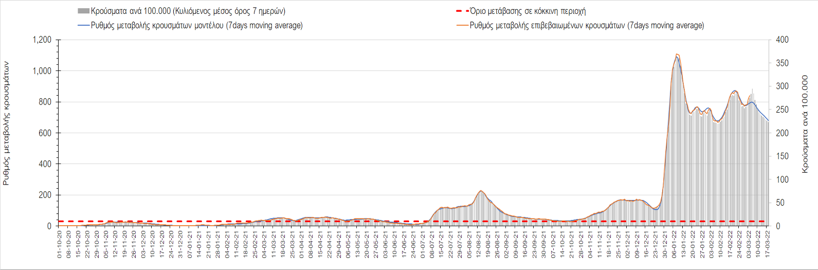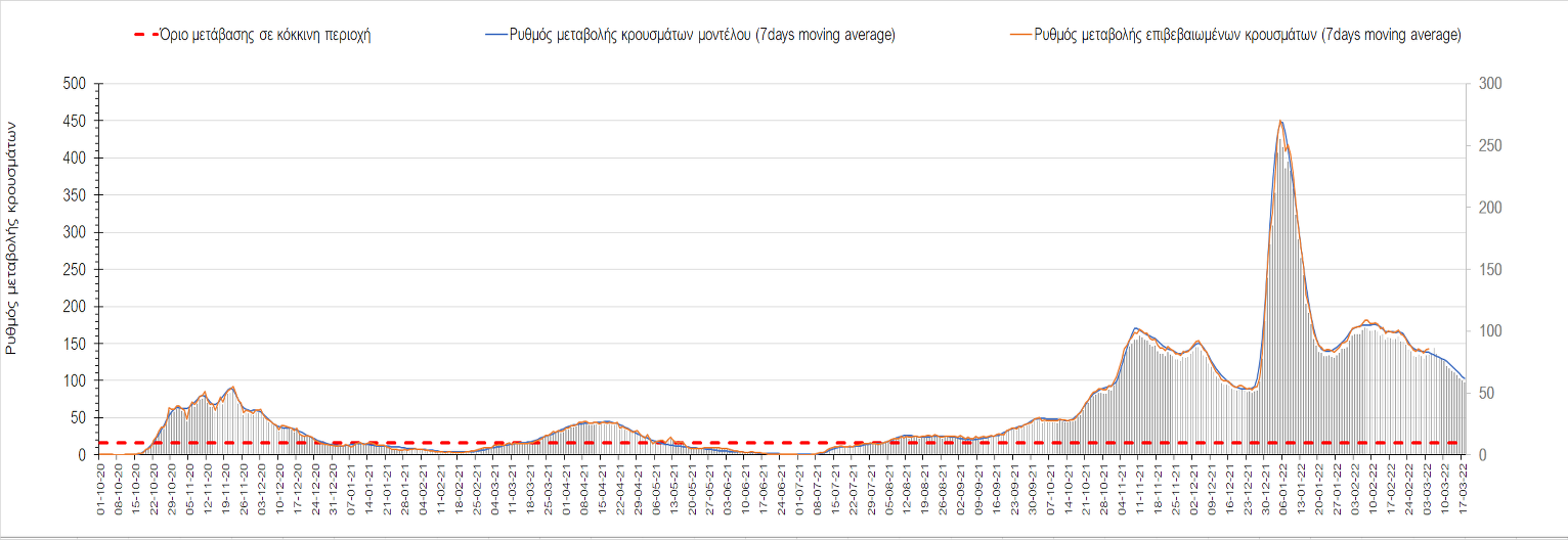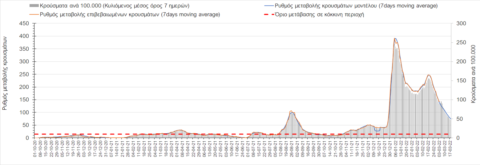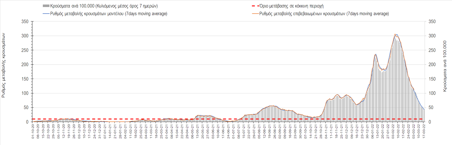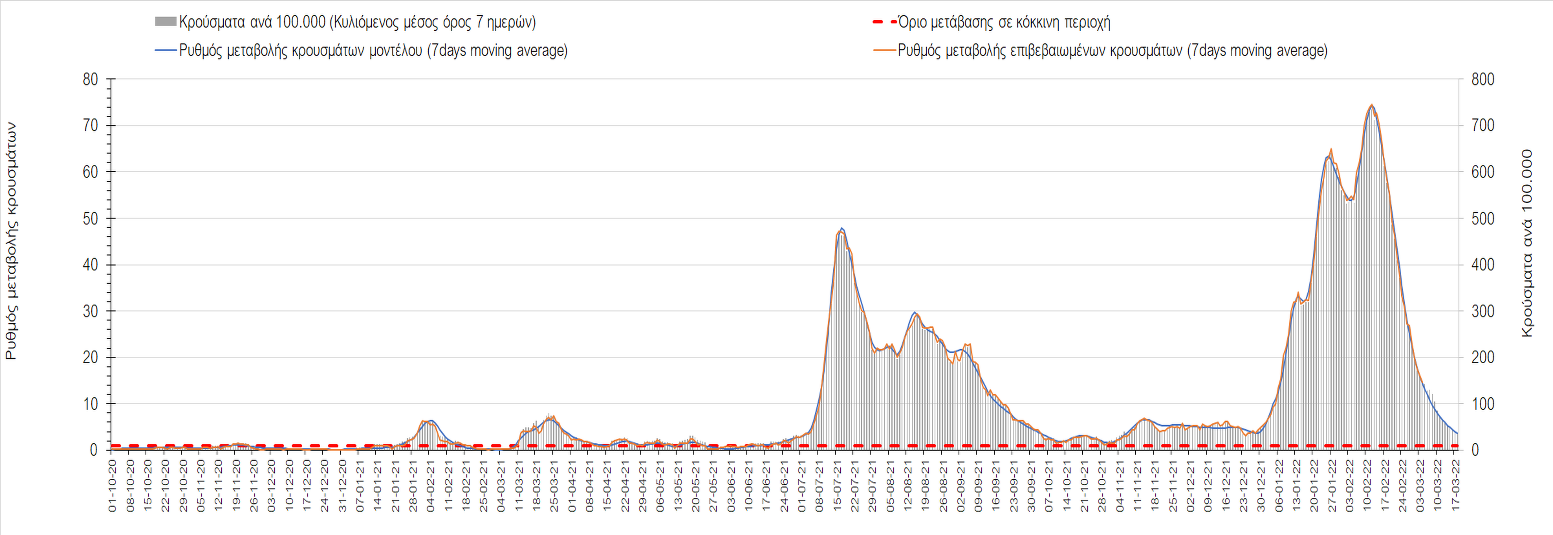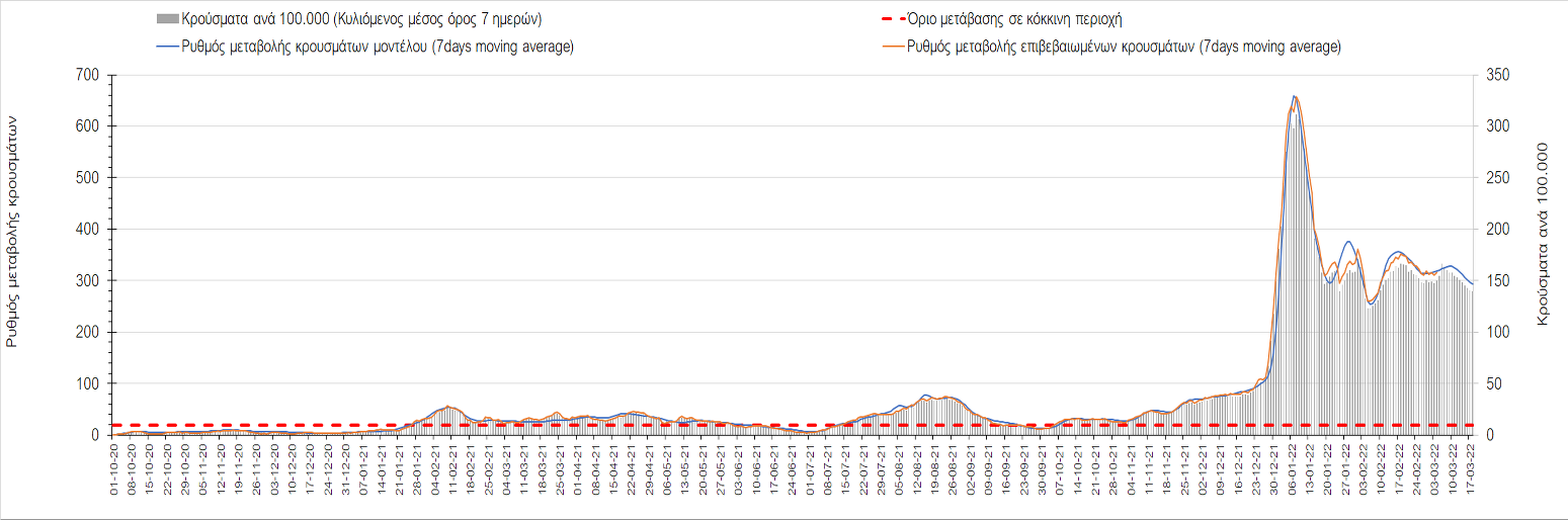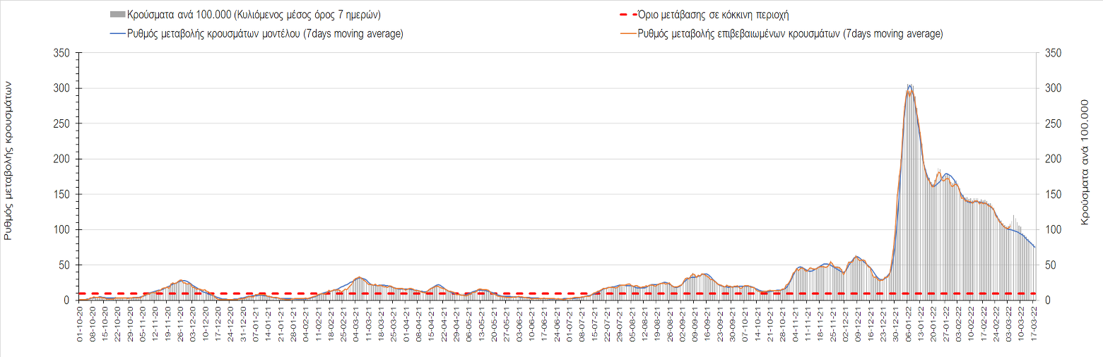 Δυστυχώς και πάλι παρατηρείται πολύ έντονη επιβράδυνση της αποκλιμάκωσης και φαίνεται να δημιουργείται προσωρινά σταθεροποιητική πορεία που αντικατοπτρίζεται και στον ημερήσιο αριθμό των κρουσμάτων (κυλιόμενος μέσος όρος 7 ημερών), ο οποίος παραμένει πάνω από τις 14.000 (14.421). Για να επανέλθει η ταχεία αποκλιμάκωση της πανδημίας, πέρα από την εφαρμογή των μέτρων (σε συνδυασμό με την σημαντική συνειδητοποίηση εκ μέρους του πληθυσμού ότι χρειάζεται προσοχή και σύνεση για την αντιμετώπιση της διασποράς της παραλλαγής Ο), θα πρέπει να στοχεύσουμε στη διατήρηση και την επέκταση της επίκτητης ανοσίας του πληθυσμού, αλλά και στον πολύ μεγάλο αριθμό των τεστ συνολικά (μοριακά, rapid και self-test) που πραγματοποιούνται καθημερινά, των οποίων ο αριθμός έχει φθάσει σε ημερήσια βάση τις 700.000. Αυτά σε συνδυασμό με τη φυσική ανοσία του πληθυσμού μετά από νόσηση, θα συντελέσουν στην συστηματική αποκλιμάκωση της πανδημίας. Αντίθετα, με τον υπάρχοντα ρυθμό εμβολιασμού αναμνηστικών δόσεων, έχει ήδη καθυστερήσει να επέλθει η πορεία αποκλιμάκωσης. Η τήρηση των μέτρων είναι ιδιαίτερα σημαντική, γιατί σε κάποιες περιοχές, λόγω της χαλάρωσης των μέτρων στην εστίαση, παρατηρείται επιβράδυνση του ρυθμού αποκλιμάκωσης, με ποιο έντονα τα φαινόμενα αυτά στο σύνολο της Κρήτης, στη Θεσσαλονίκη, αλλά και σε επιμέρους άλλες περιοχές. Παρόλο που η συνολική δυναμική της πανδημίας δε θα μπορούσε να αναστραφεί με τη δεδομένη ανοσία, αριθμό τεστ και μετεωρολογικές συνθήκες, χρειάζεται ακόμα σύνεση στην εφαρμογή των μέτρων για να αποφευχθεί περαιτέρω καθυστέρηση της συστηματικής αποκλιμάκωσης.