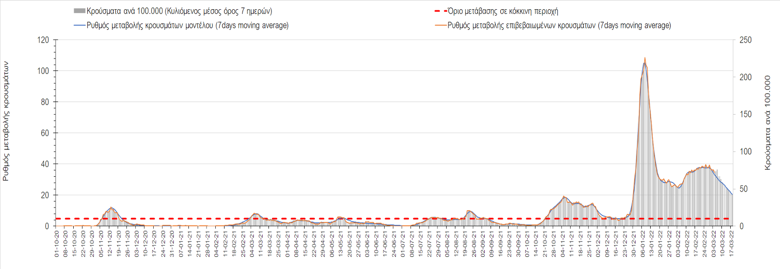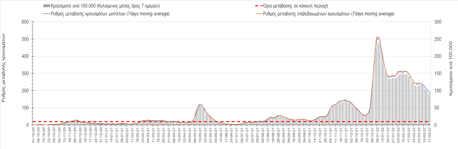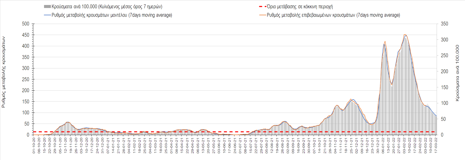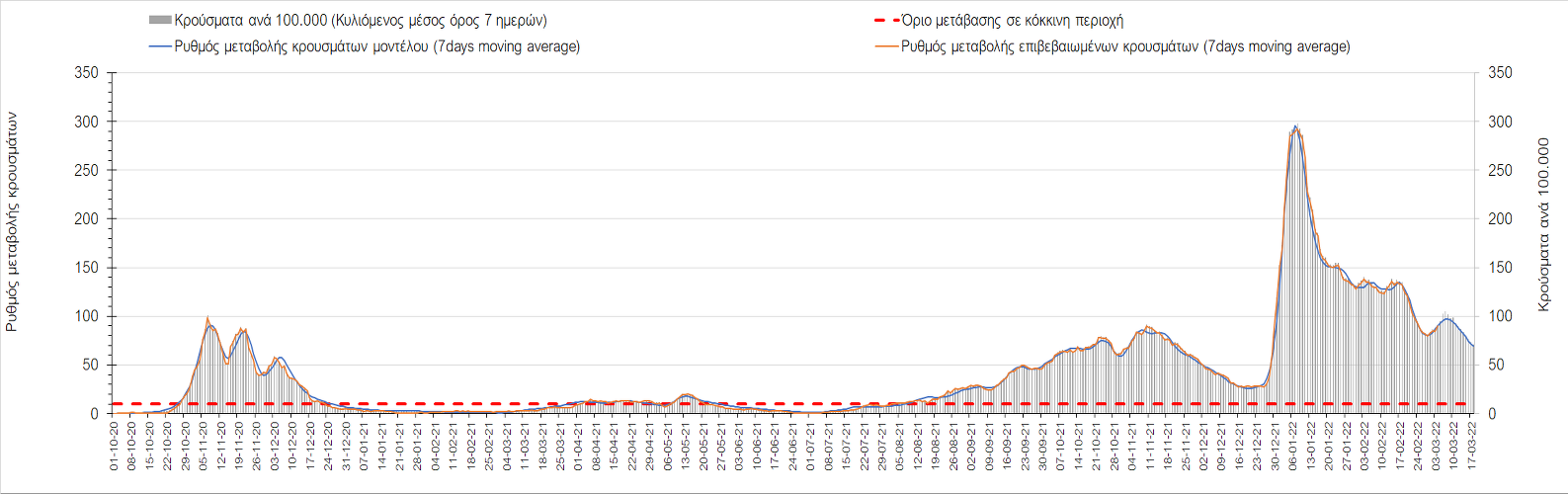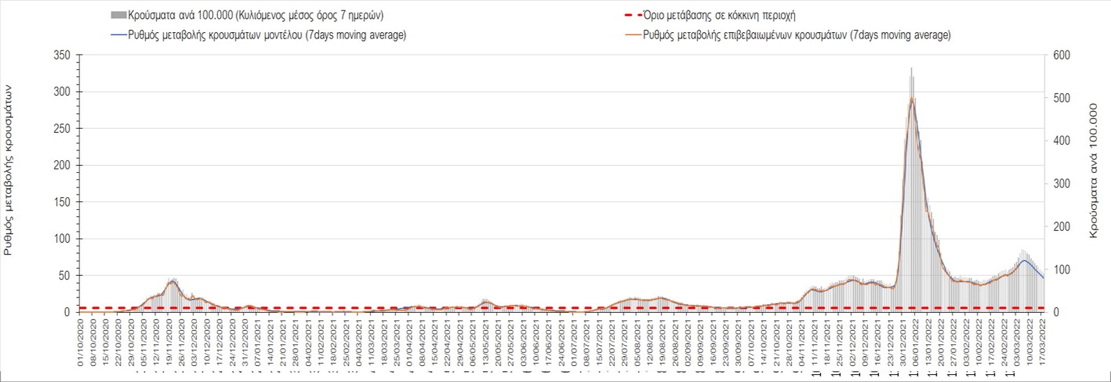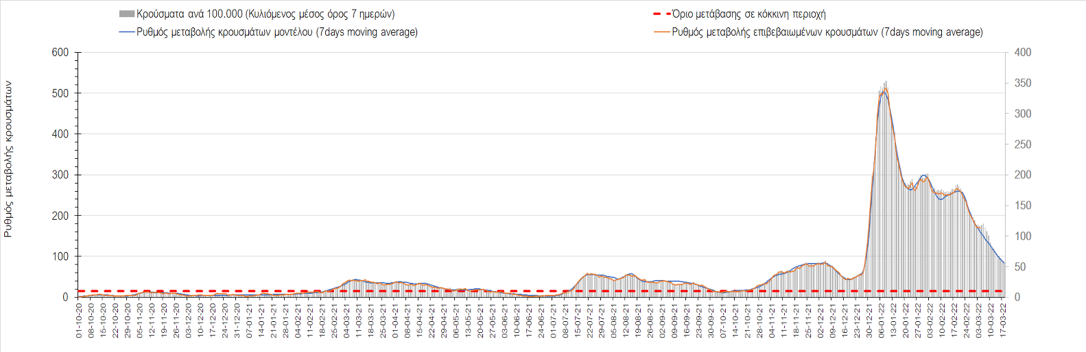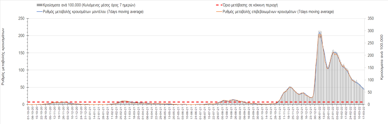 Δυστυχώς και πάλι παρατηρείται πολύ έντονη επιβράδυνση της αποκλιμάκωσης και φαίνεται να δημιουργείται προσωρινά σταθεροποιητική πορεία που αντικατοπτρίζεται και στον ημερήσιο αριθμό των κρουσμάτων (κυλιόμενος μέσος όρος 7 ημερών), ο οποίος παραμένει πάνω από τις 14.000 (14.421). Για να επανέλθει η ταχεία αποκλιμάκωση της πανδημίας, πέρα από την εφαρμογή των μέτρων (σε συνδυασμό με την σημαντική συνειδητοποίηση εκ μέρους του πληθυσμού ότι χρειάζεται προσοχή και σύνεση για την αντιμετώπιση της διασποράς της παραλλαγής Ο), θα πρέπει να στοχεύσουμε στη διατήρηση και την επέκταση της επίκτητης ανοσίας του πληθυσμού, αλλά και στον πολύ μεγάλο αριθμό των τεστ συνολικά (μοριακά, rapid και self-test) που πραγματοποιούνται καθημερινά, των οποίων ο αριθμός έχει φθάσει σε ημερήσια βάση τις 700.000. Αυτά σε συνδυασμό με τη φυσική ανοσία του πληθυσμού μετά από νόσηση, θα συντελέσουν στην συστηματική αποκλιμάκωση της πανδημίας. Αντίθετα, με τον υπάρχοντα ρυθμό εμβολιασμού αναμνηστικών δόσεων, έχει ήδη καθυστερήσει να επέλθει η πορεία αποκλιμάκωσης. Η τήρηση των μέτρων είναι ιδιαίτερα σημαντική, γιατί σε κάποιες περιοχές, λόγω της χαλάρωσης των μέτρων στην εστίαση, παρατηρείται επιβράδυνση του ρυθμού αποκλιμάκωσης, με ποιο έντονα τα φαινόμενα αυτά στο σύνολο της Κρήτης, στη Θεσσαλονίκη, αλλά και σε επιμέρους άλλες περιοχές. Παρόλο που η συνολική δυναμική της πανδημίας δε θα μπορούσε να αναστραφεί με τη δεδομένη ανοσία, αριθμό τεστ και μετεωρολογικές συνθήκες, χρειάζεται ακόμα σύνεση στην εφαρμογή των μέτρων για να αποφευχθεί περαιτέρω καθυστέρηση της συστηματικής αποκλιμάκωσης.