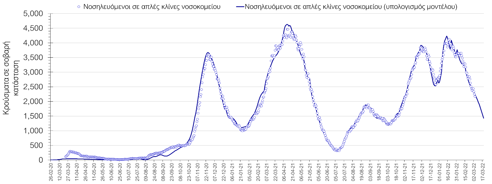 Σχήμα 2. Αριθμός κρουσμάτων σε σοβαρή κατάσταση (νοσηλευόμενοι σε απλές κλίνες) σύμφωνα με τα στοιχεία του ΕΟΔΥ και τις προβλέψεις της υπολογιστικής πλατφόρμας CORE.