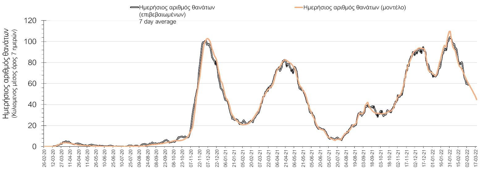 Σχήμα 3. Αριθμός θανάτων (κυλιόμενος μέσος όρος 7 ημερών) σύμφωνα με τα στοιχεία του ΕΟΔΥ και τις προβλέψεις της υπολογιστικής πλατφόρμας CORE.