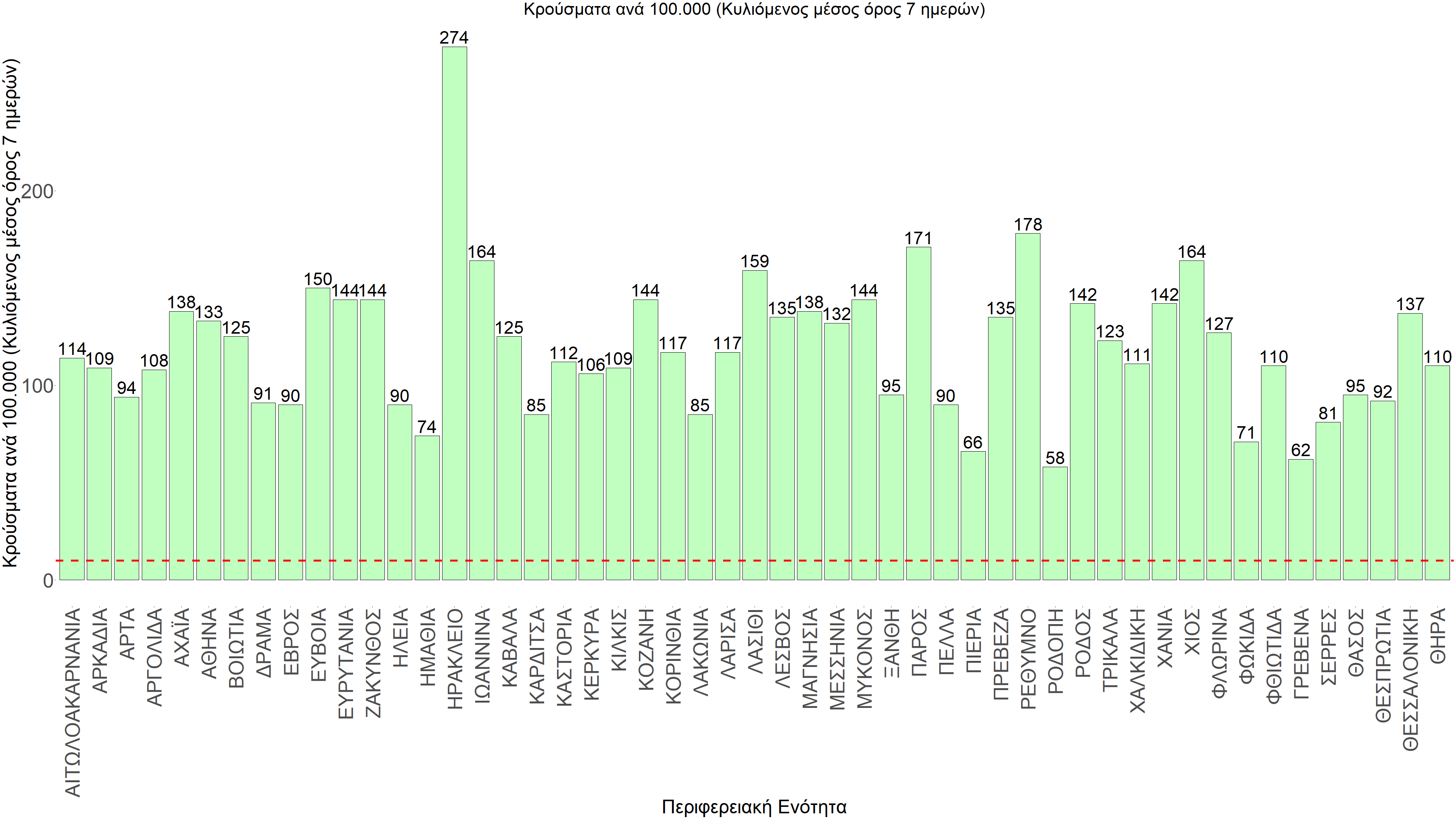 Σχήμα 60. Συγκεντρωτική εικόνα των νέων κρουσμάτων ανά 100.000 κατοίκους (κυλιόμενος μέσος όρος 7 ημερών) των επιμέρους περιοχών