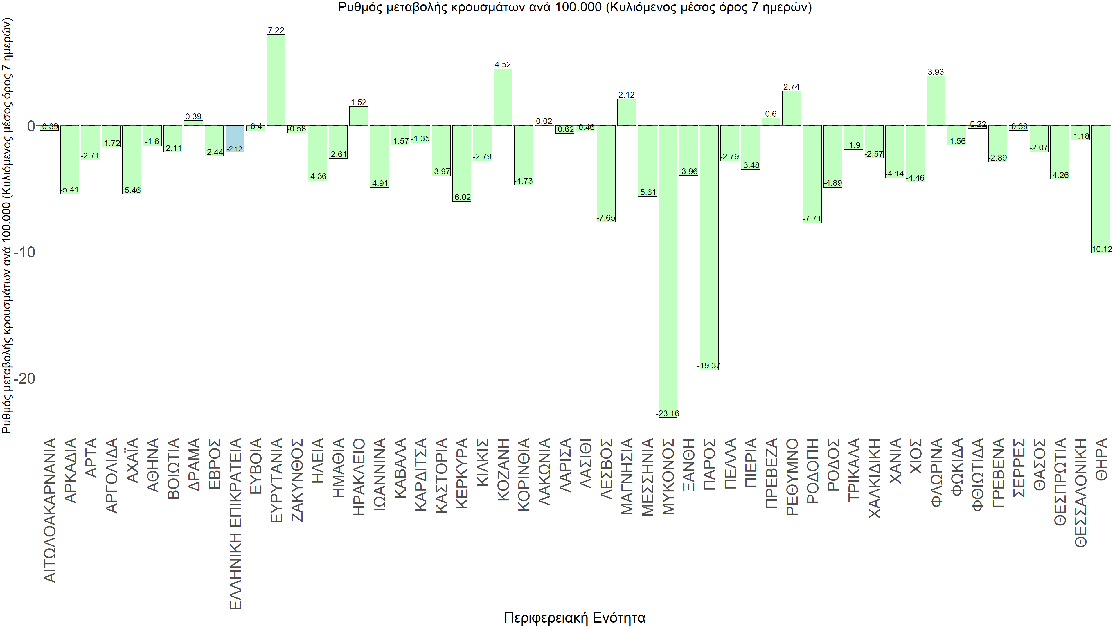 Η αποτύπωση των τάσεων στις επιμέρους περιοχές, παρουσιάζεται στο Σχήμα 61, όπου παρουσιάζεται ο ρυθμός μεταβολής των νέων κρουσμάτων ανά 100.000 κατοίκους (κυλιόμενος μέσος όρος 7 ημερών) των επιμέρους περιοχών. Θετικές τιμές του ρυθμού μεταβολής υποδηλώνουν άνοδο, ενώ αρνητικές τιμές υποδηλώνουν πτωτική πορεία.