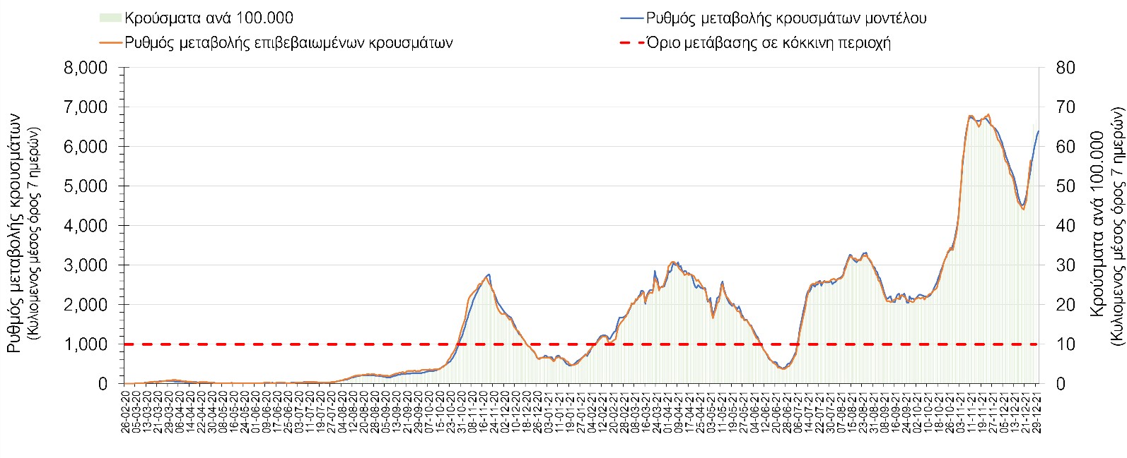 Η πορεία της μέσης εβδομαδιαίας τιμής των κρουσμάτων, καθώς και του κυλιόμενου μέσου όρου 7 ημερών του αριθμού των κρουσμάτων ανά 100.000 πληθυσμού, όπως έχουν καταγραφεί από τον ΕΟΔΥ και η αναμενόμενη πορεία τους όπως προδιαγράφεται από την υπολογιστική πλατφόρμα CORE για την Ελληνική επικράτεια μέχρι τις 31 Δεκεμβρίου, αποτυπώνονται στο Σχήμα 4. Αυτή η προβλεπόμενη πορεία, που αφορά τα κρούσματα, τους νοσηλευόμενους σε απλές κλίνες, όσο και σε ΜΕΘ, καθώς επίσης και τους θανάτους, βασίζεται στις ακόλουθες παραδοχές: