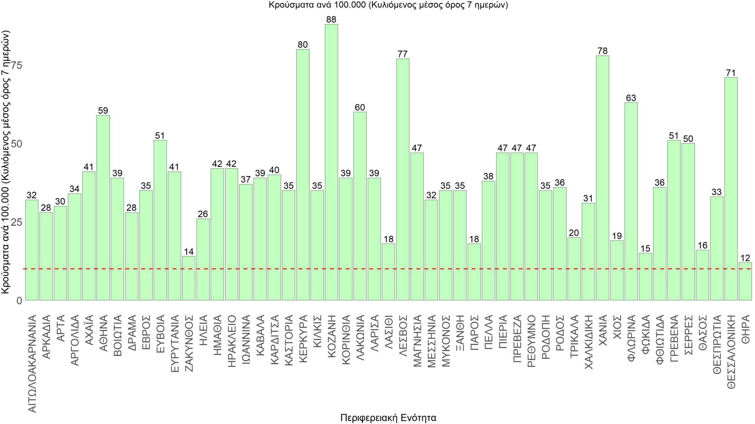 Η αποτύπωση των τάσεων στις επιμέρους περιοχές, παρουσιάζεται στο Σχήμα 61, όπου παρουσιάζεται ο ρυθμός μεταβολής των νέων κρουσμάτων ανά 100.000 κατοίκους (κυλιόμενος μέσος όρος 7 ημερών) των επιμέρους περιοχών. Θετικές τιμές του ρυθμού μεταβολής υποδηλώνουν άνοδο, ενώ αρνητικές τιμές υποδηλώνουν πτωτική πορεία. Το σχήμα αυτό είναι ιδιαίτερα κατατοπιστικό, γιατί οι τιμές που παρουσιάζονται είναι κανονικοποιημένες ως προς τον πληθυσμό, και η σύγκριση των τάσεων ανάμεσα στις επιμέρους περιοχές είναι άμεση.