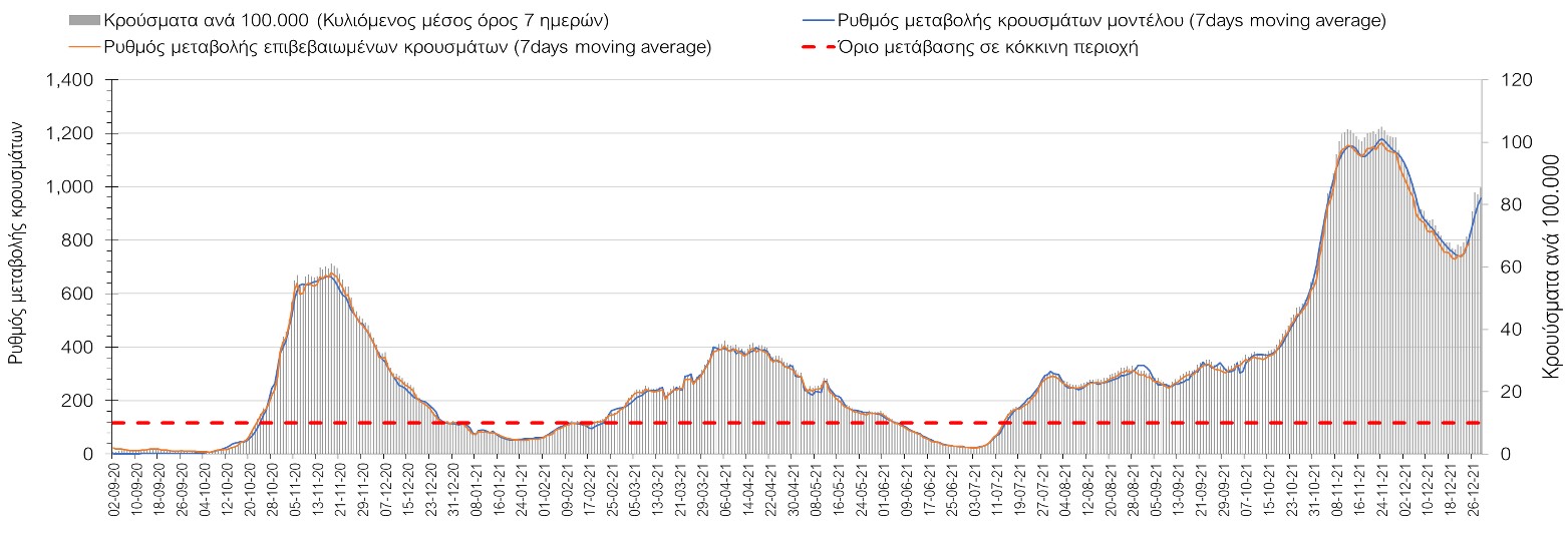 Συμπεράσματα: Με βάση τα χθεσινά αποτελέσματα, σε σχέση με την Παρασκευή, έχουμε χαμηλότερο τόσο τον αριθμό των ασθενών σε κρίσιμη κατάσταση (διασωληνωμένοι σε ΜΕΘ), όσο και των θανάτων από COVID-19. Σε πανελλαδικό επίπεδο ο κυλιόμενος εβδομαδιαίος μέσος όρος του δείκτη θετικότητας διαμορφώθηκε στο 4,5% (η ημερήσια τιμή το Σάββατο είναι 1,5%) ενώ ο κυλιόμενος εβδομαδιαίος μέσος όρος του πραγματικού αριθμού αναπαραγωγής Rt (δηλαδή ο αριθμός των ατόμων που ένας φορέας μπορεί να επιμολύνει) αυξήθηκε σημαντικά στο 1,17 (Rt πάνω από τη μονάδα υποδηλώνει καθαρή αύξηση της διασποράς του ιού στην κοινότητα). Στις 23/12/21 ξεκίνησε και επίσημα το 5ο κύμα της πανδημίας στην Ελλάδα λόγω της ταχείας αρχούμενης διασποράς του στελέχους Ο του SARS-CoV-2.
